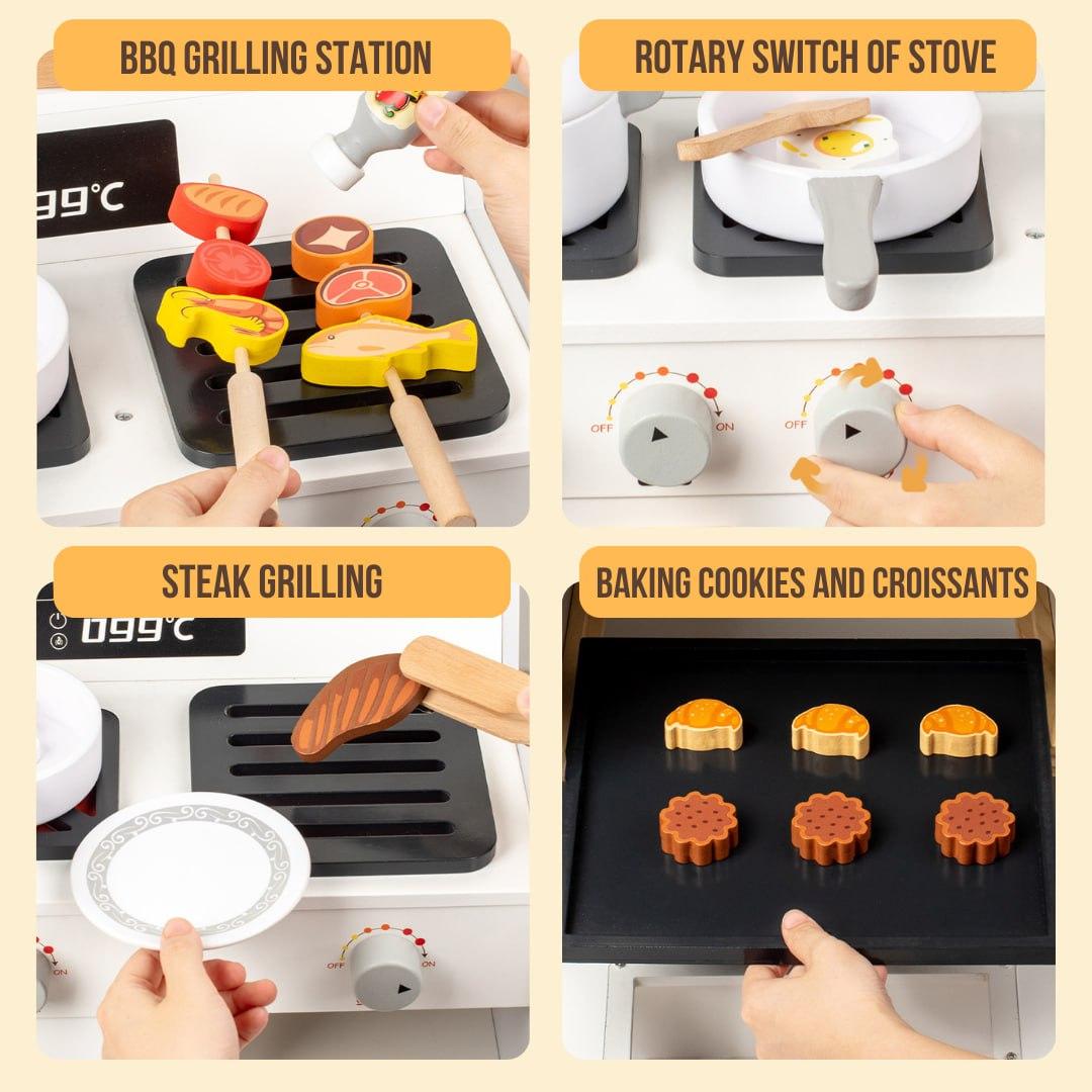 A stove, oven, and grill, as well as wooden skewers, pots, and toy food, make for a delightful culinary experience.