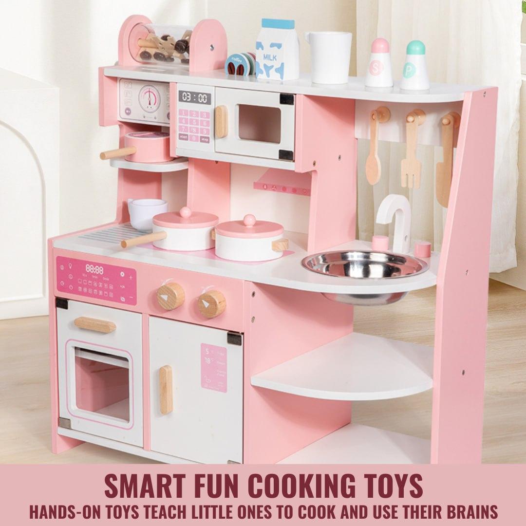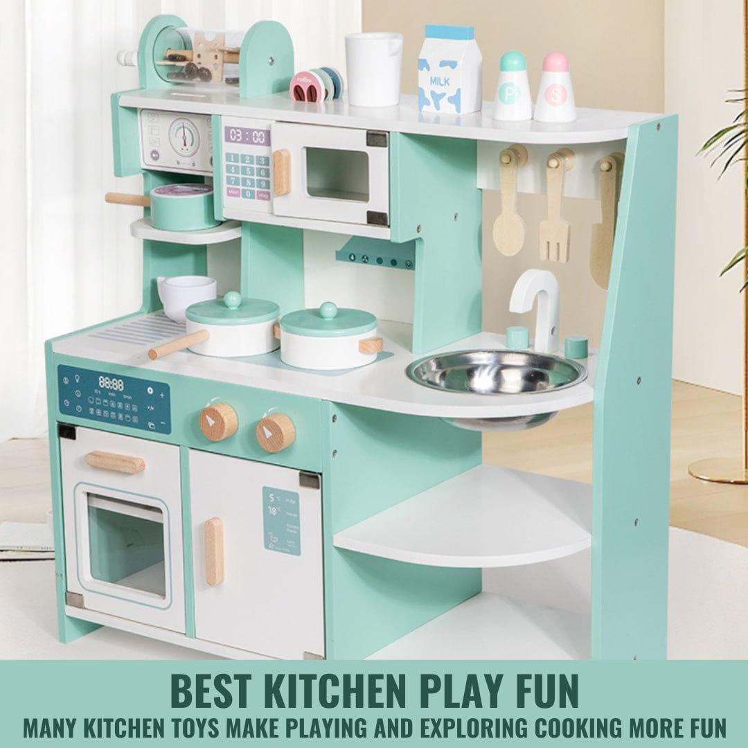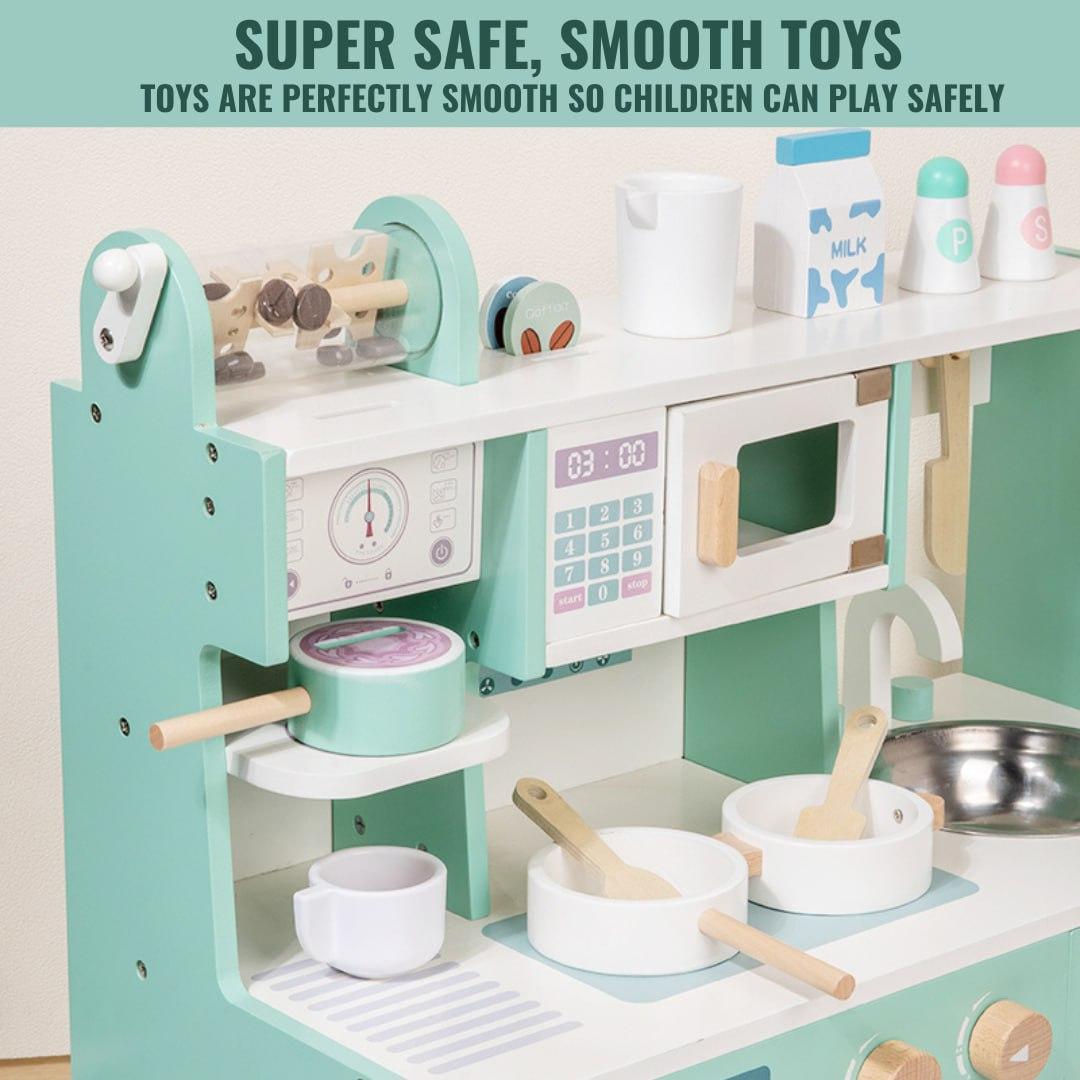 • Complete wooden kitchen playset featuring a stove, oven, microwave, sink, cookware, and utensils for realistic pretend cooking.