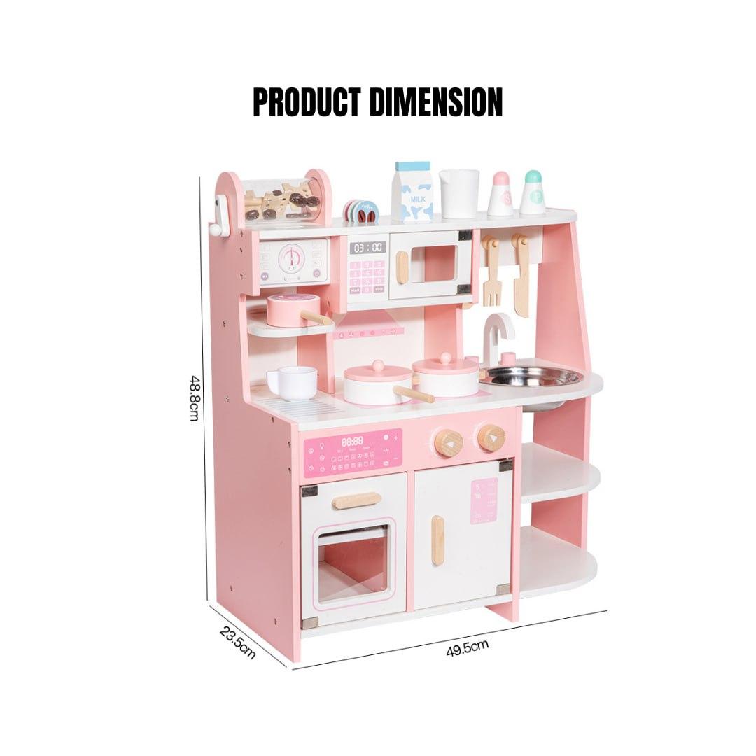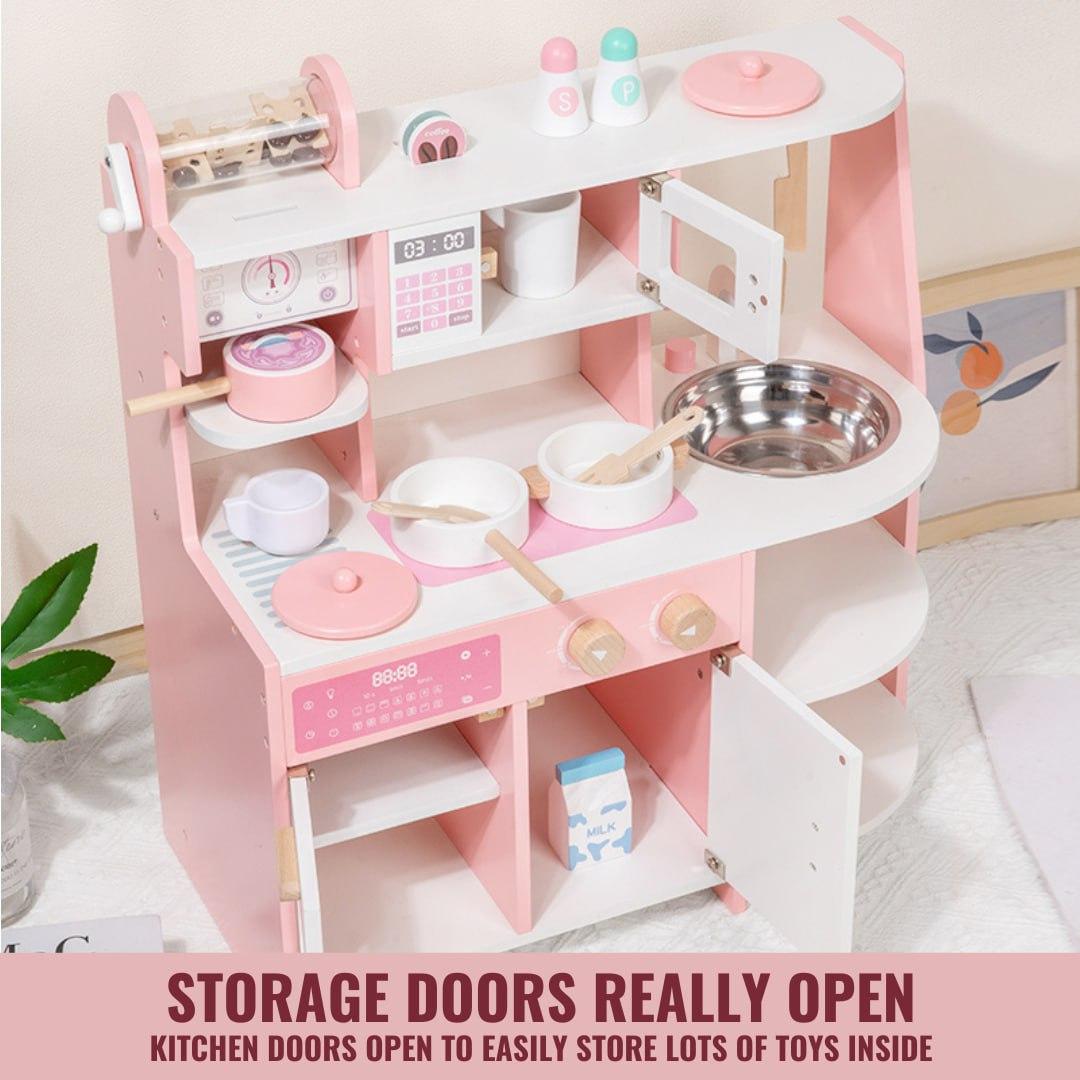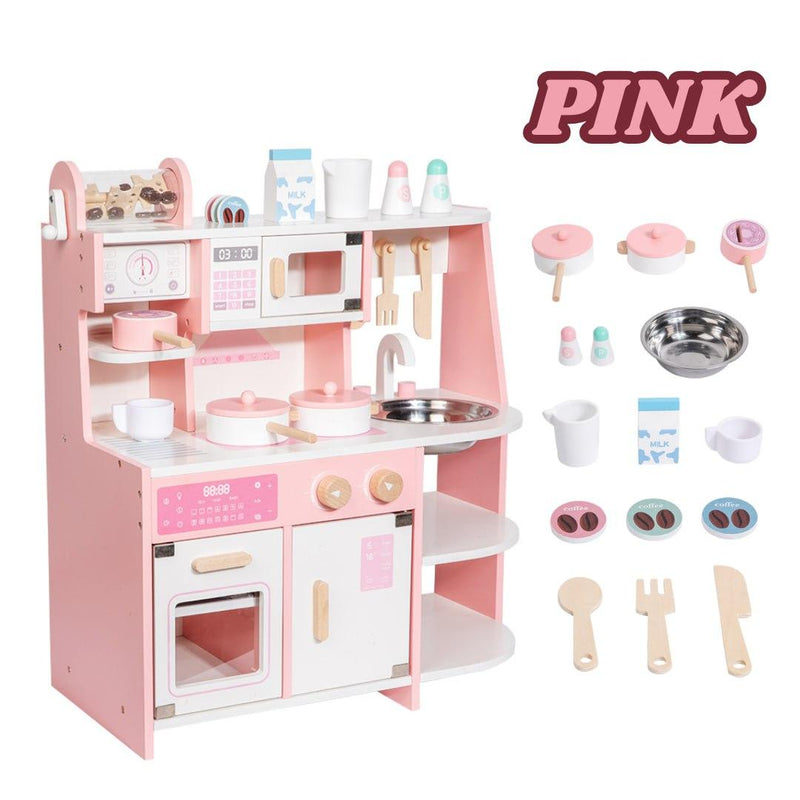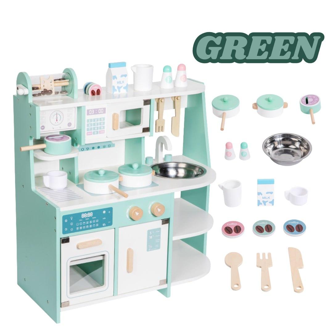 • Complete wooden kitchen playset featuring a stove, oven, microwave, sink, cookware, and utensils for realistic pretend cooking.