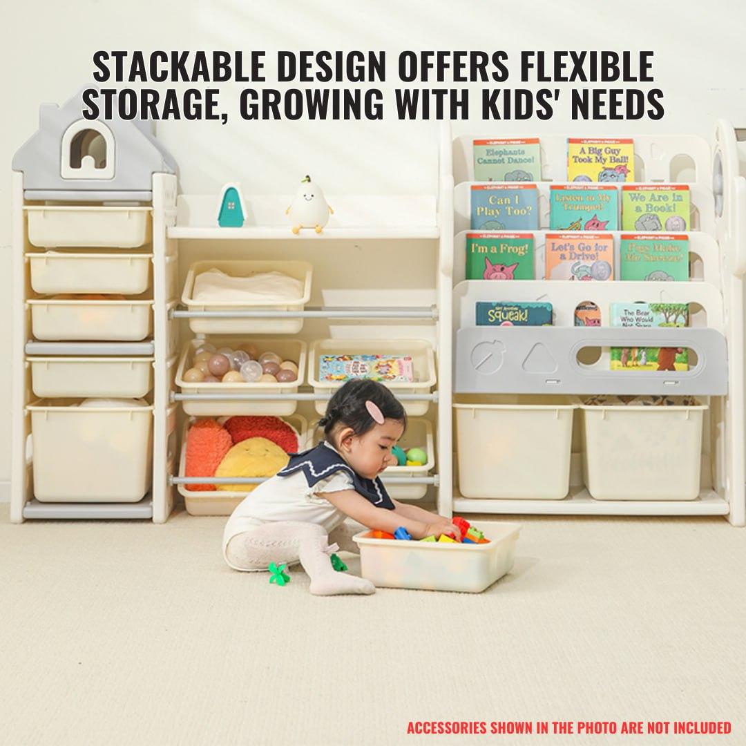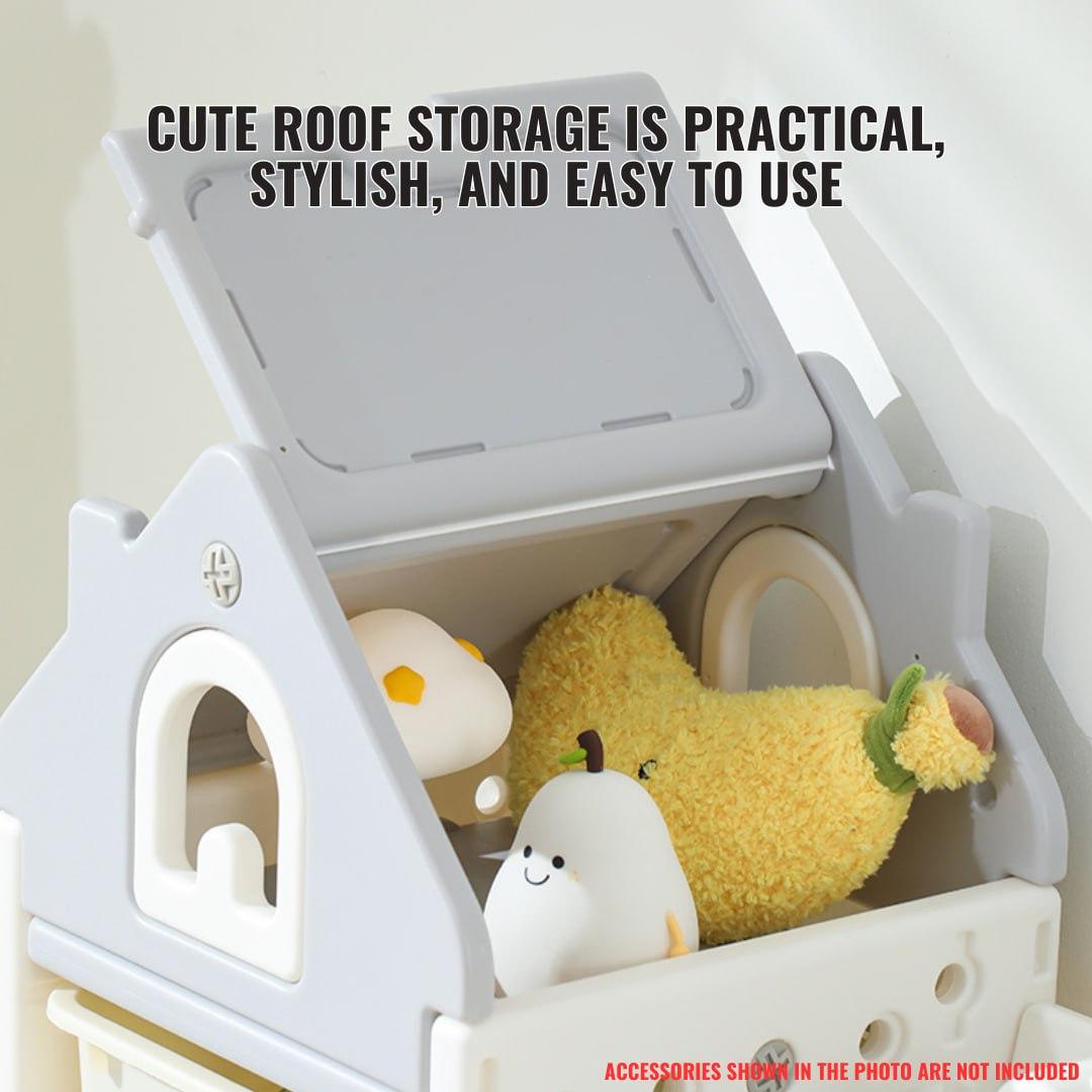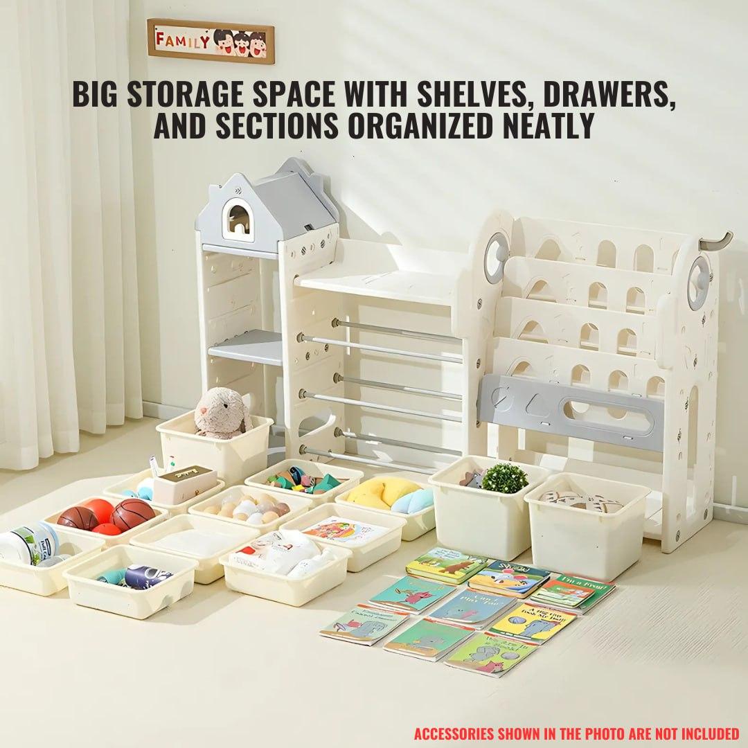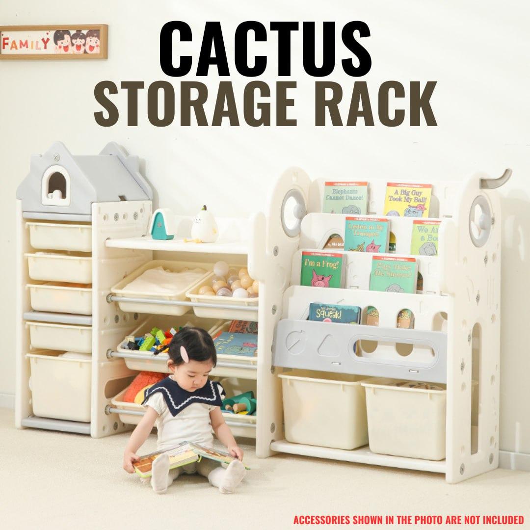 The Cactus Storage Rack uses open shelves, bins, and book racks to neatly arrange toys, books, and supplies, making it ideal for children's playrooms or nurseries.