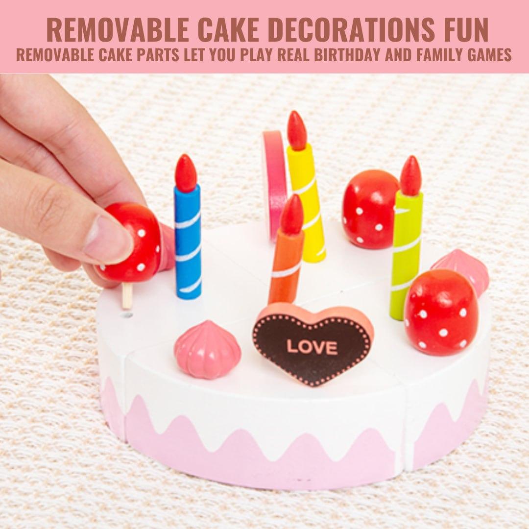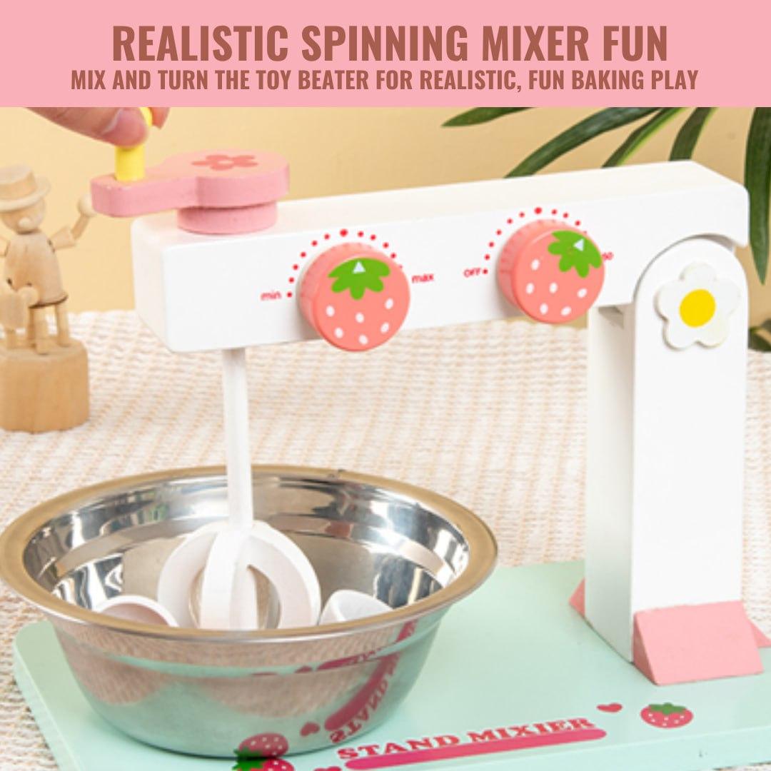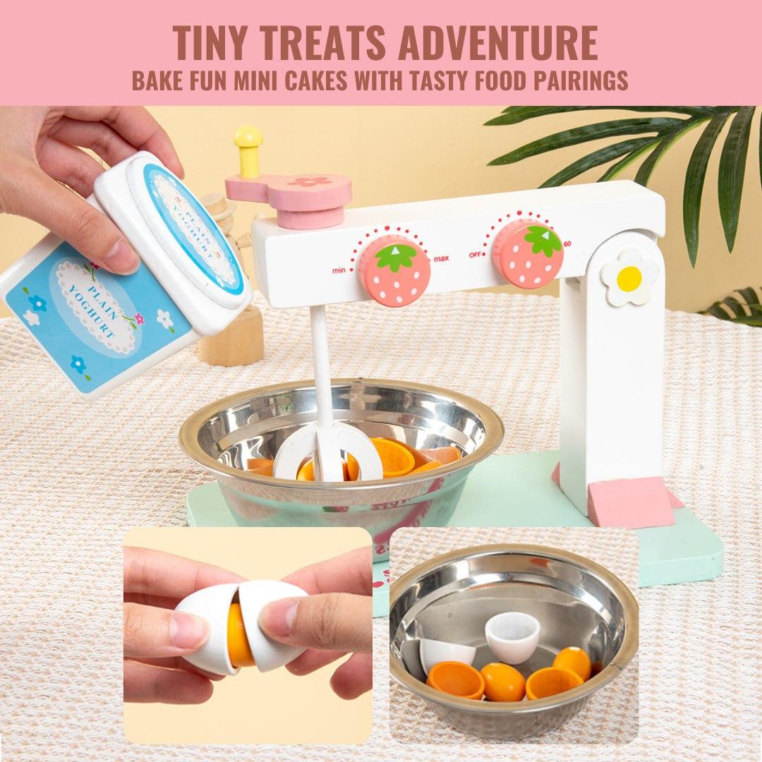 • Complete wooden kitchen playset featuring an egg-breaking mixer, scale, cake pieces, and pretend ingredients for realistic role play.
