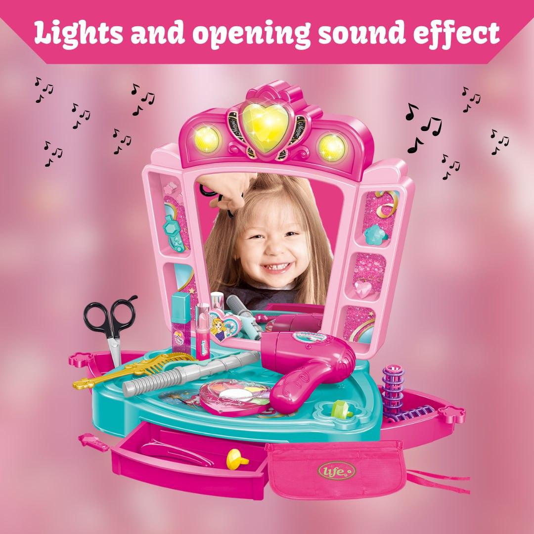 This delightful set includes everything a genuine salon uses, so your little girl may be a makeup artist, hairdresser, or nail artist with this playset. All of the accessories in this entertaining cosmetic game are realistically made.