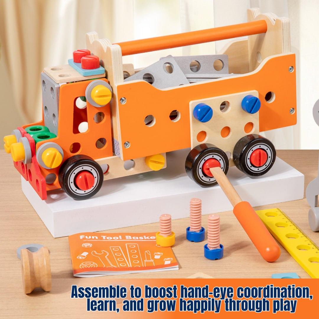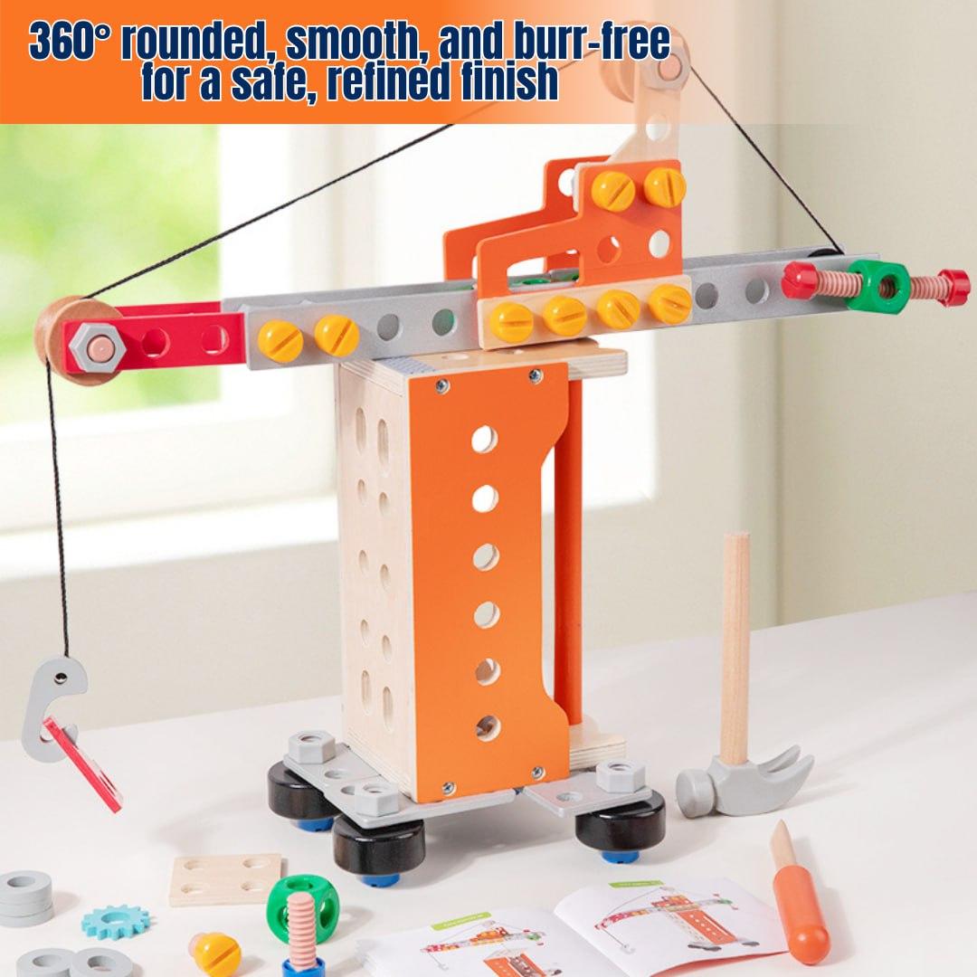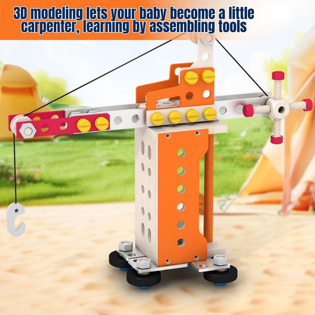 This children's tool set comprises 138 wooden DIY pieces with rounded edges, comprising fundamental shapes such as trucks, robots, cranes, and over 100 more shaping games.