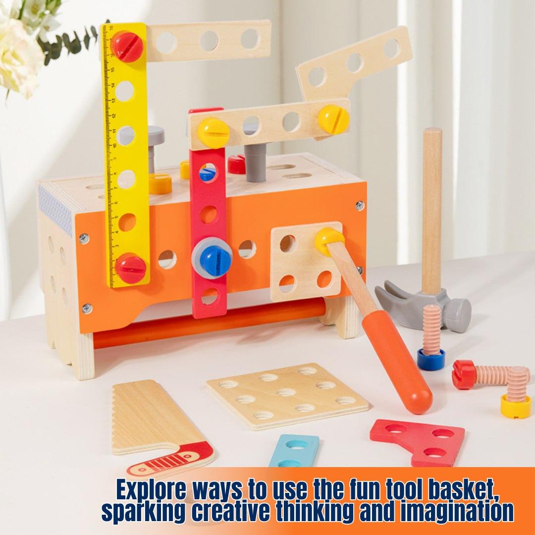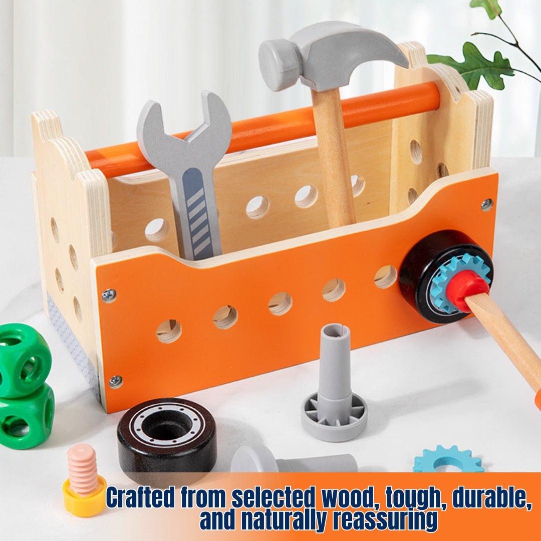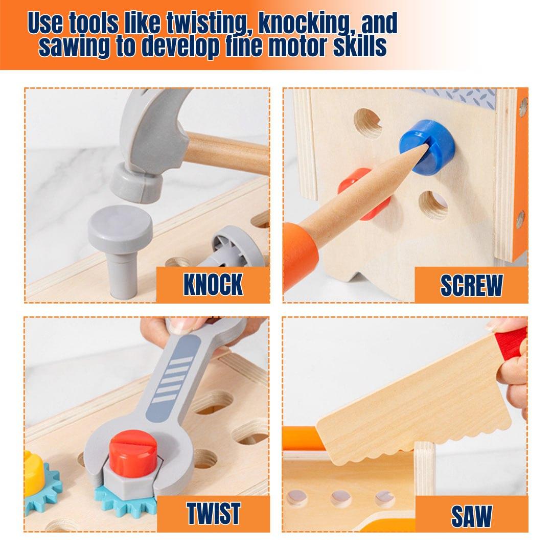 This children's tool set comprises 138 wooden DIY pieces with rounded edges, comprising fundamental shapes such as trucks, robots, cranes, and over 100 more shaping games.