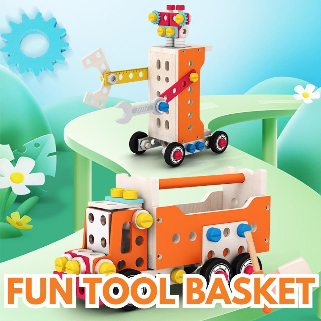 This children's tool set comprises 138 wooden DIY pieces with rounded edges, comprising fundamental shapes such as trucks, robots, cranes, and over 100 more shaping games. During playtime, all built...