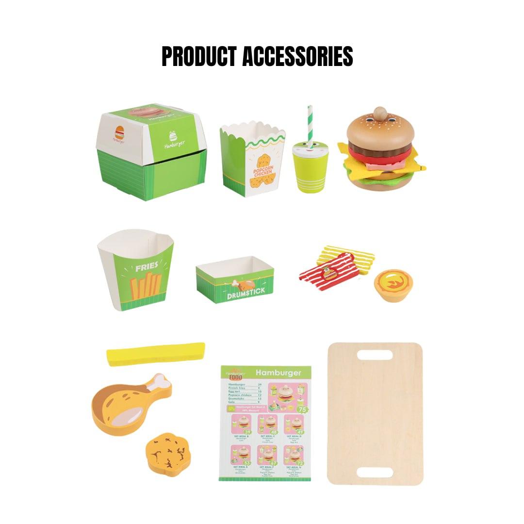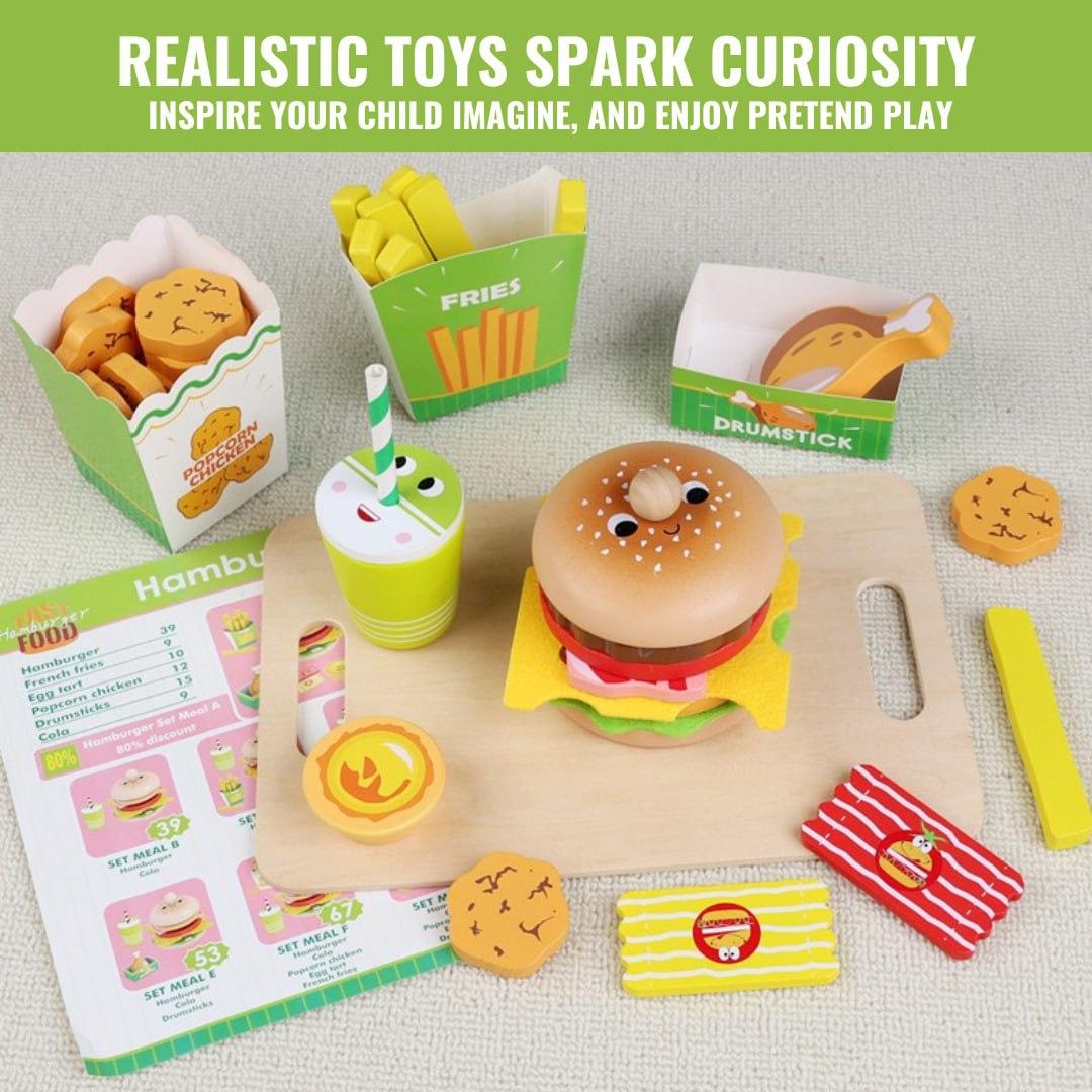 Fun and realistic wooden fast food set featuring burger, fries, drink, and more for imaginative playtime.