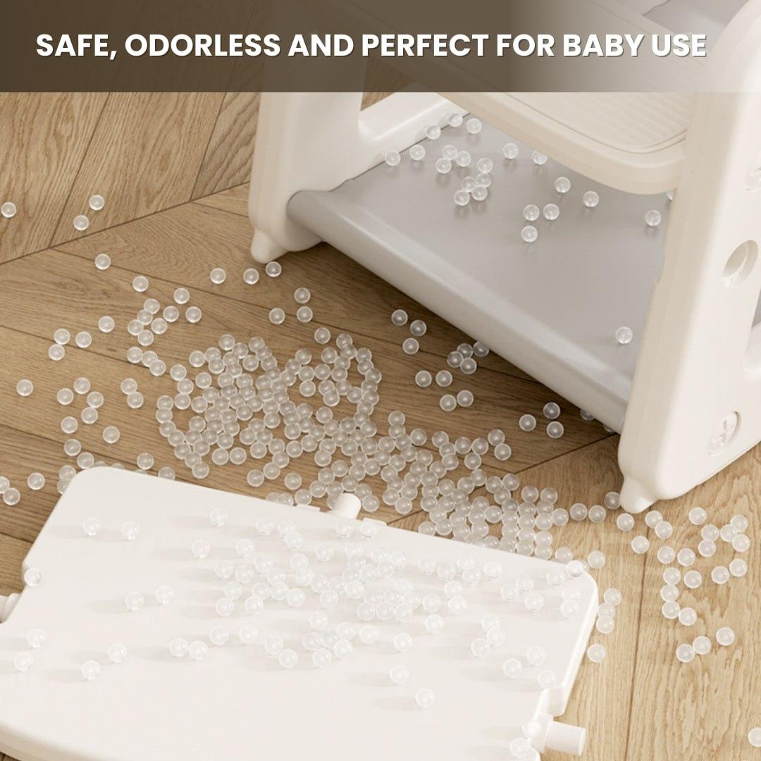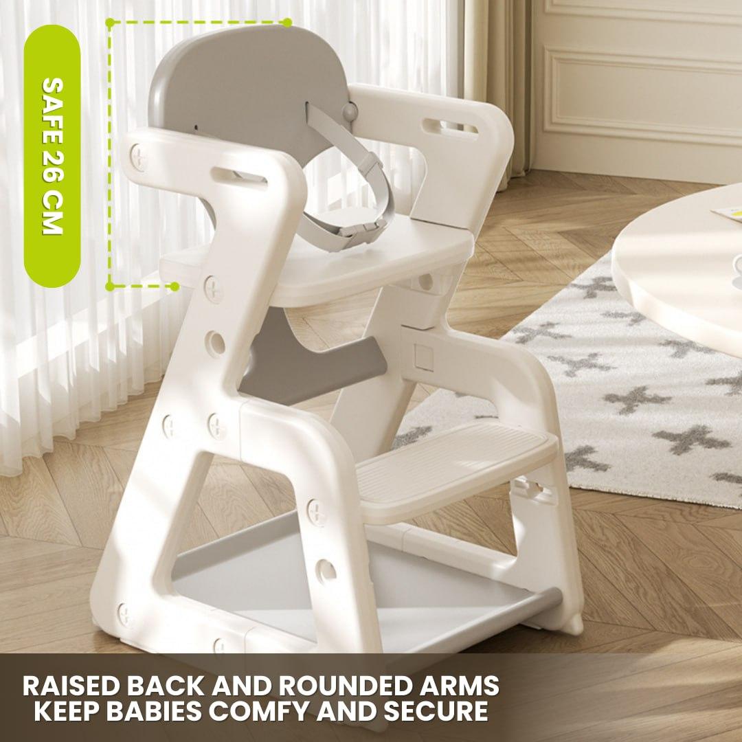 The chair is made of high-quality, non-toxic materials with rounded edges and a secure harness system, ensuring safety and durability for daily usage.