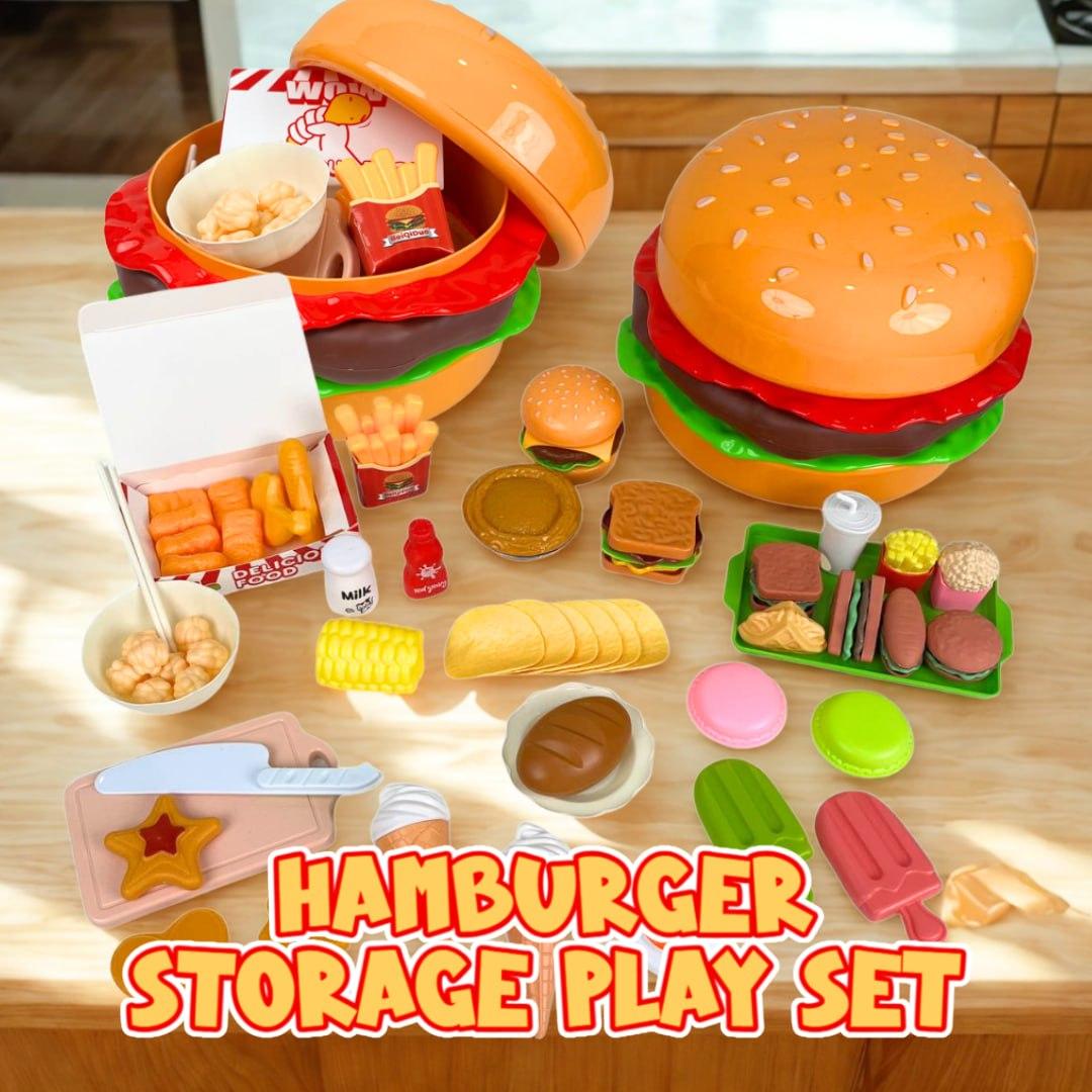 Fun hamburger-shaped storage case filled with assorted pretend food, snacks, and kitchen accessories for role-playing. Encourages imaginative play, creativity, and social interaction as kids pretend to cook, serve, and enjoy...