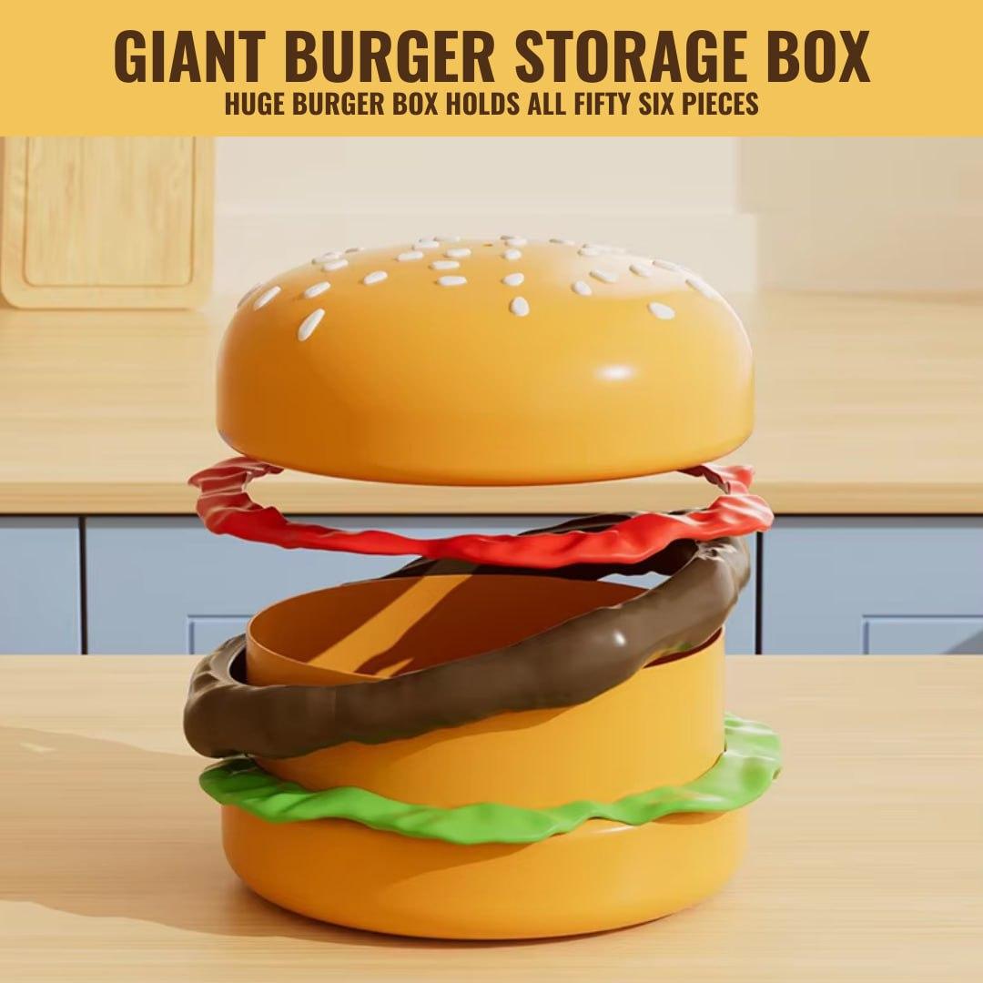 Fun hamburger-shaped storage case filled with assorted pretend food, snacks, and kitchen accessories for role-playing.