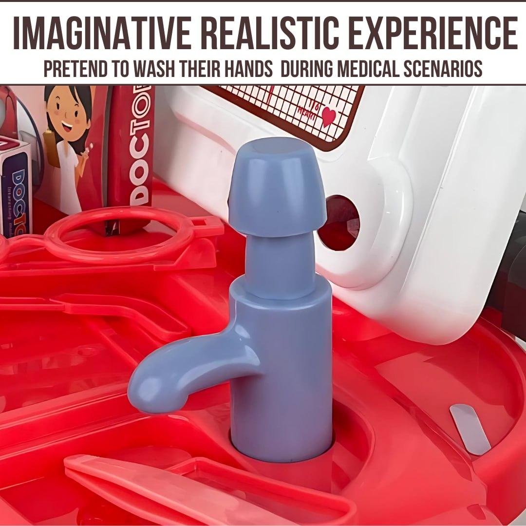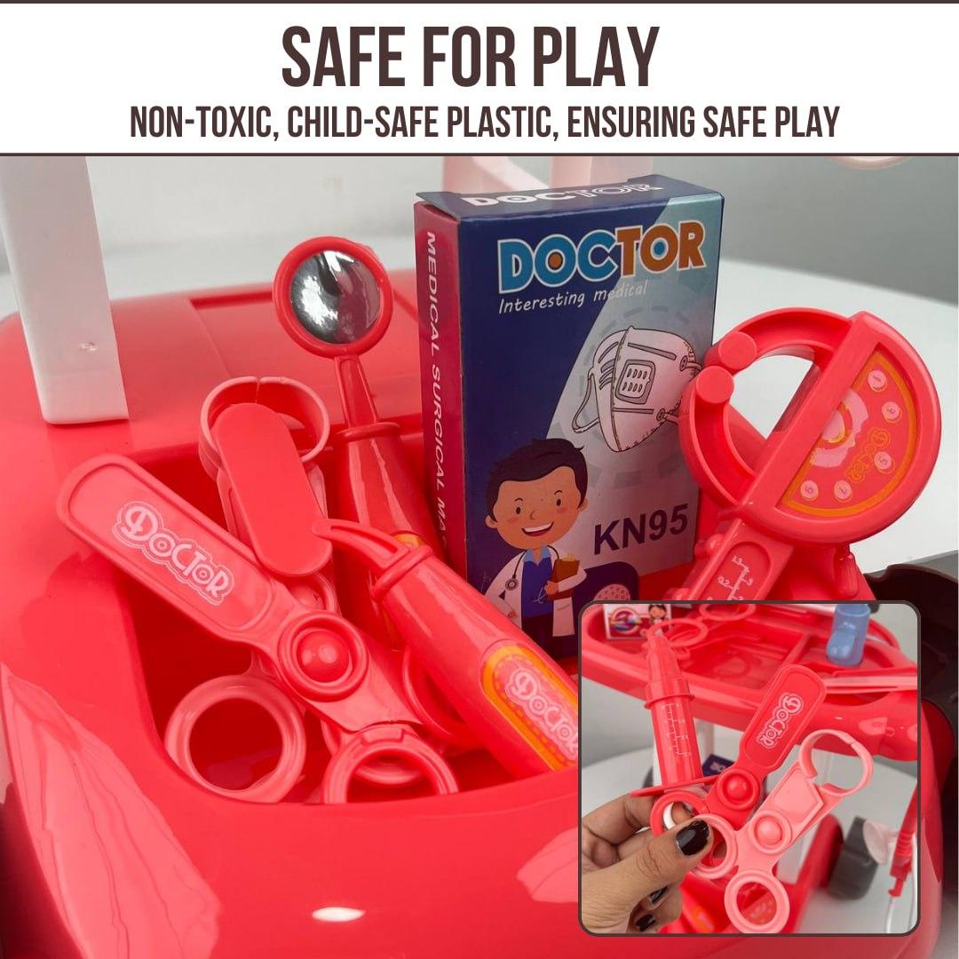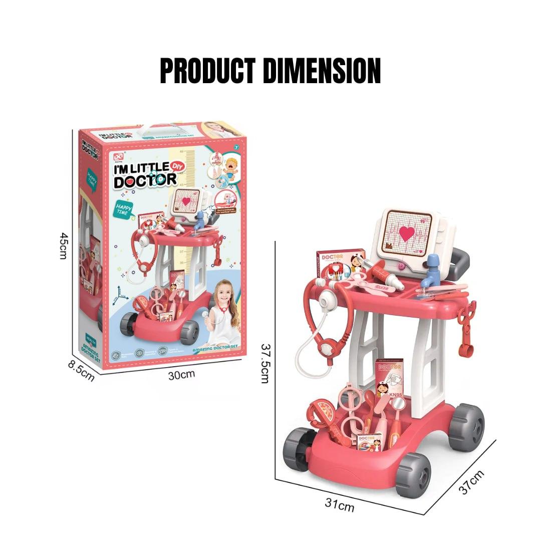 The Interactive Doctor Playset includes a mobile medical cart with instruments such as stethoscopes, scissors, syringes, and a monitor that simulates a genuine doctor's experience.