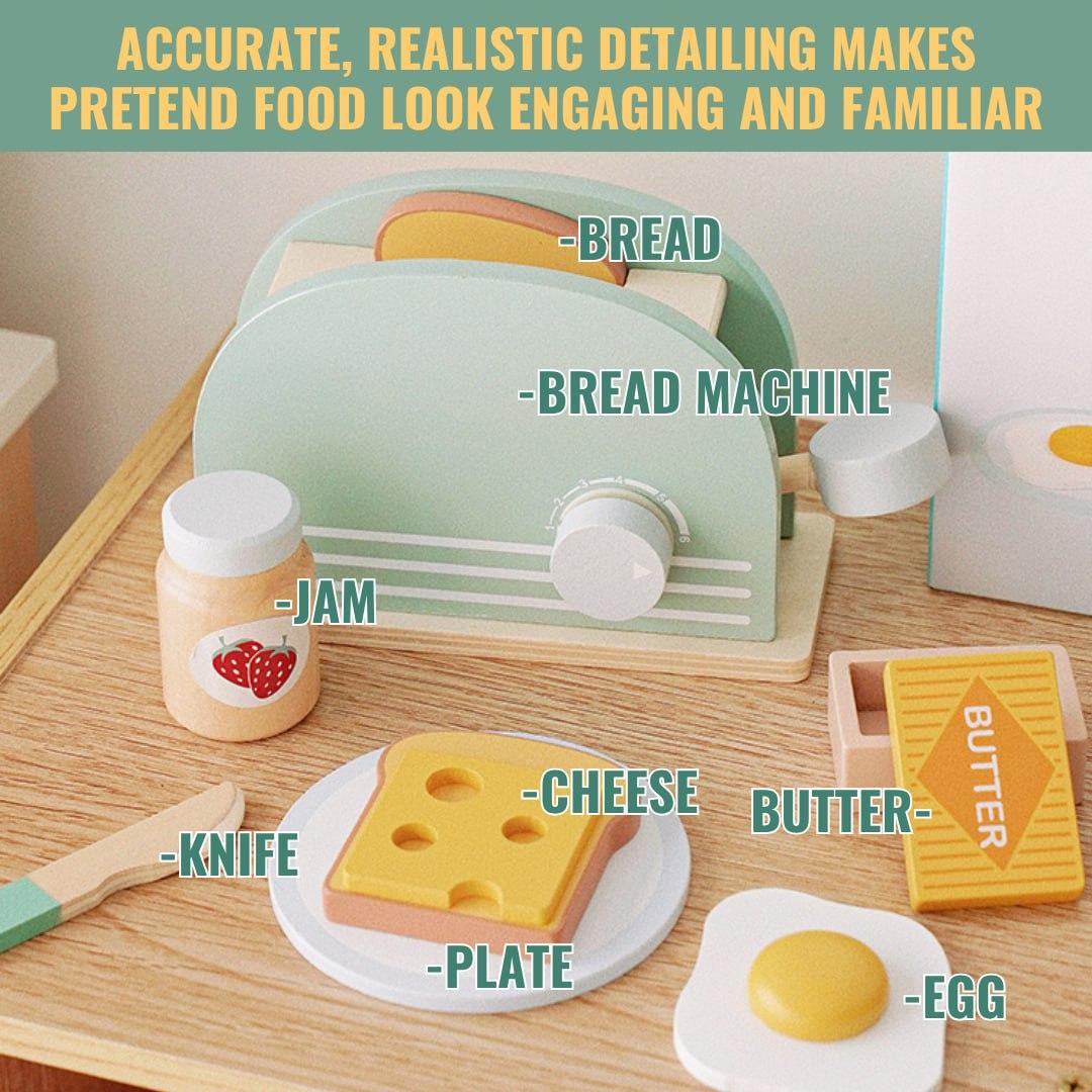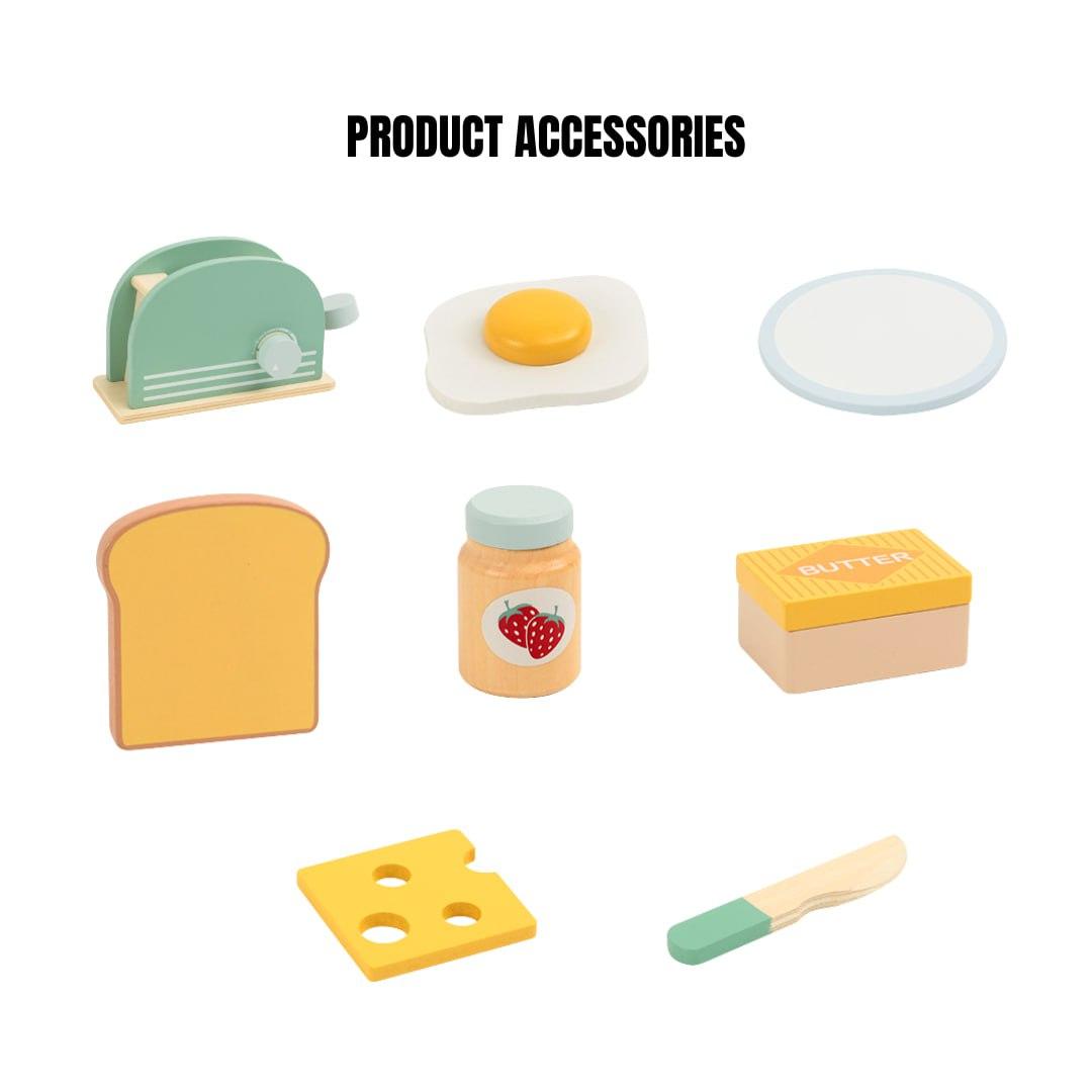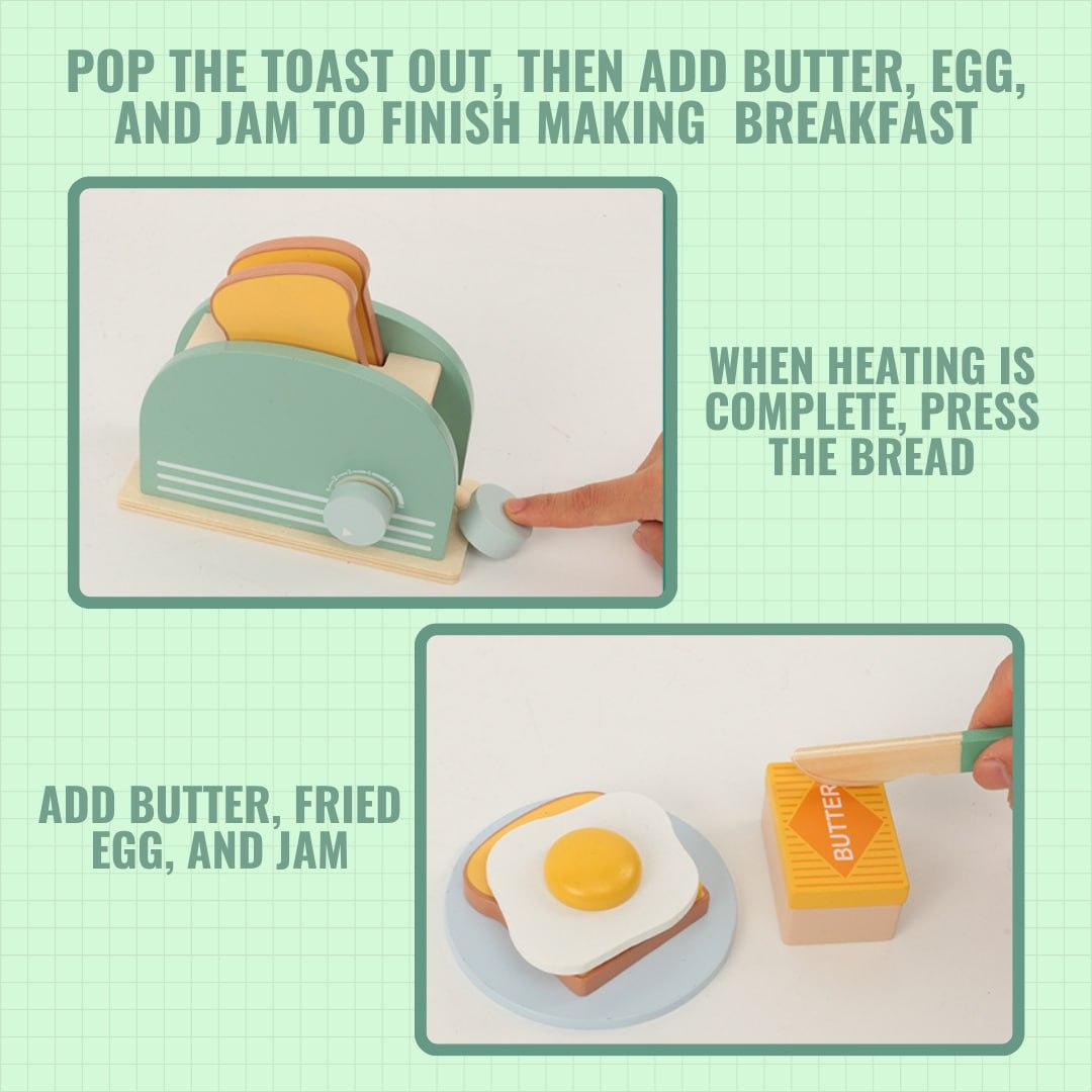 Start every play morning right with this adorable wooden bread maker set complete with toaster, butter, jam, and egg.