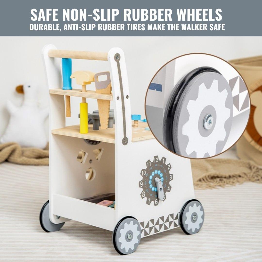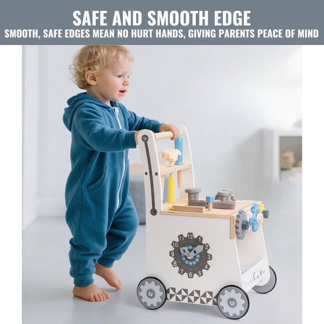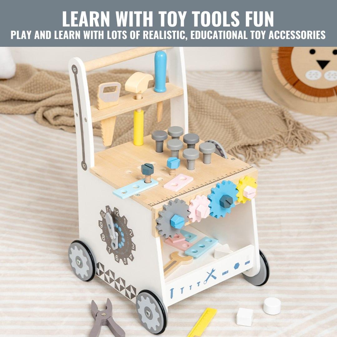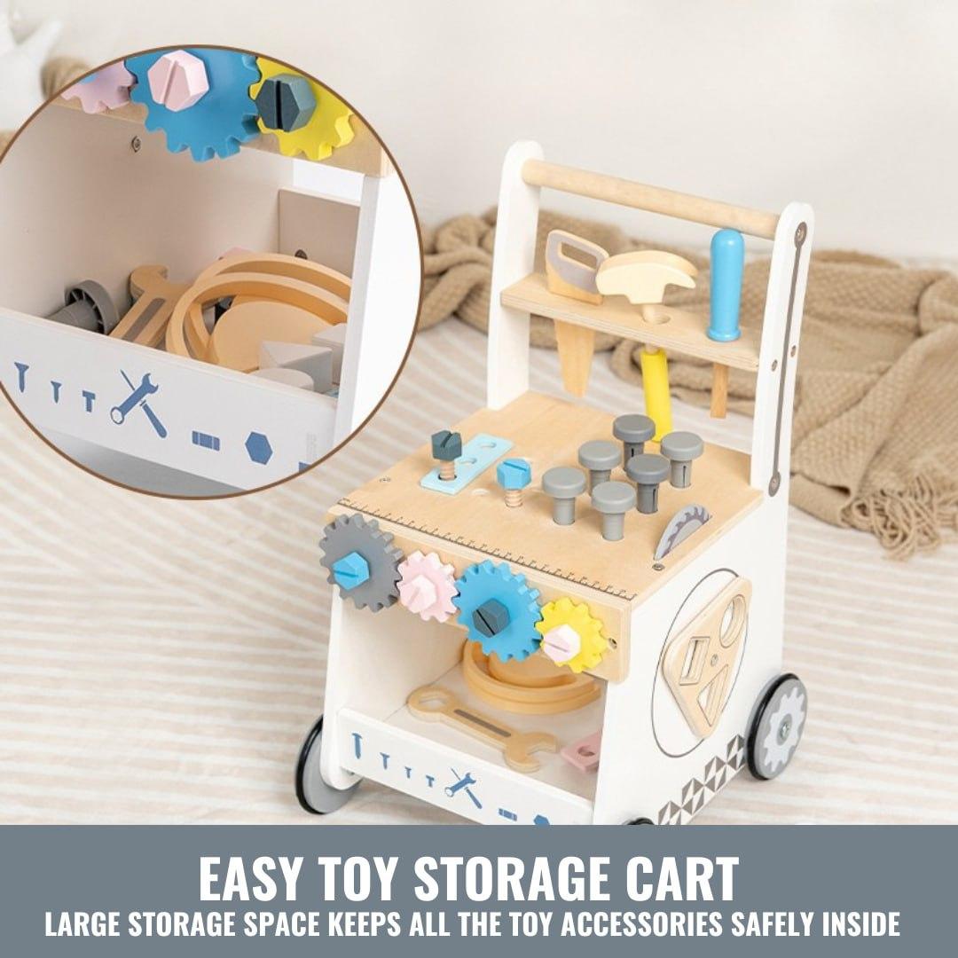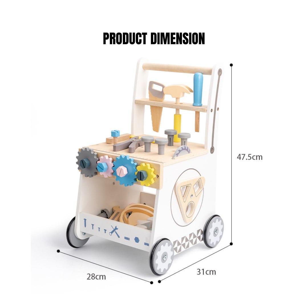 Built with sturdy, child-friendly materials and a stable push-cart structure, making it a functional play companion that supports both pretend workshop activities and early walking confidence.