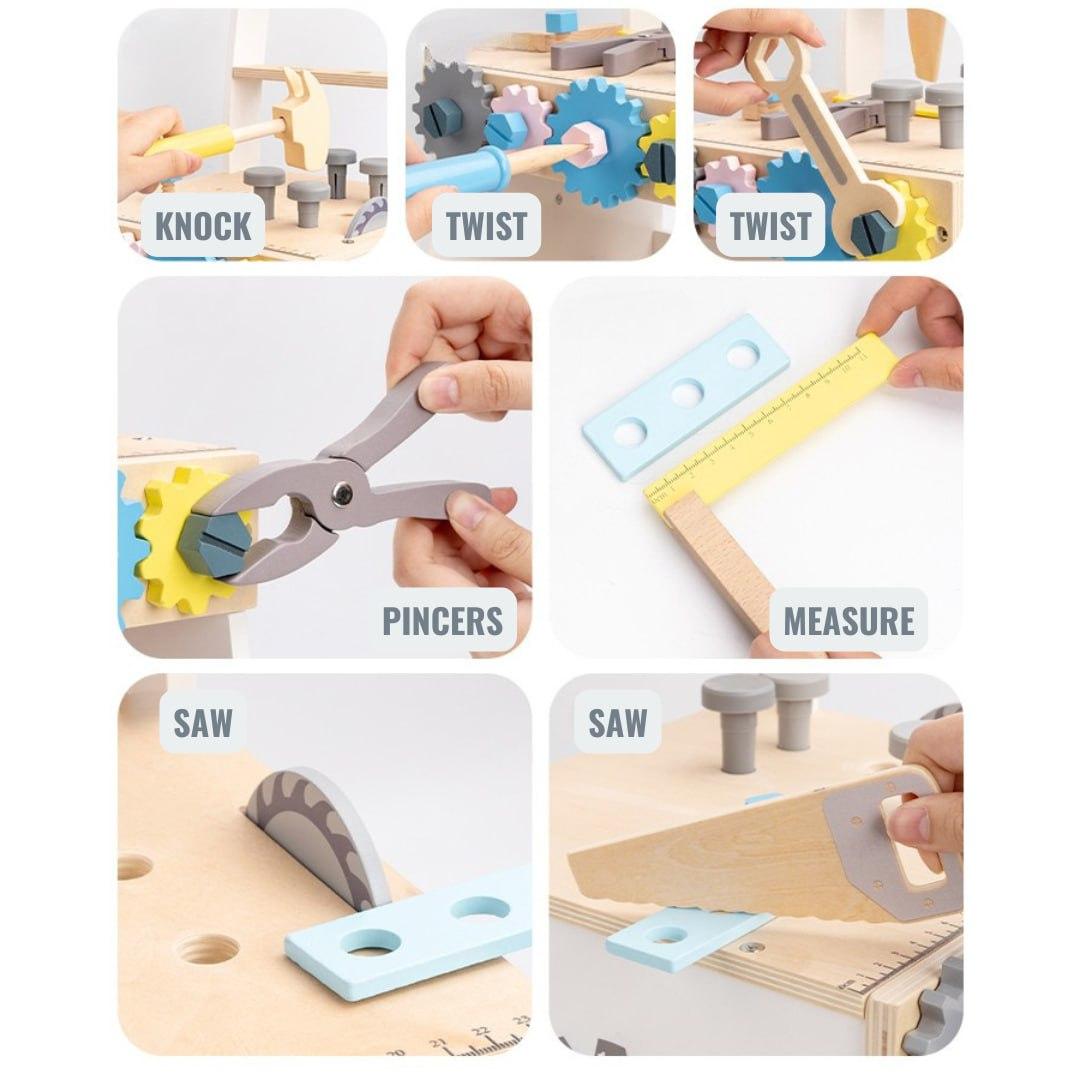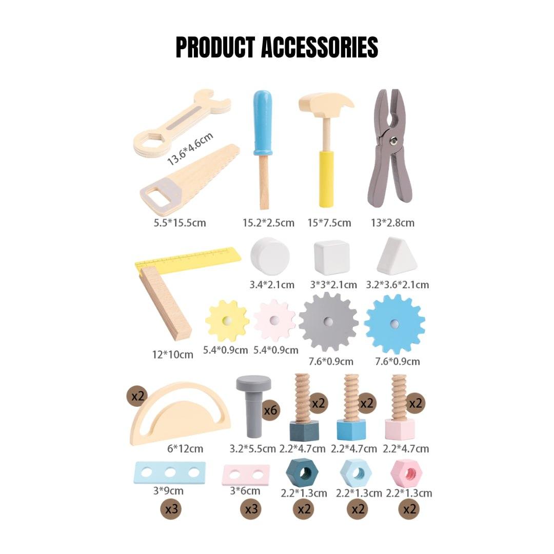 Comes with a complete set of pretend tools, gears, screws, and bolts, all thoughtfully designed with smooth edges and soft colors to encourage fine motor development and problem-solving skills.