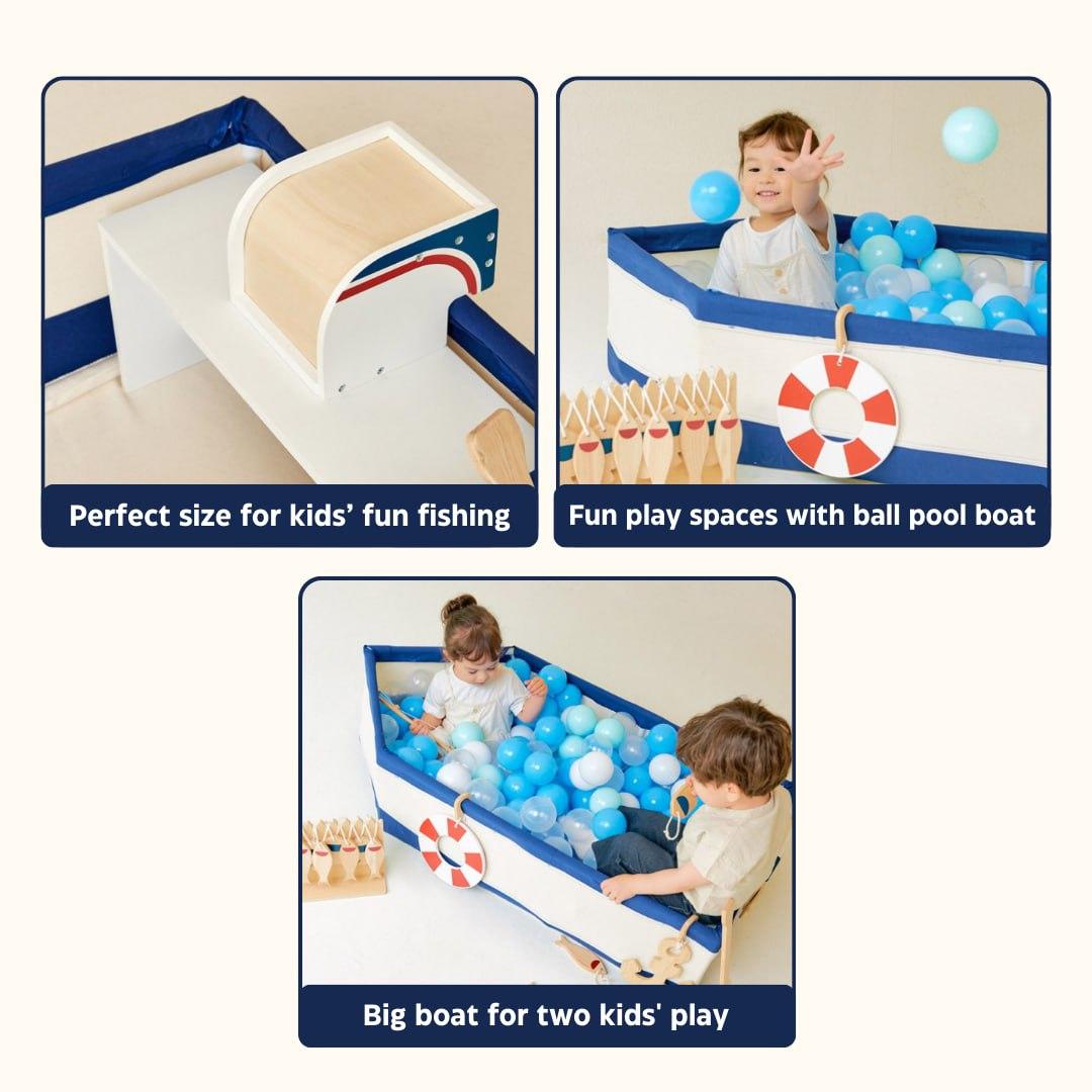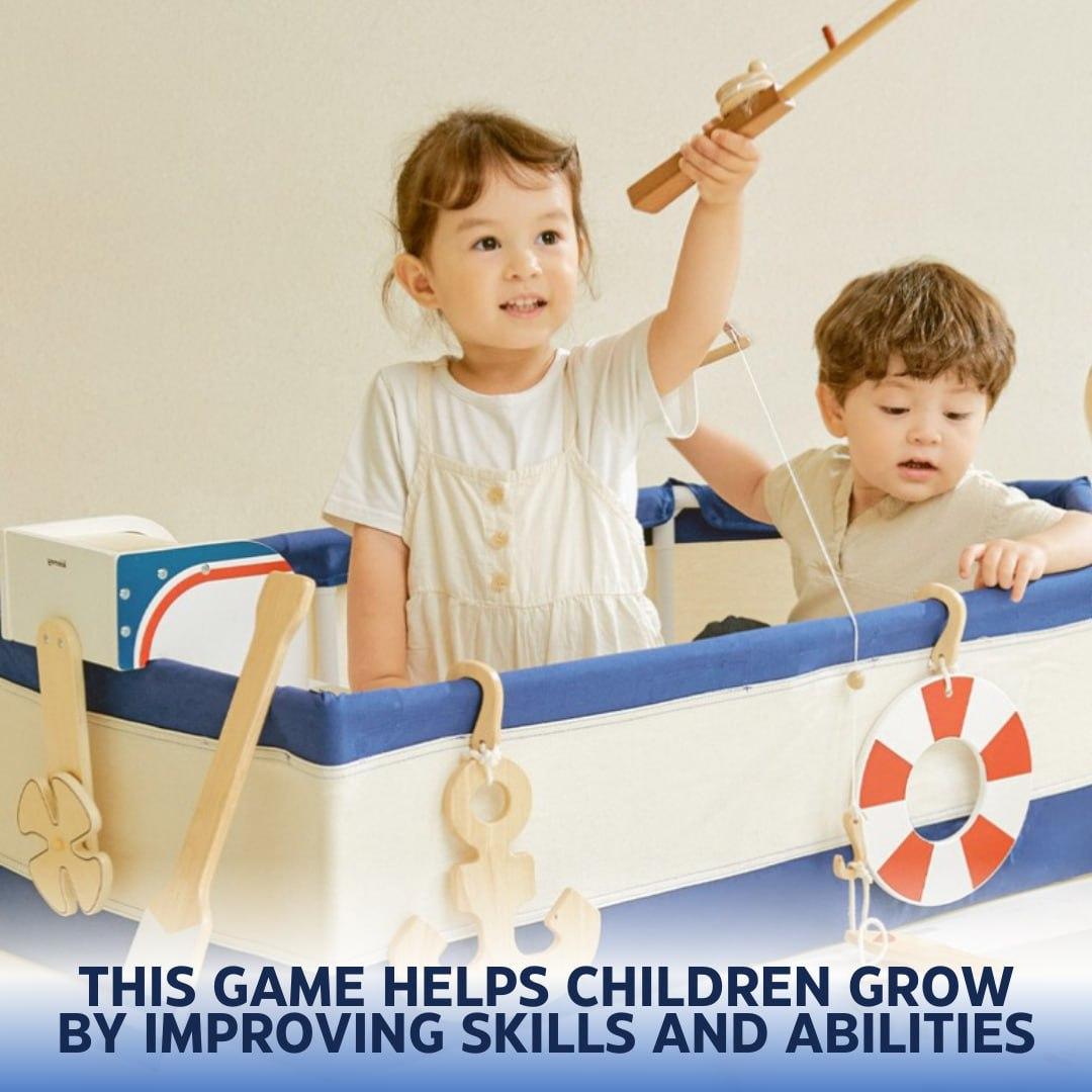 A wooden fishing boat toy for imaginative play, complete with a fabric boat frame, wooden fishing rod, fish, paddle, and nautical accessories. While participating in pretend fishing trips, children improve...