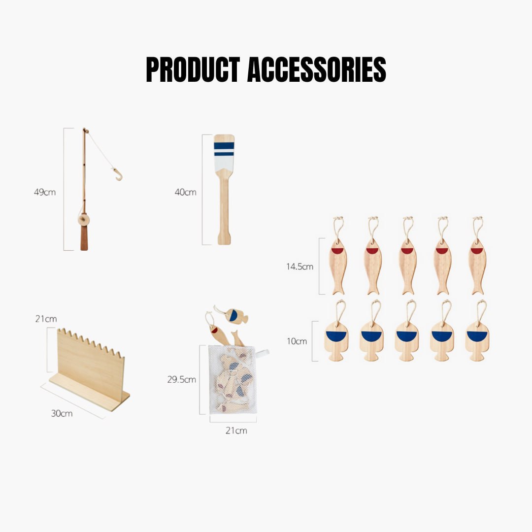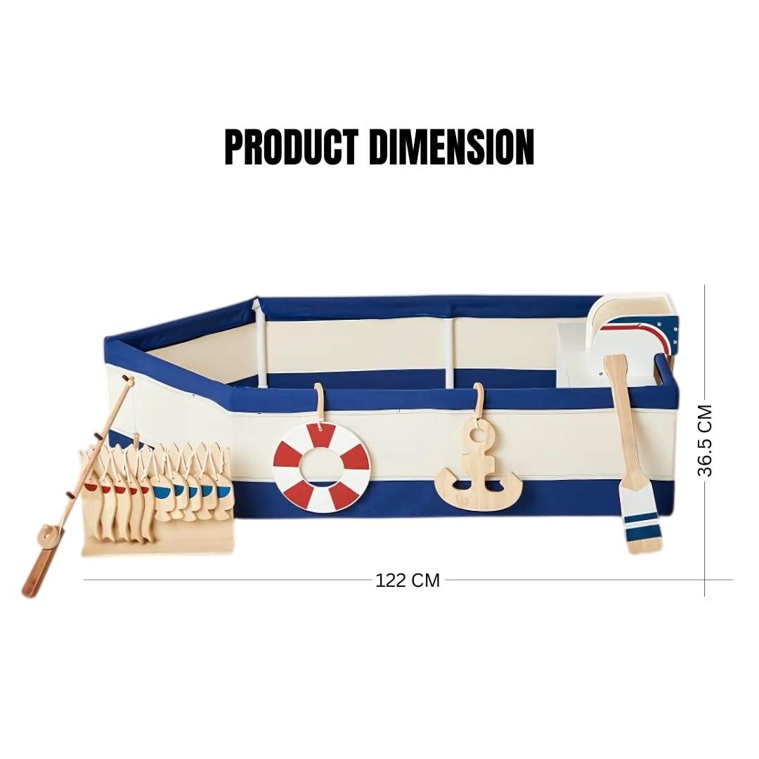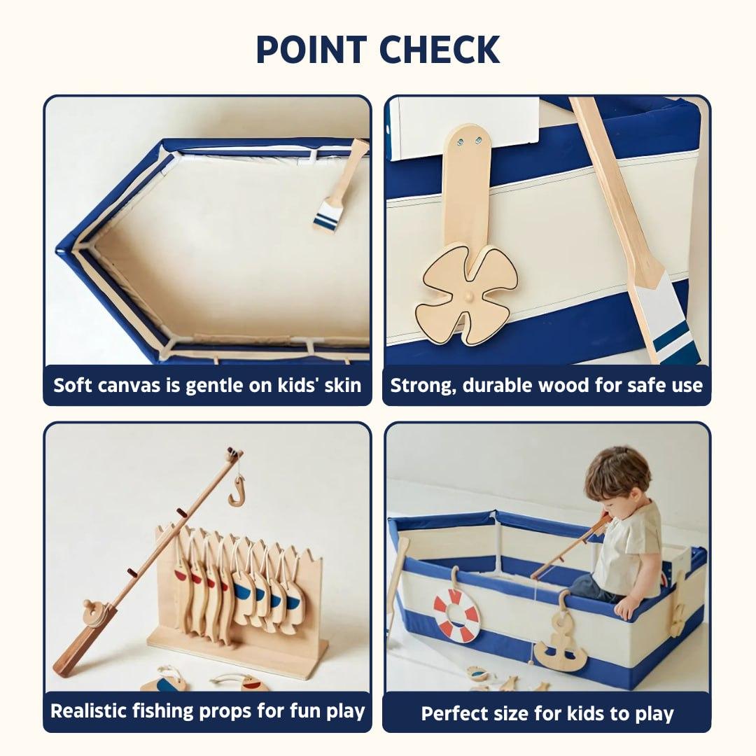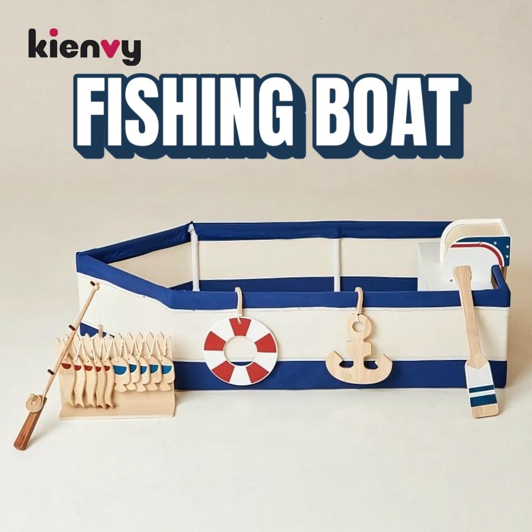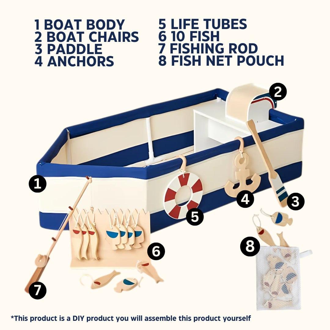 A wooden fishing boat toy for imaginative play, complete with a fabric boat frame, wooden fishing rod, fish, paddle, and nautical accessories.