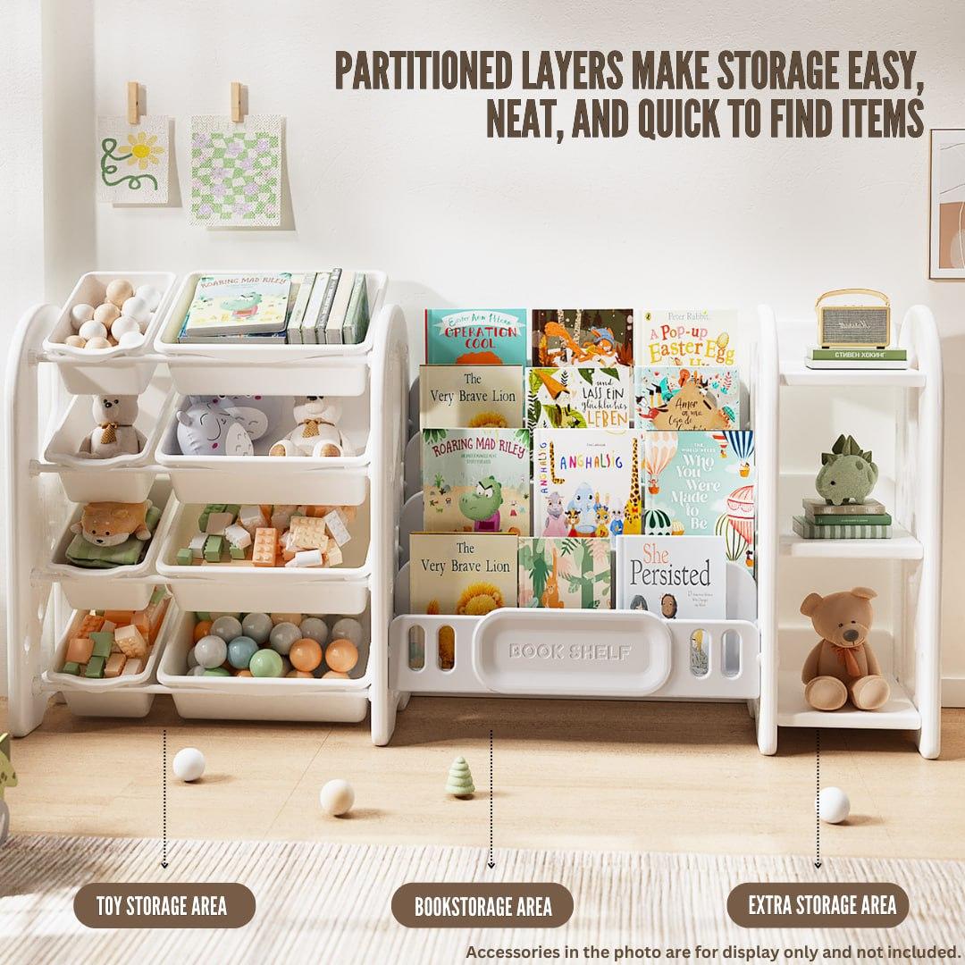 There are several roomy pockets for books, toys, and supplies. Includes easily accessible bins and shelves to meet your child's daily needs.