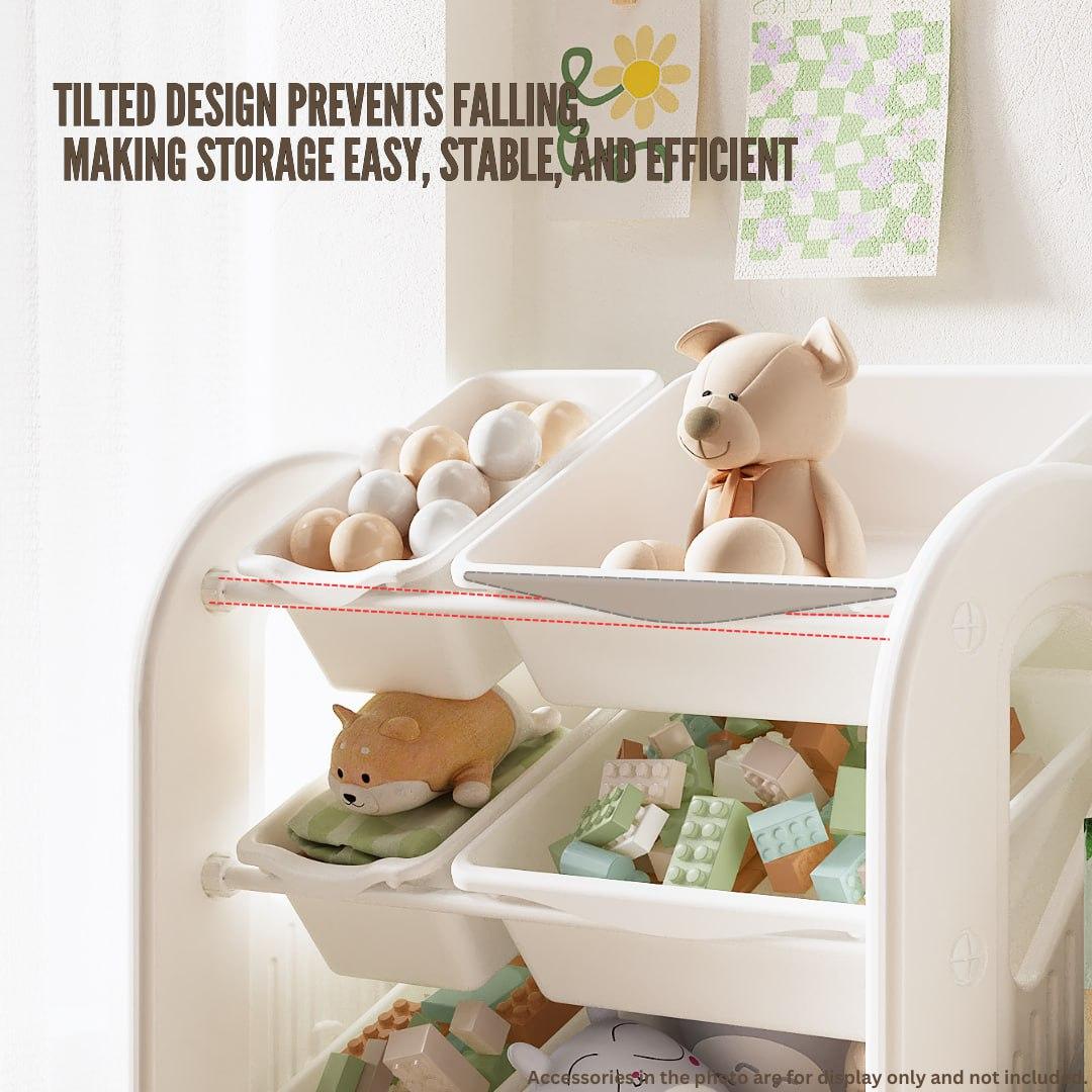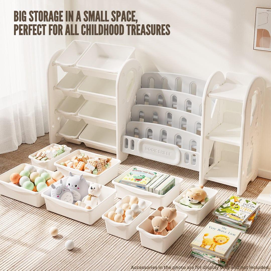 The neutral style complements any home decor. Ideal for bedrooms, playrooms, or learning environments, optimizing storage in a compact space.