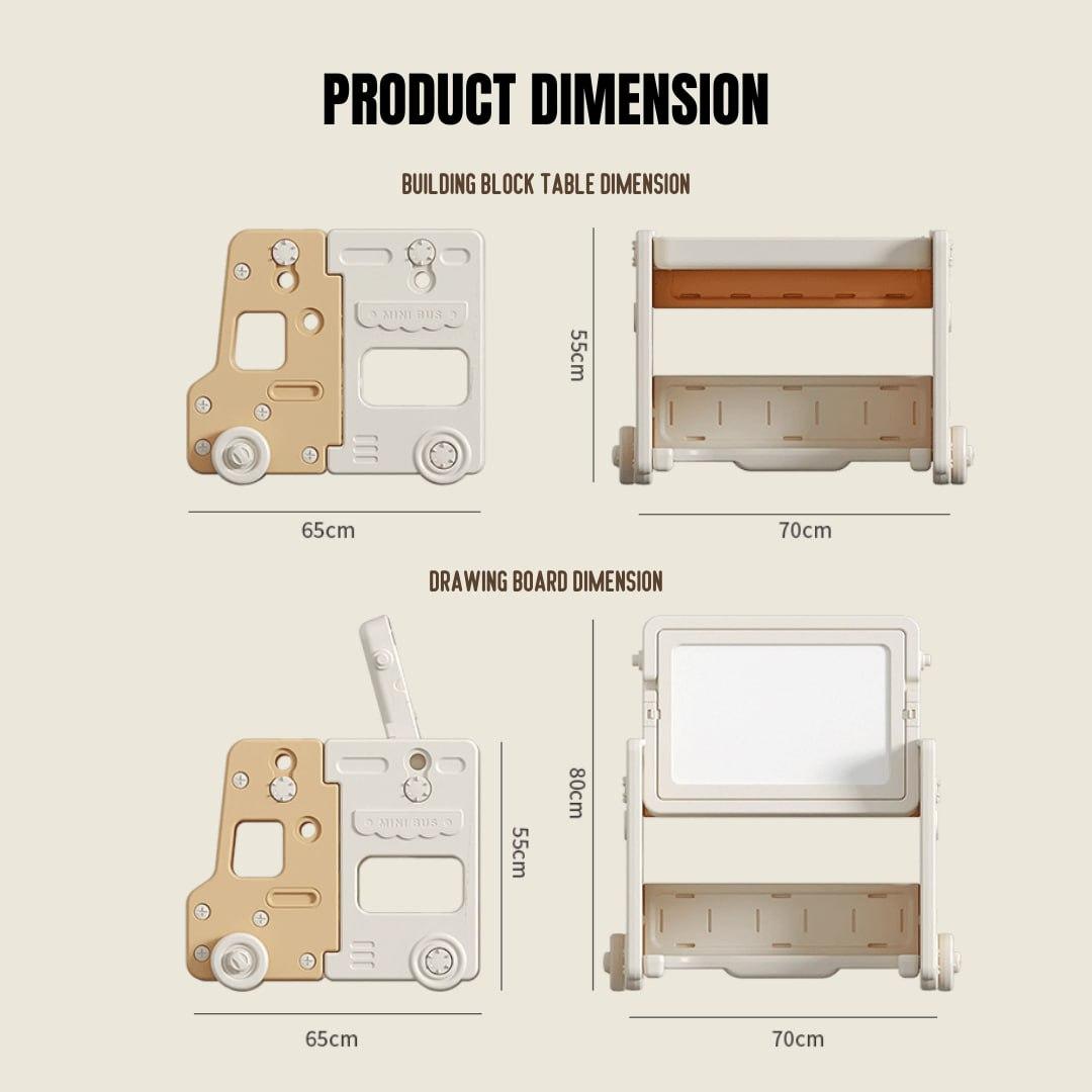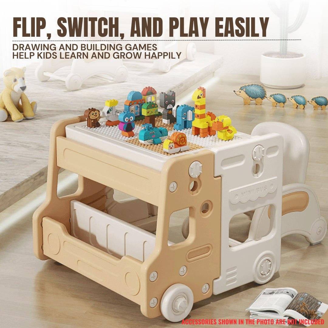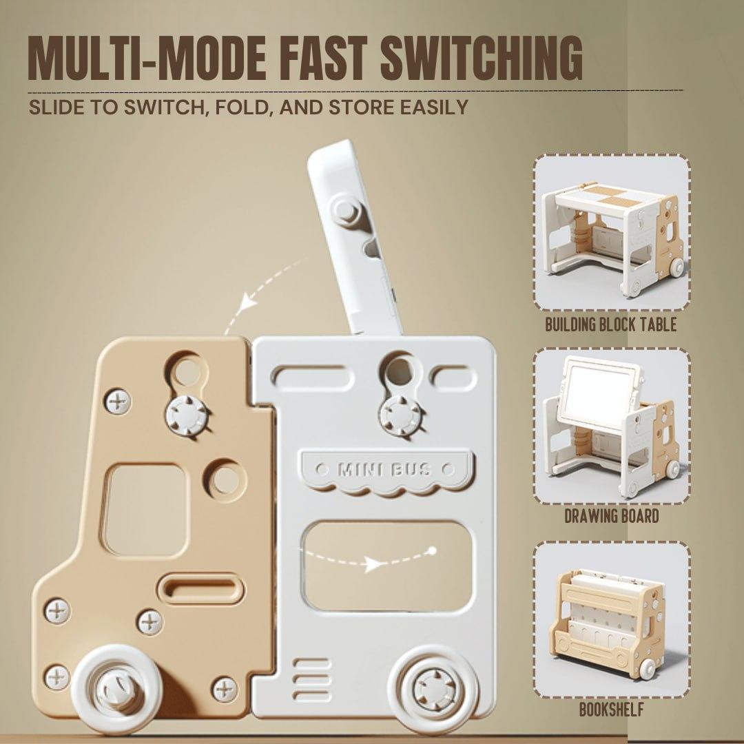 This ingenious Mini Bus Table converts effortlessly into three practical modes: a building block table, a drawing board, and a bookcase. Whether your child wants to play, learn, or organize their books, this multi-mode table easily accommodates their demands.