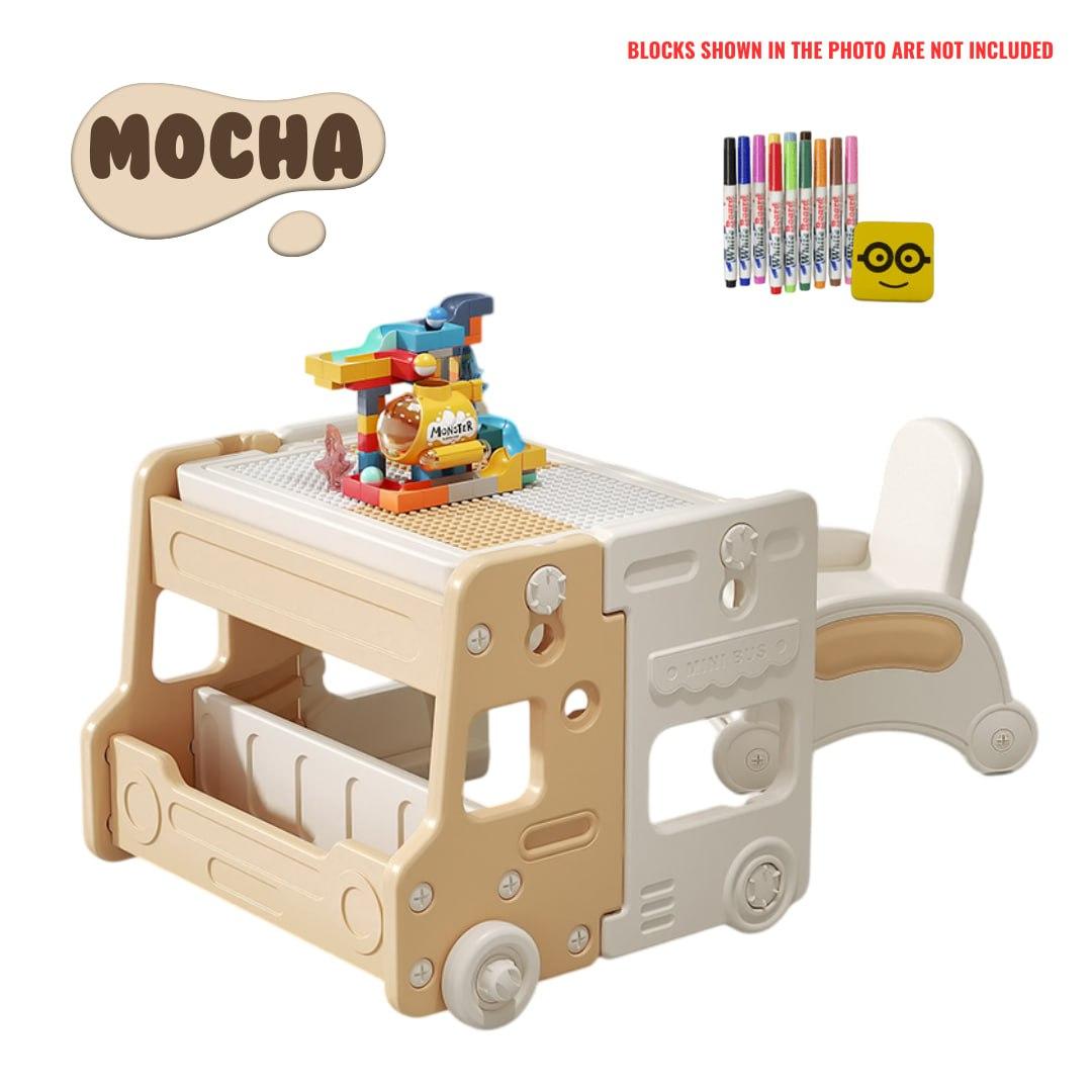 This ingenious Mini Bus Table converts effortlessly into three practical modes: a building block table, a drawing board, and a bookcase. Whether your child wants to play, learn, or organize...