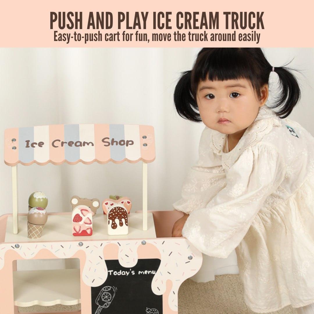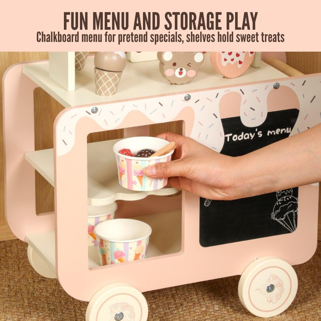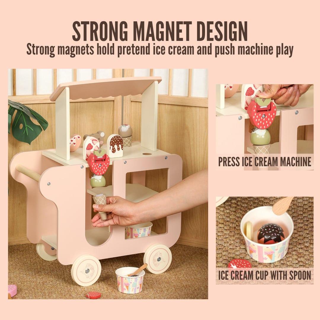 A gorgeously crafted wooden ice cream cart that encourages imaginative play and creativity by letting children pretend to be small store owners and serve out delicious delights.