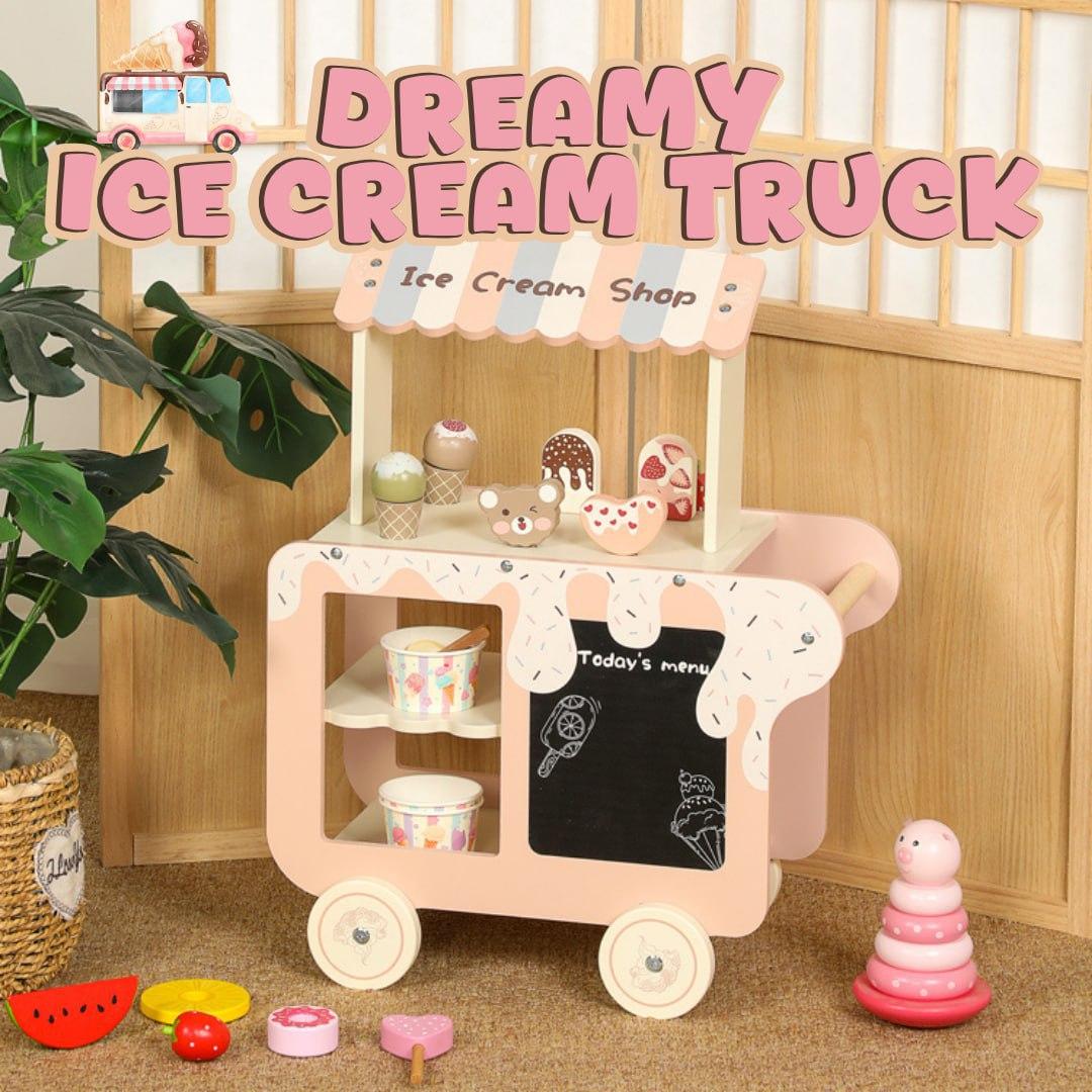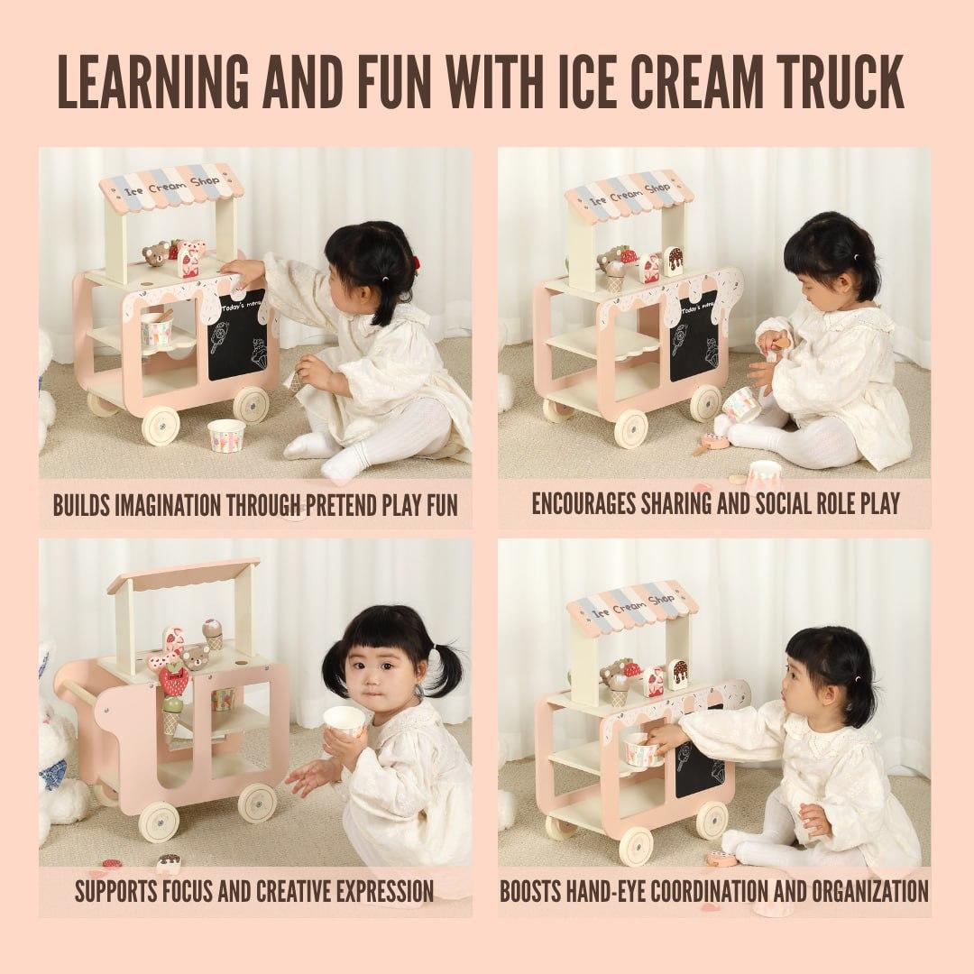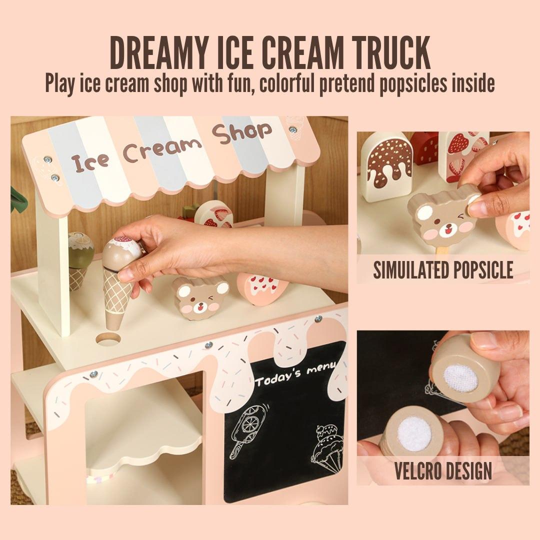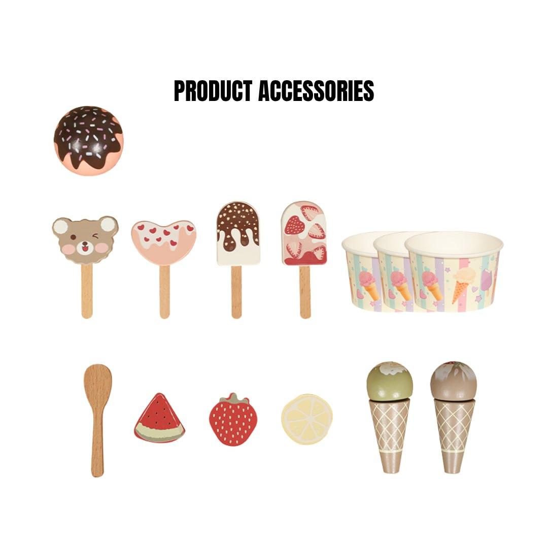 A gorgeously crafted wooden ice cream cart that encourages imaginative play and creativity by letting children pretend to be small store owners and serve out delicious delights.