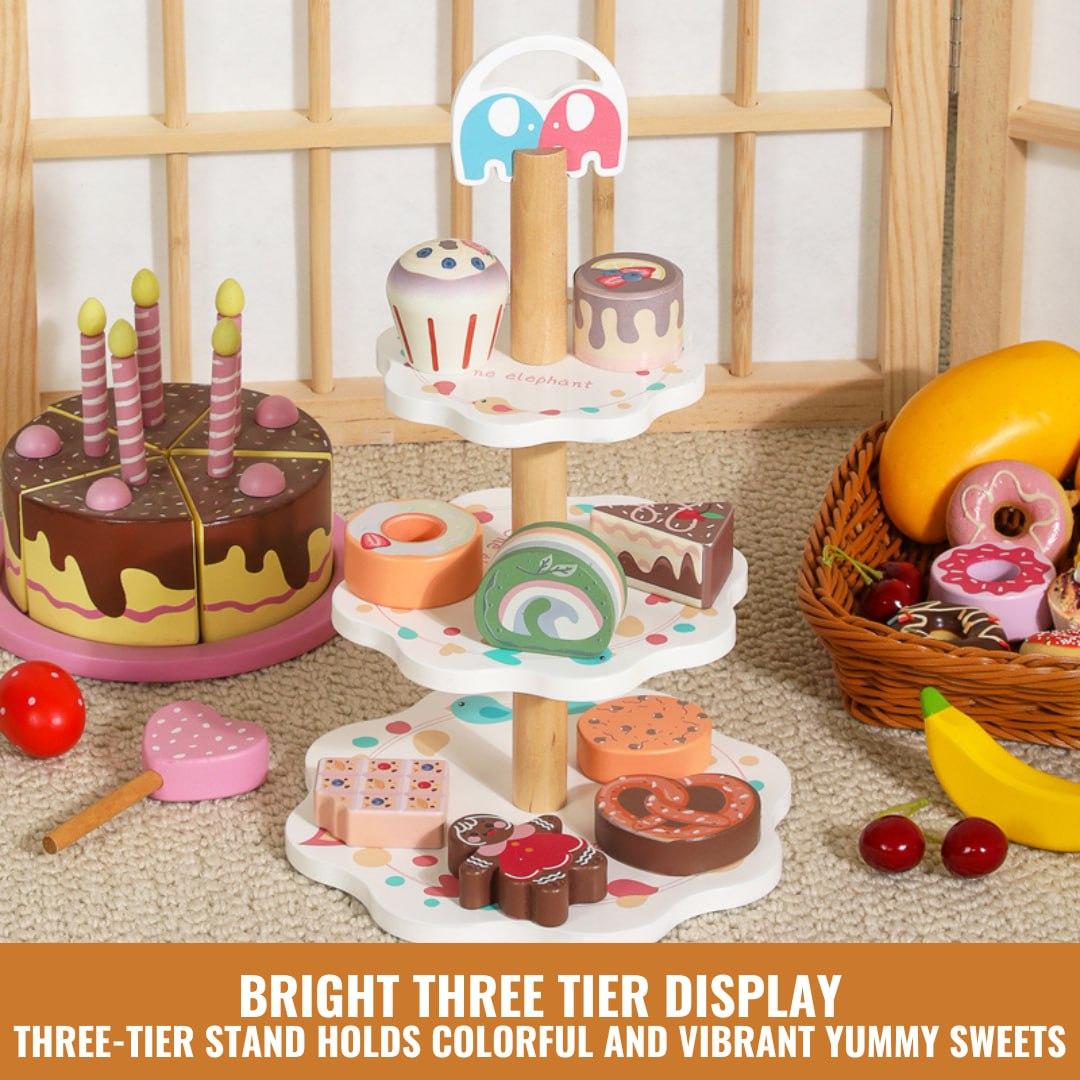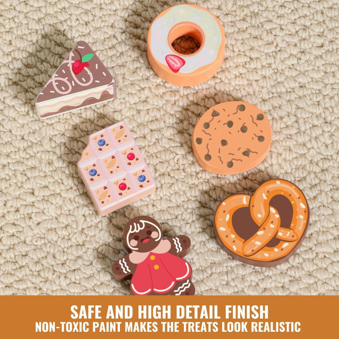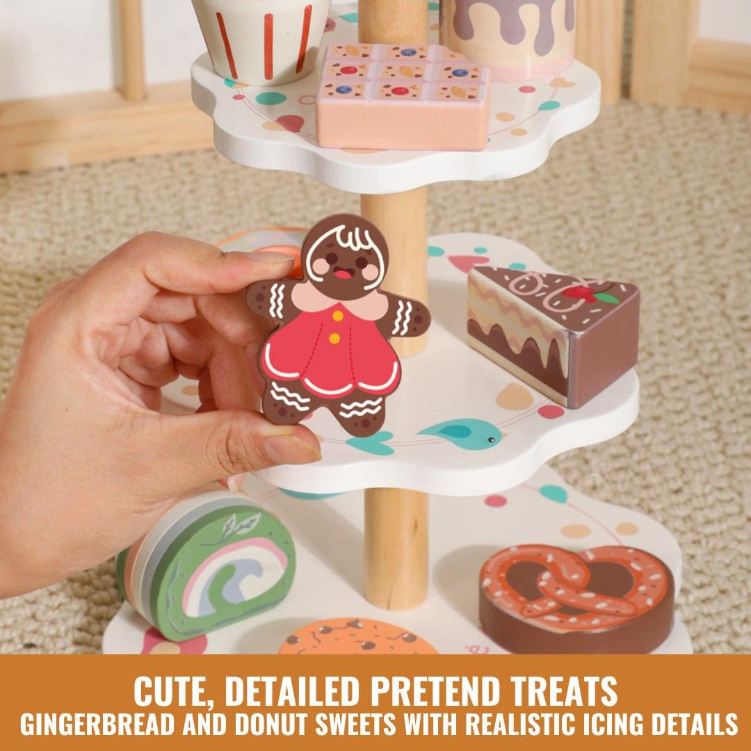 • Charming wooden dessert rack featuring realistic cakes, rolls, donuts, and sweets for imaginative pretend play.
