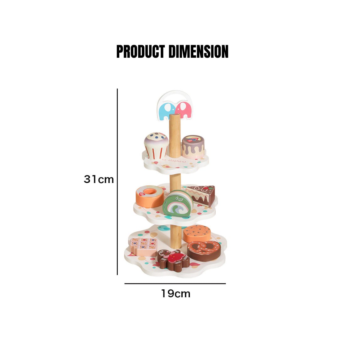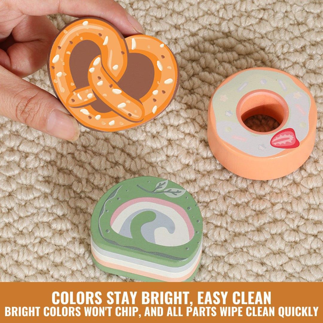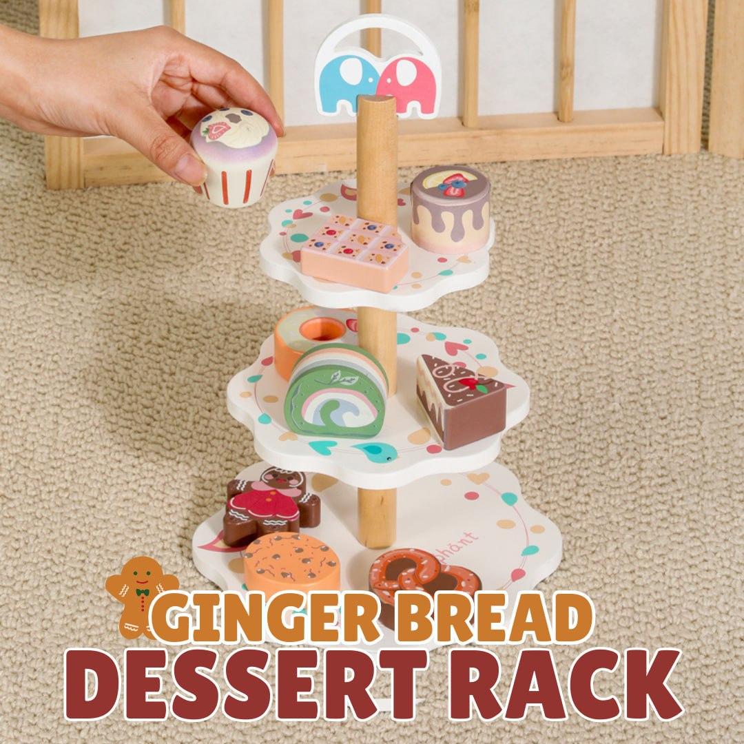 • Charming wooden dessert rack featuring realistic cakes, rolls, donuts, and sweets for imaginative pretend play.