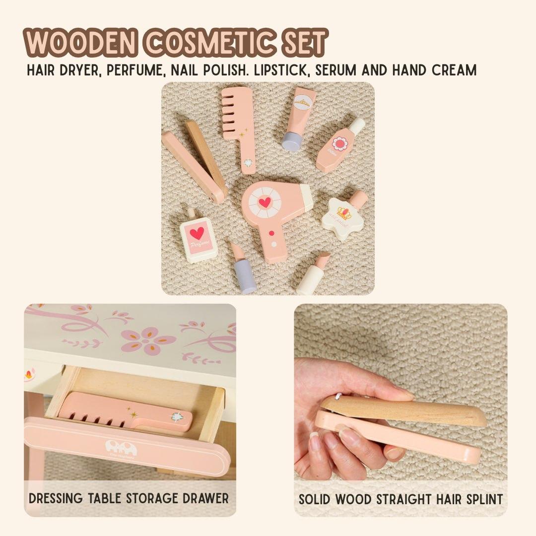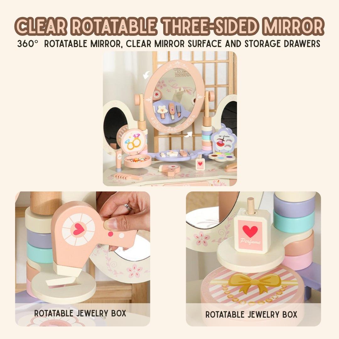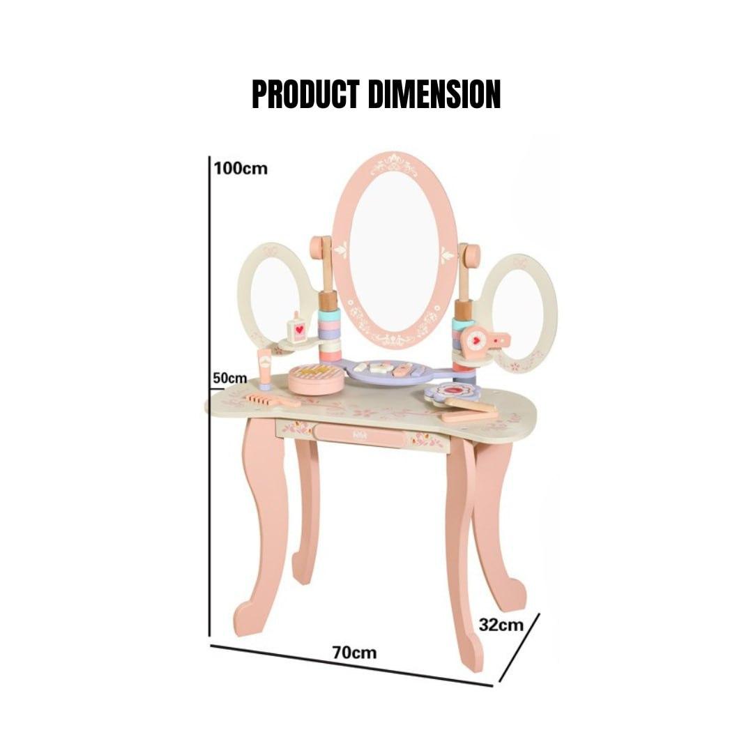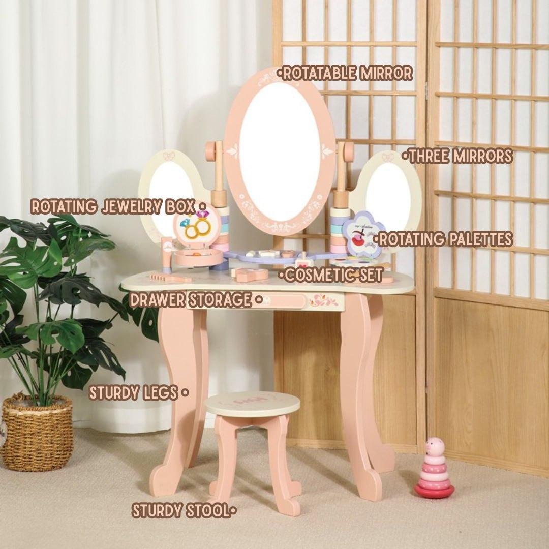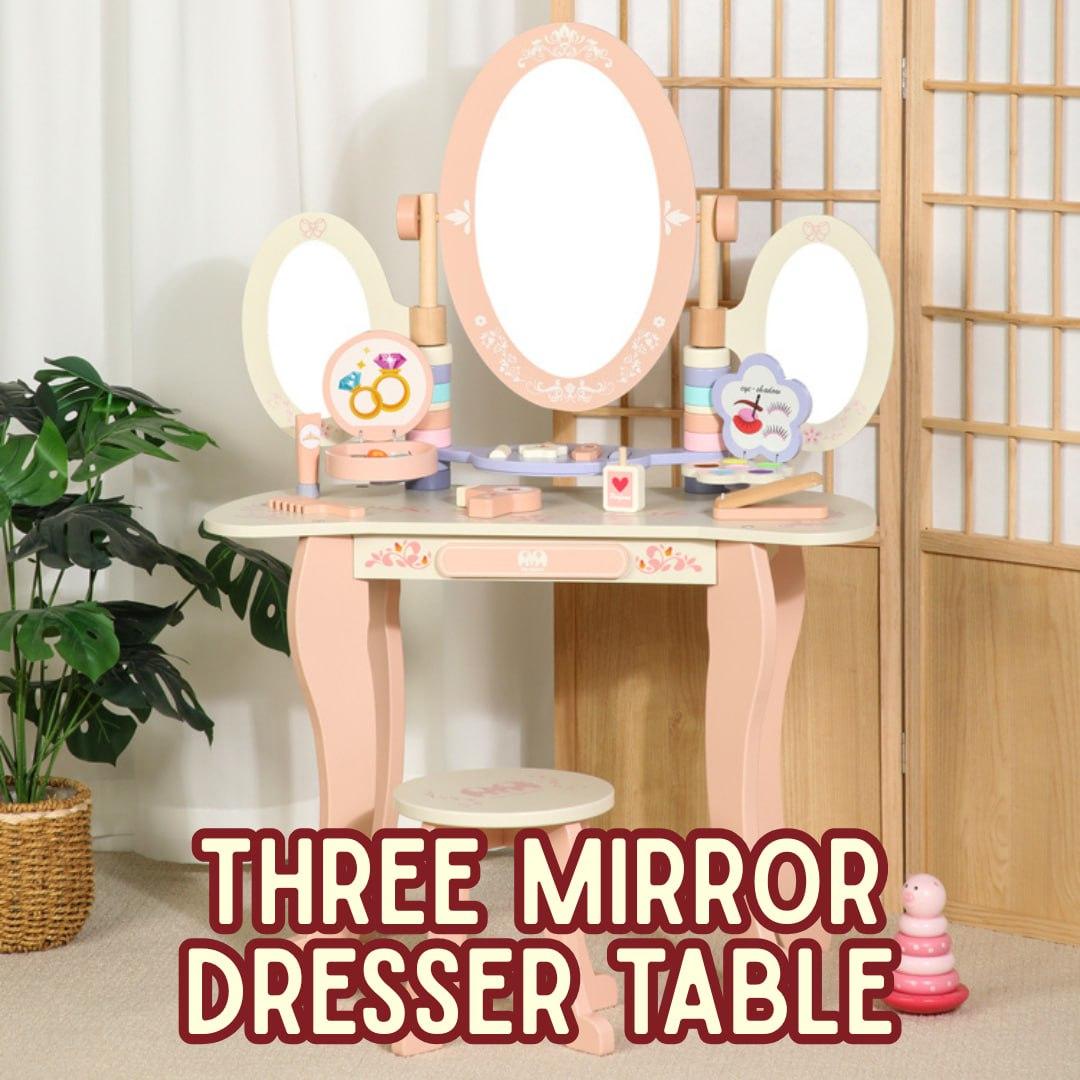 Charming wooden dresser table set with three mirrors for a full view, perfect for imaginative beauty play and role-playing games. Create a genuine salon or vanity experience by include accessories...