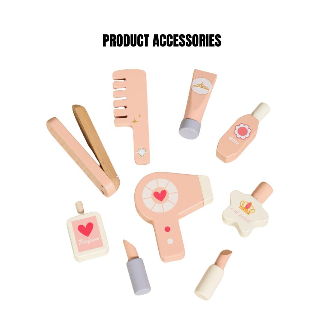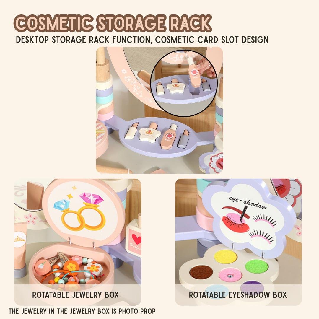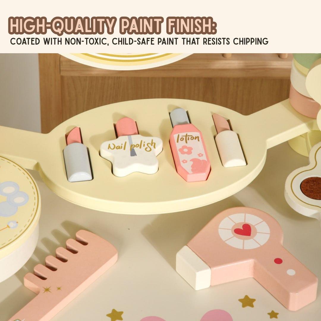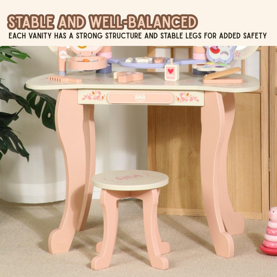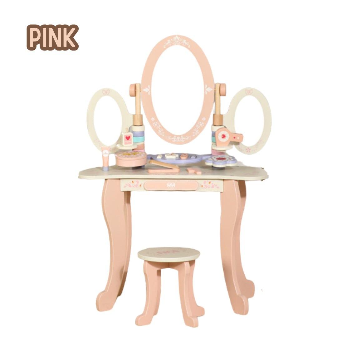 Charming wooden dresser table set with three mirrors for a full view, perfect for imaginative beauty play and role-playing games. Create a genuine salon or vanity experience by include accessories...