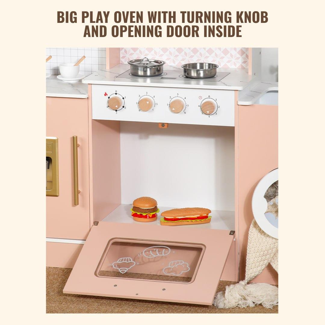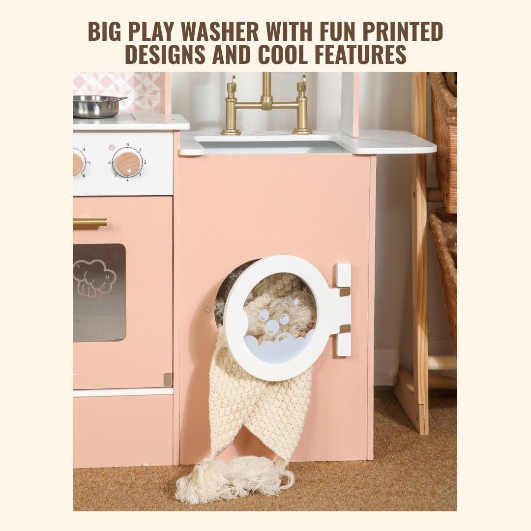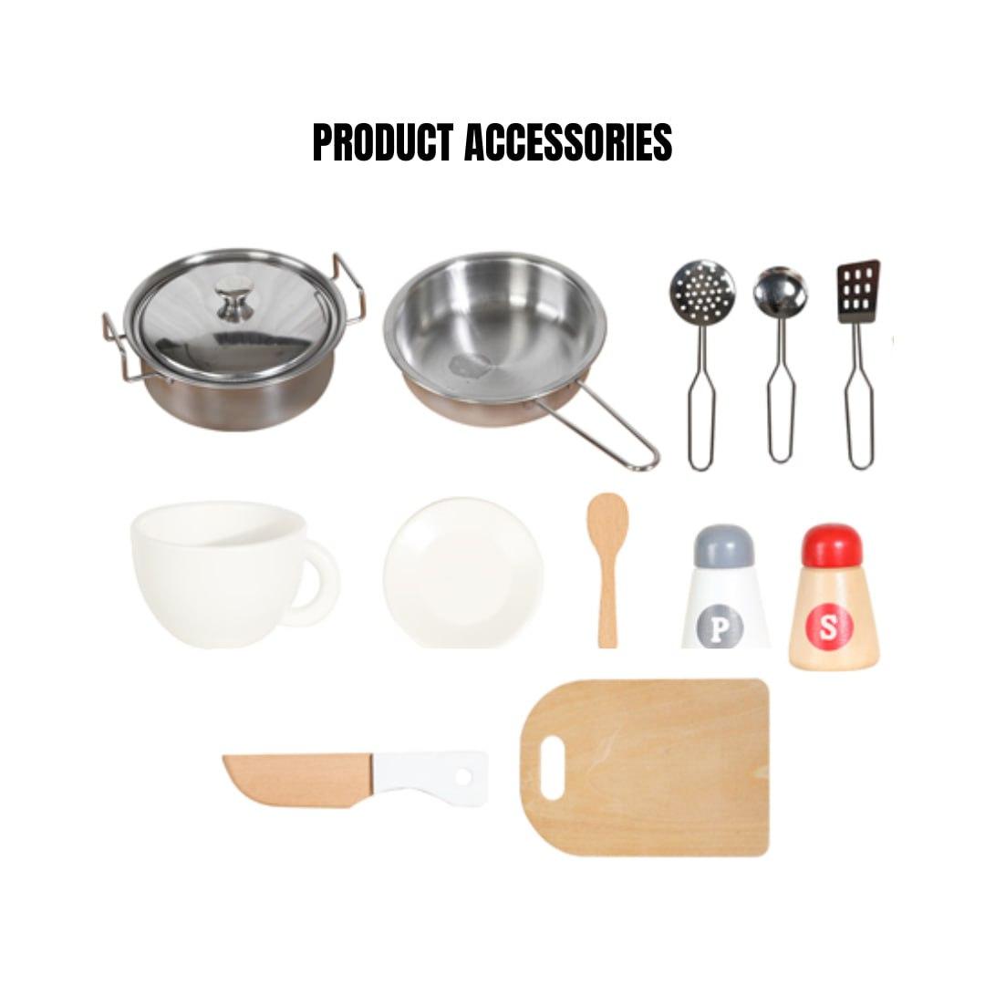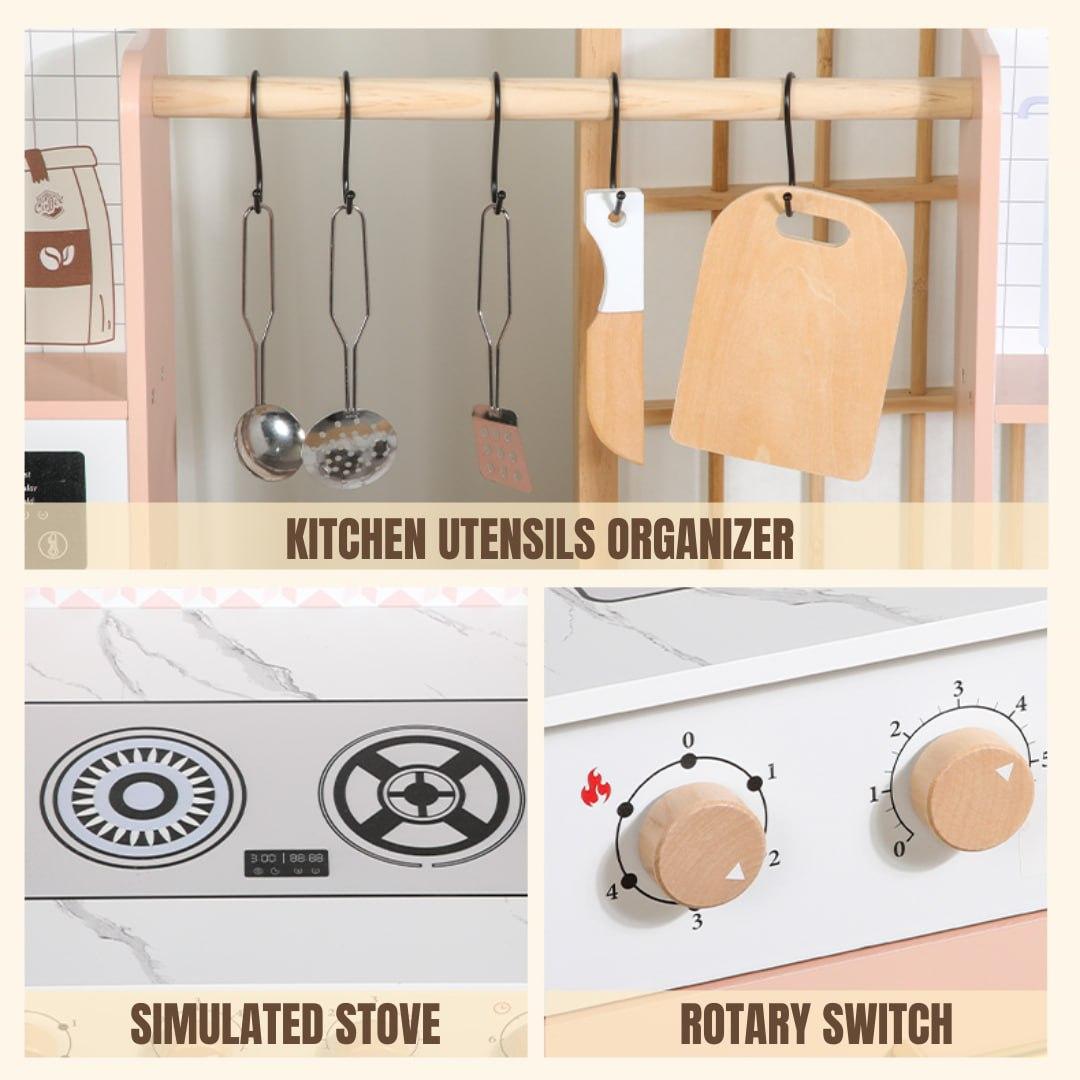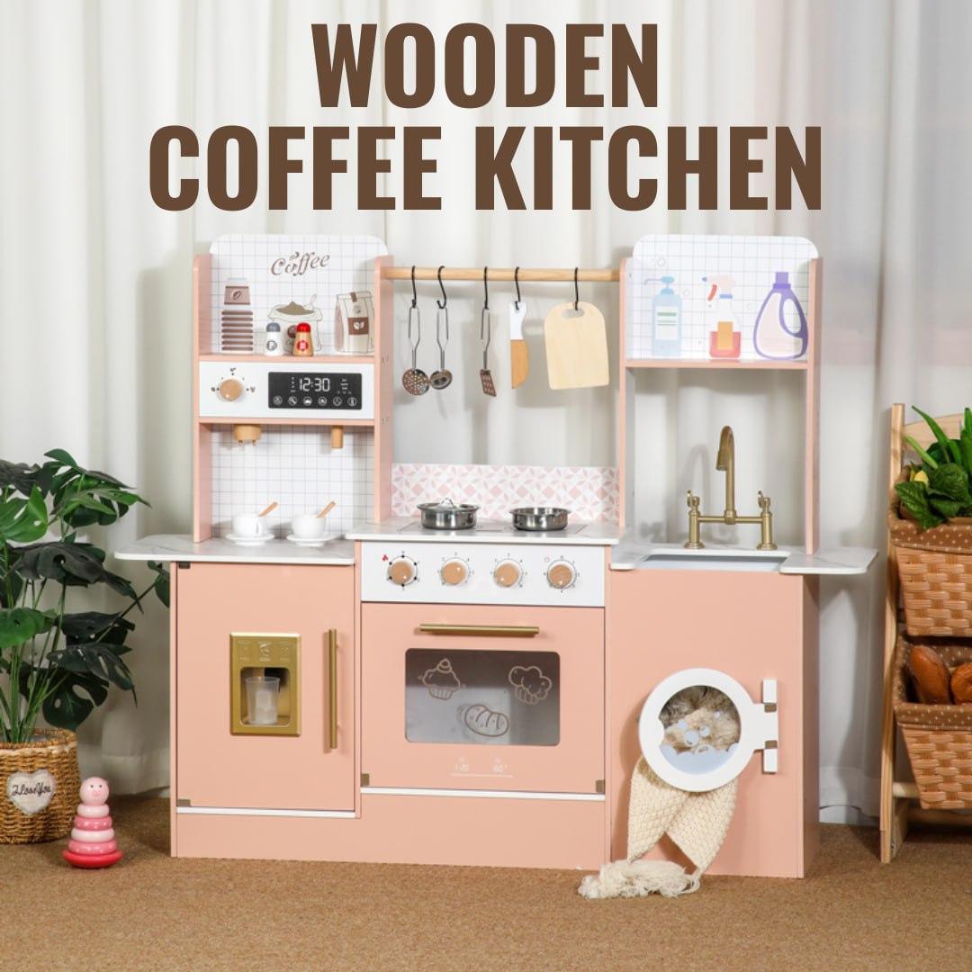Elegant hardwood coffee kitchen set with realistic amenities, including a coffee maker, oven, sink, and stove. Comes with cute accessories including cups, utensils, pots, and pretend food items to encourage...