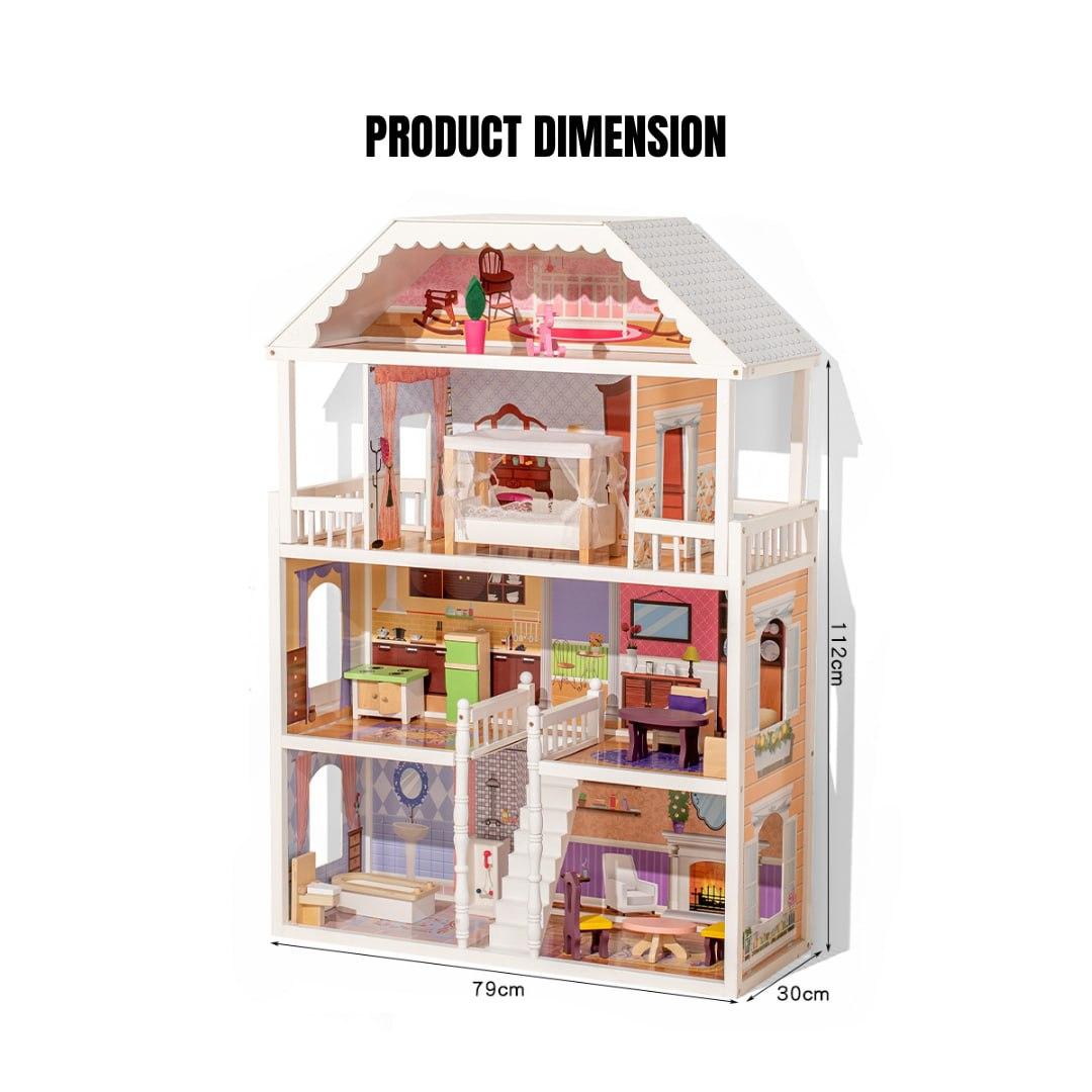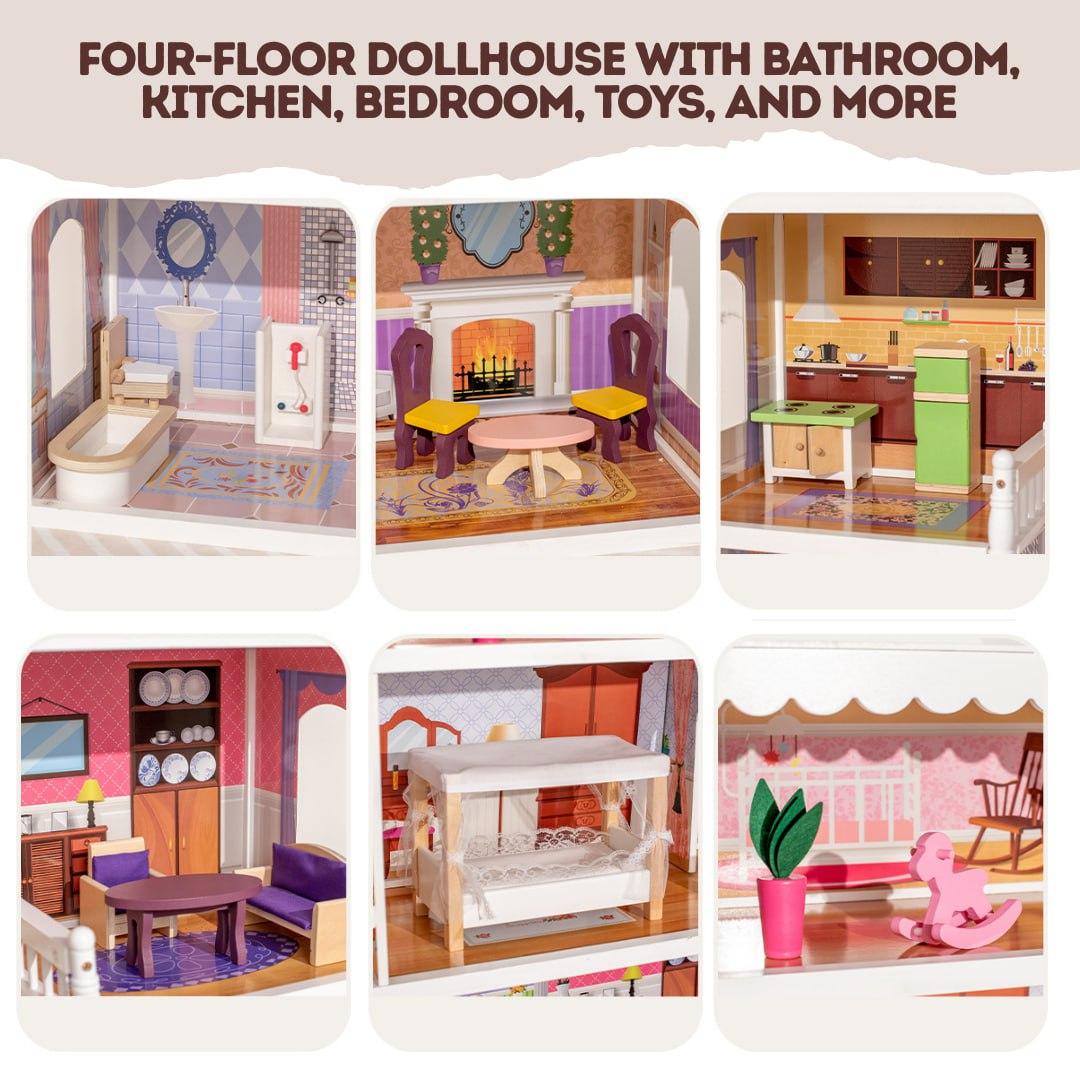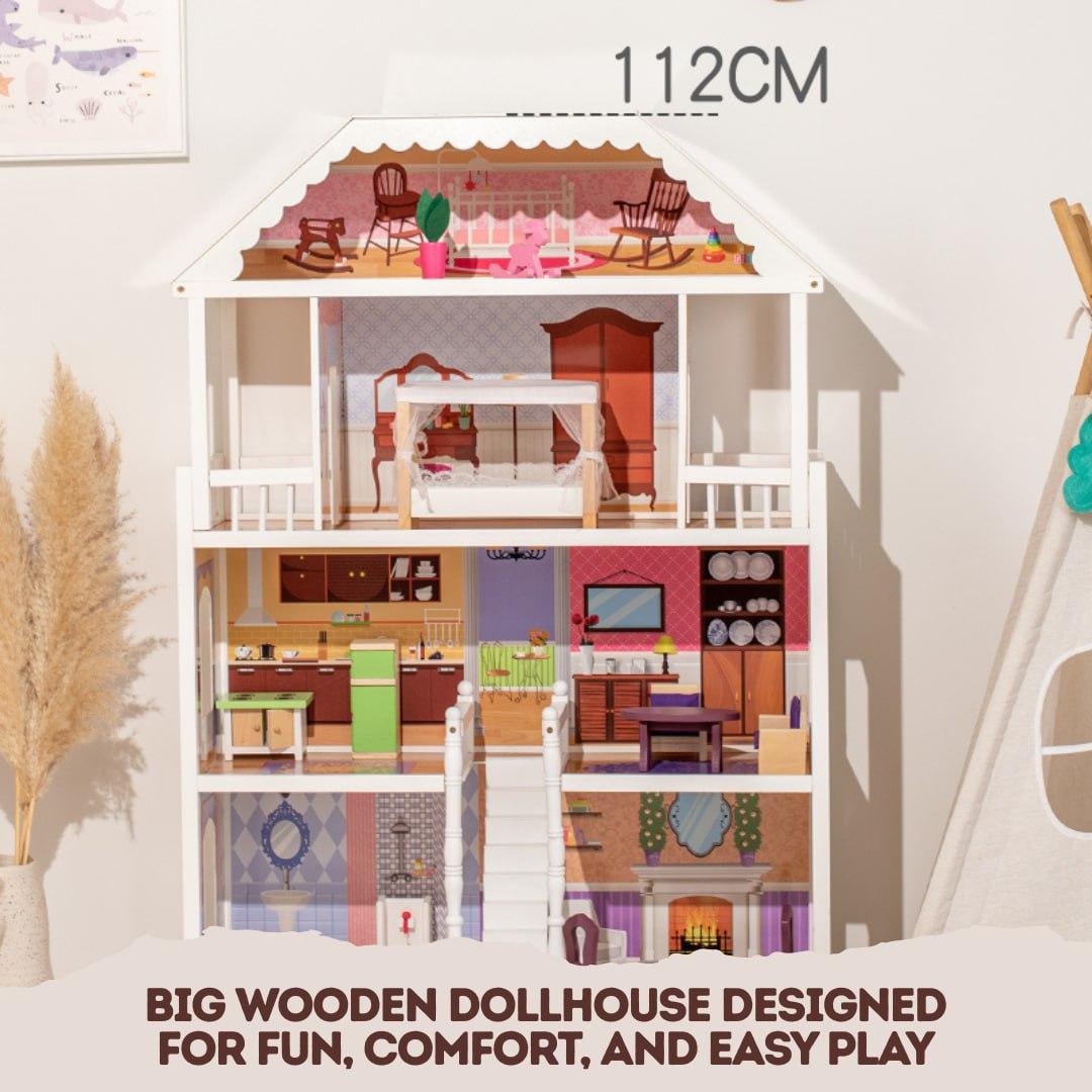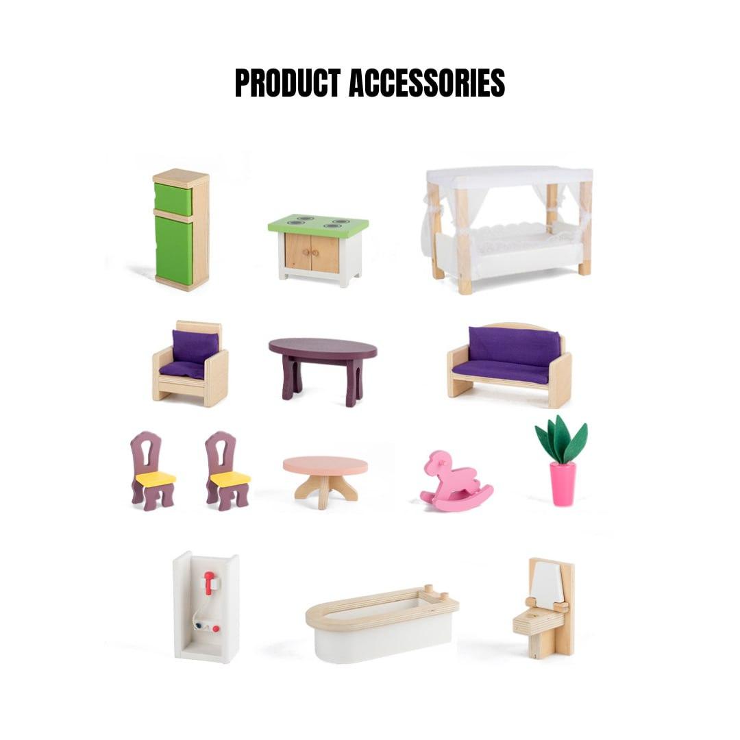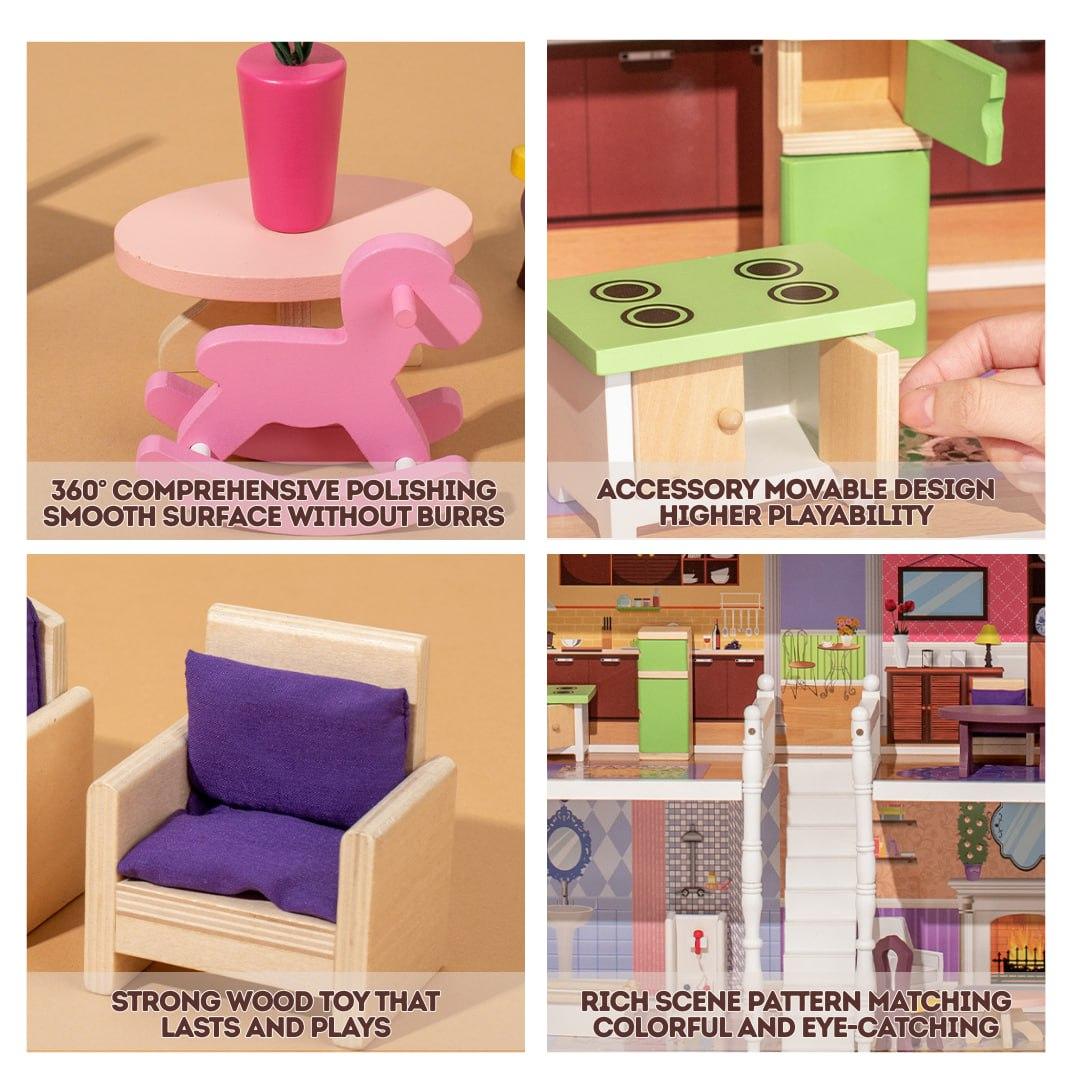 This dollhouse, made of high-quality wood and featuring vivid, printed walls and miniature furniture, is both durable and visually appealing, making it an ideal addition to any playroom.