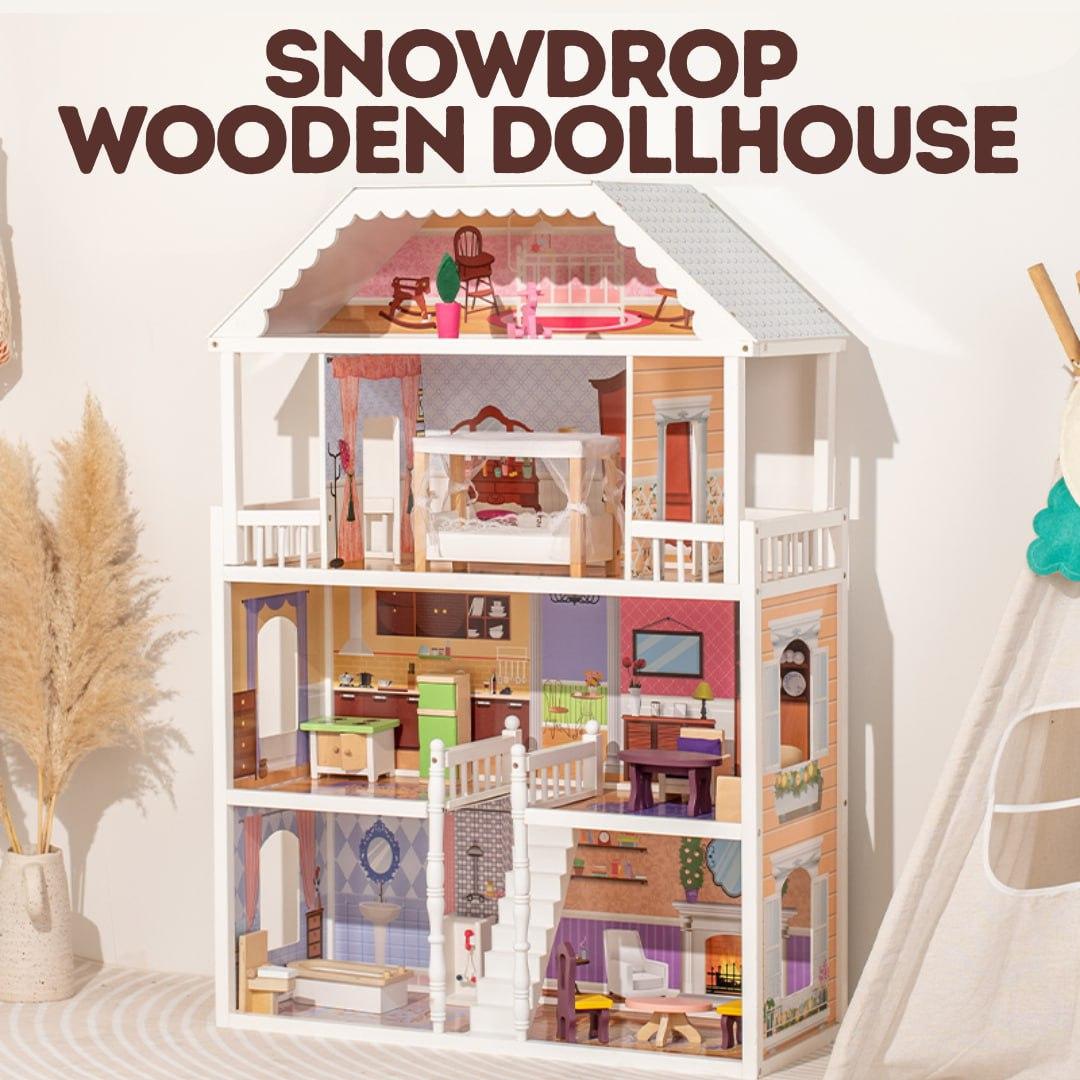 The Snowdrop Wooden Dollhouse is a highly crafted three-story arrangement with several rooms, including a bedroom, bathroom, kitchen, and living room—ideal for imaginative play.
