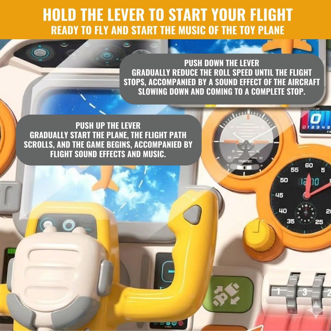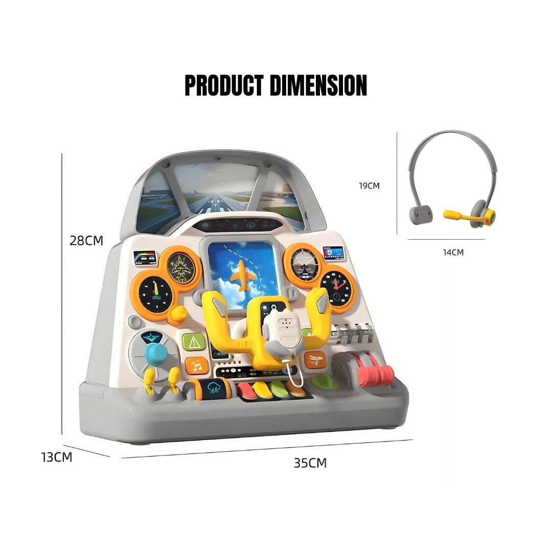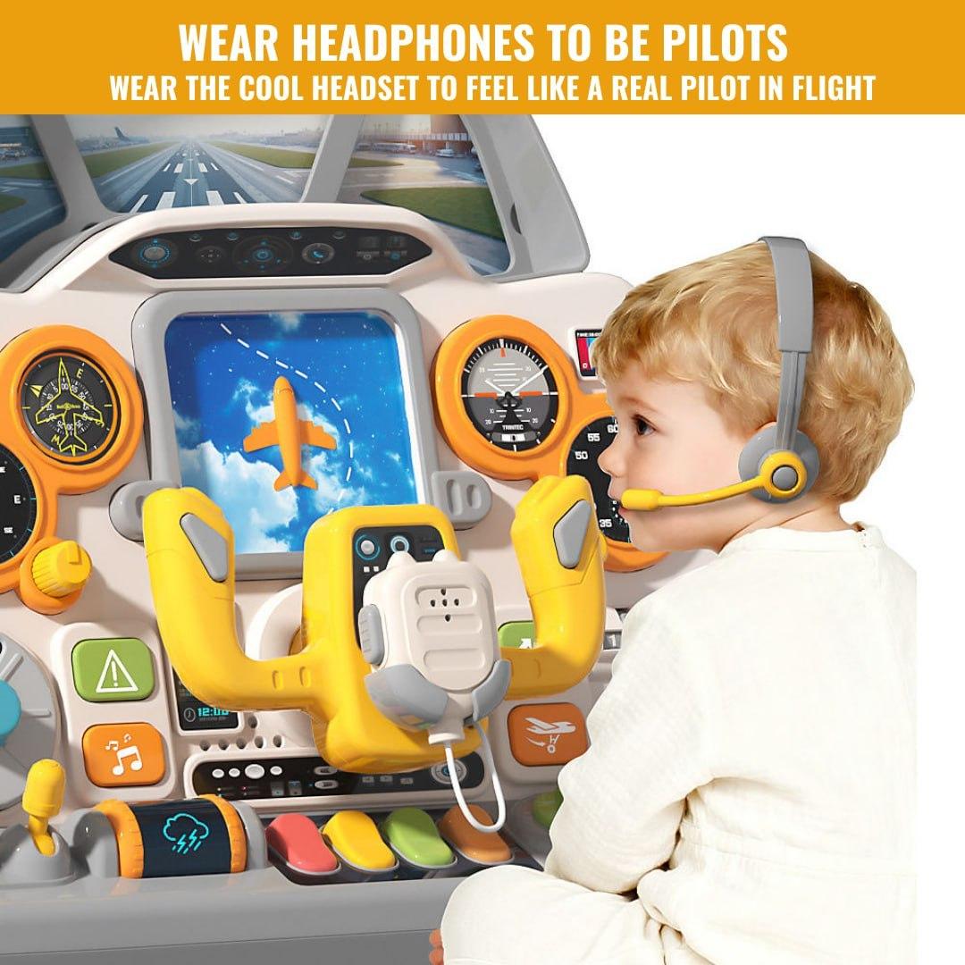 Realistic aircraft cockpit simulation toy with interactive buttons, steering controls, and dashboard features for immersive pretend play