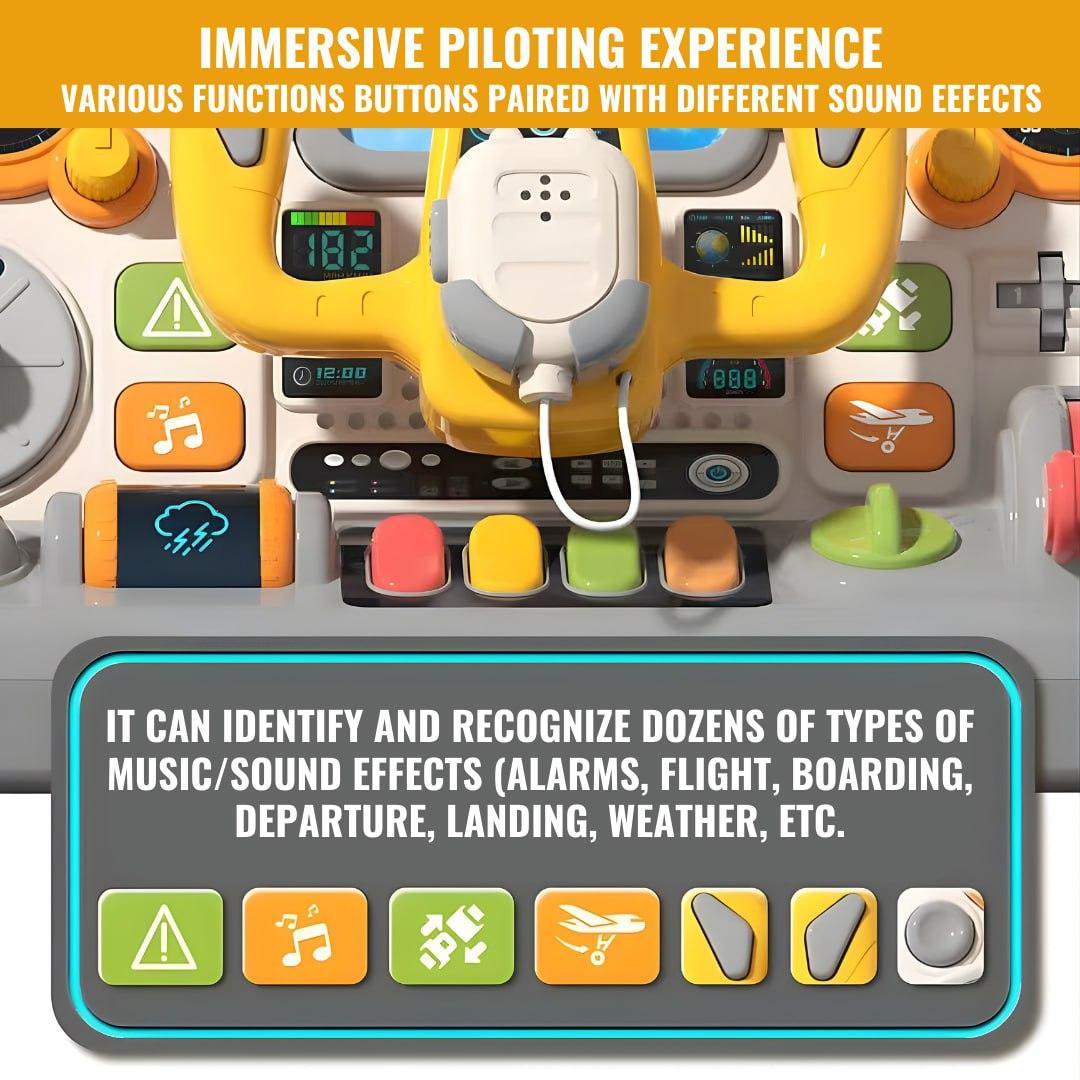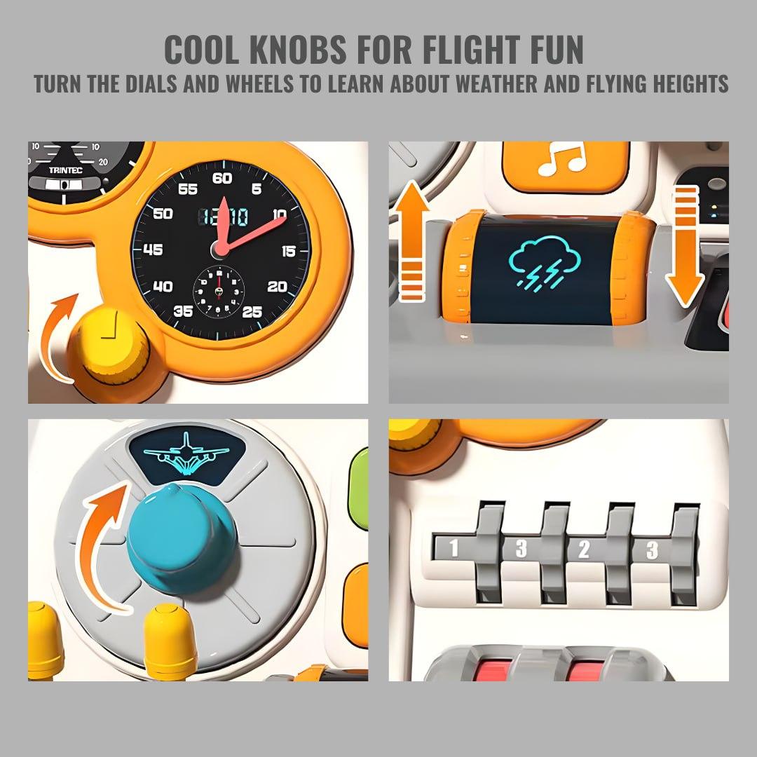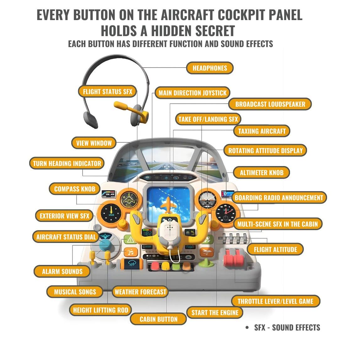 Realistic aircraft cockpit simulation toy with interactive buttons, steering controls, and dashboard features for immersive pretend play