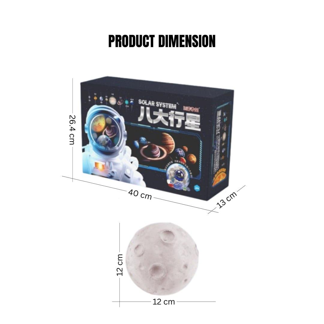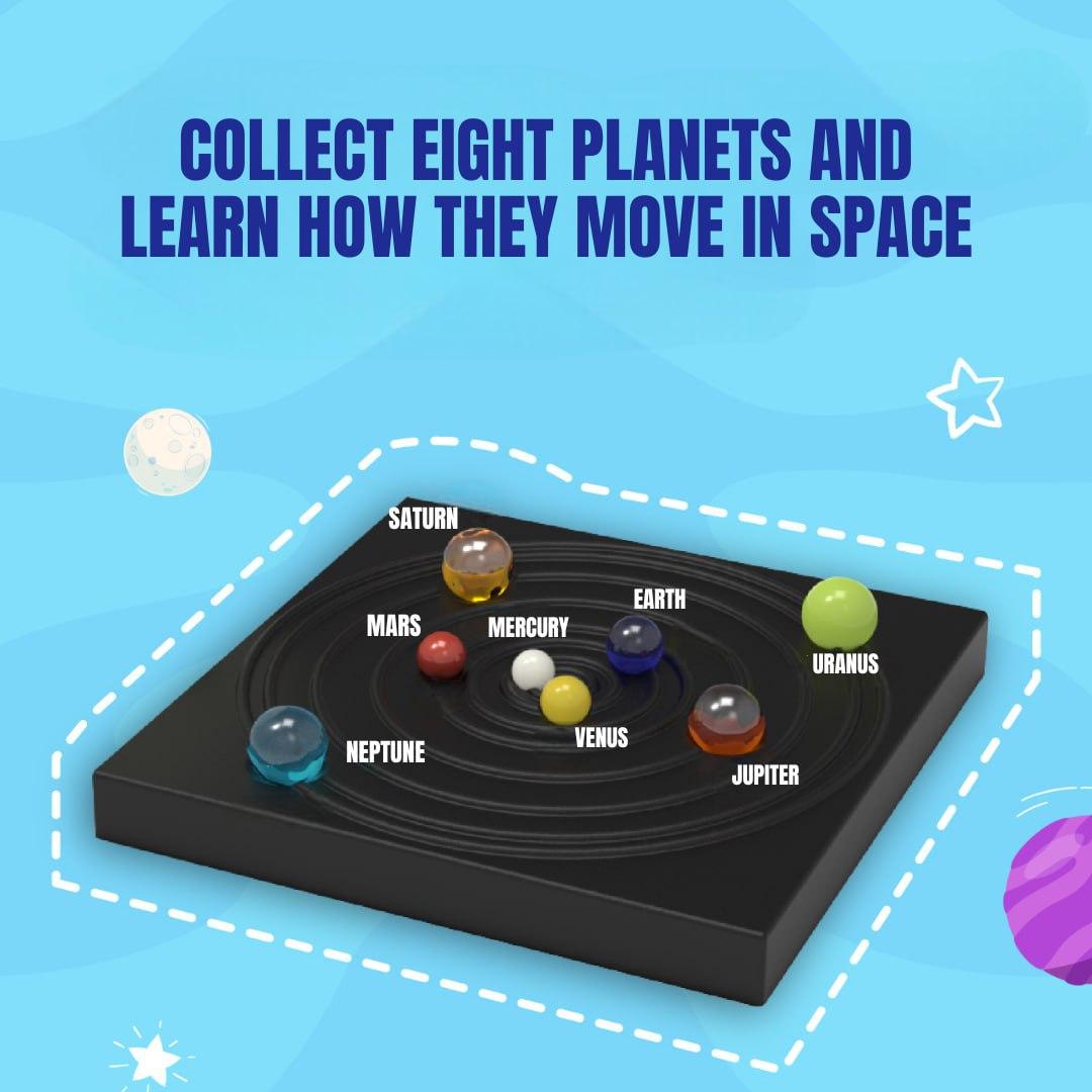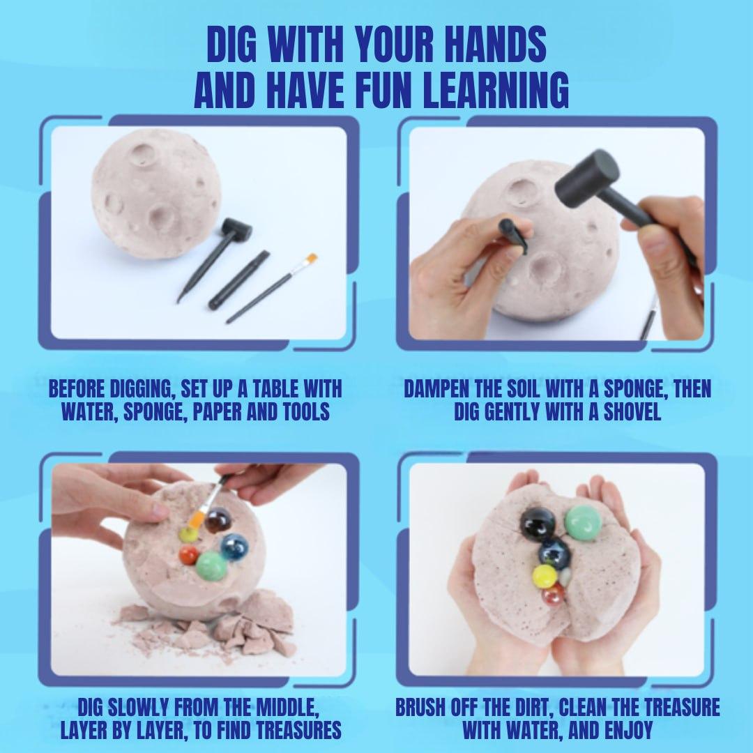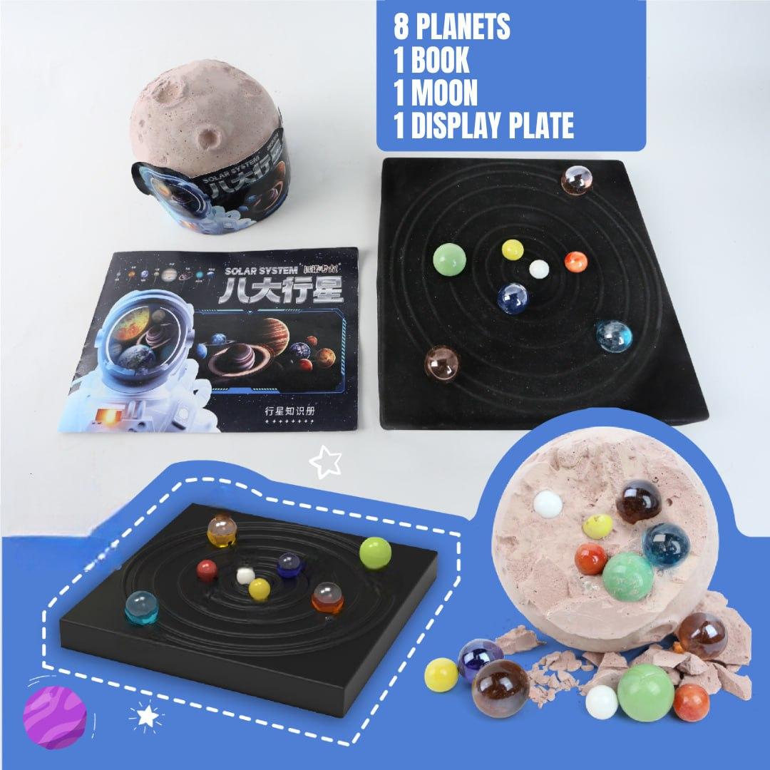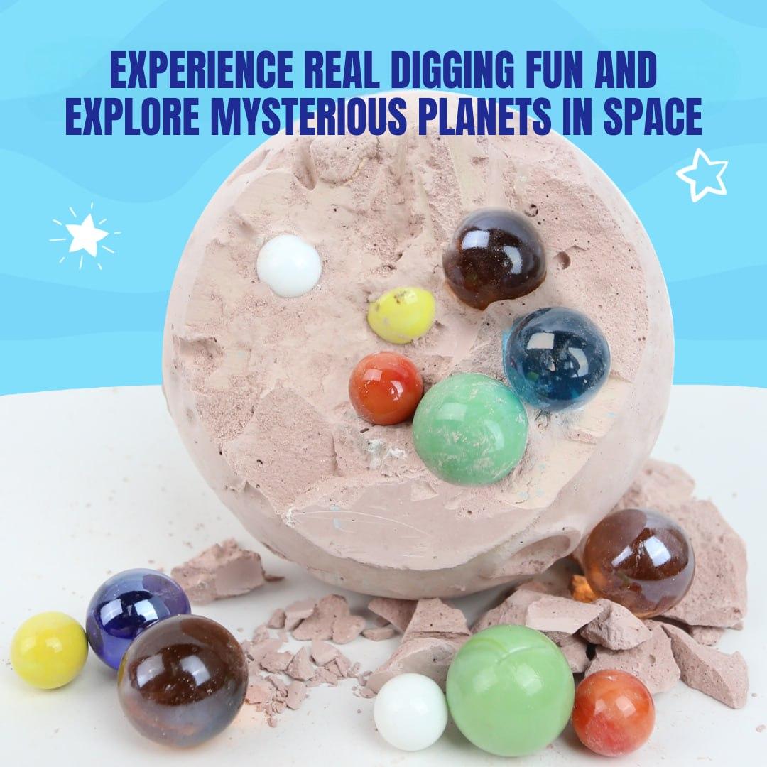 Excavate a moon-shaped block to reveal eight multicolored planet marbles, sparking interest in space and science.
