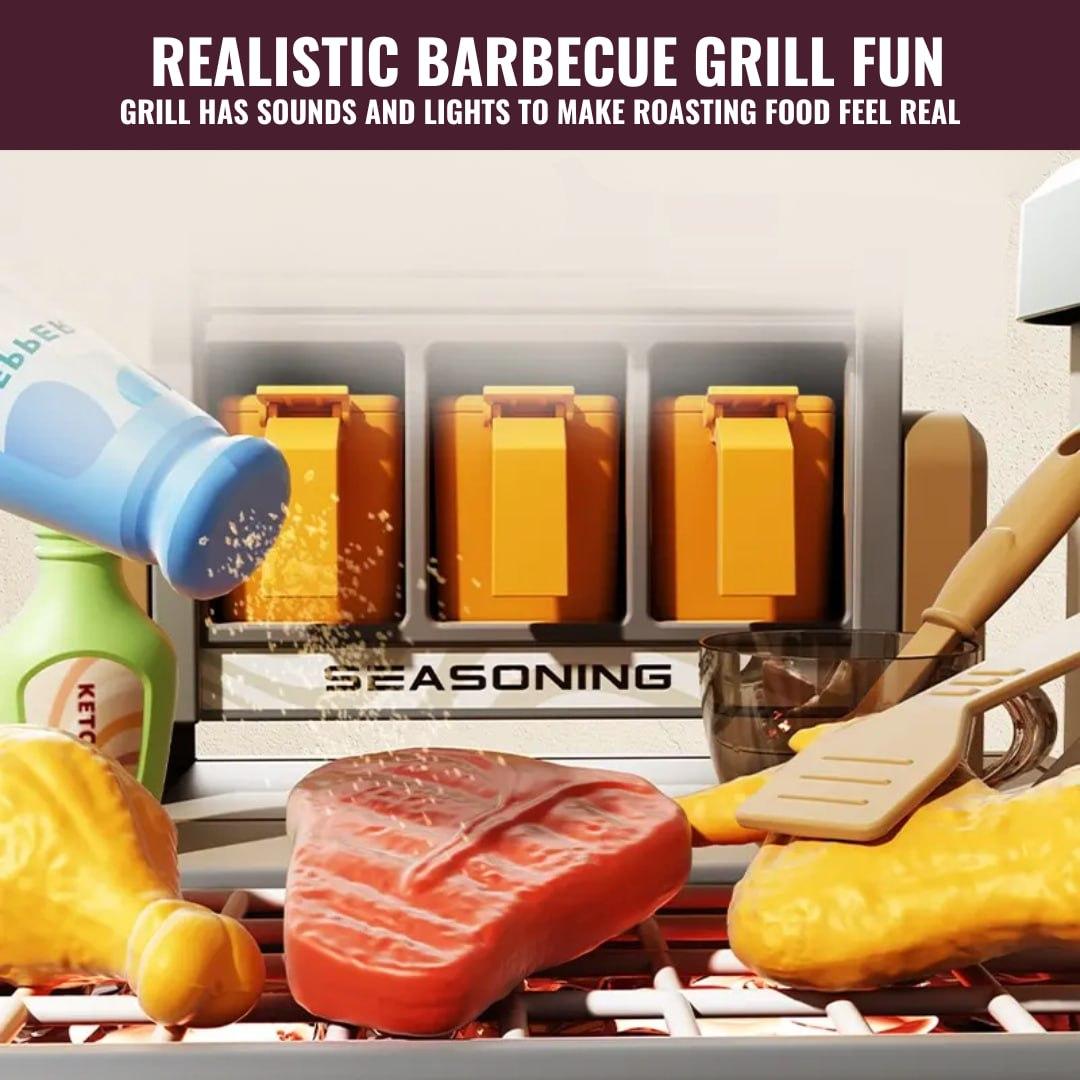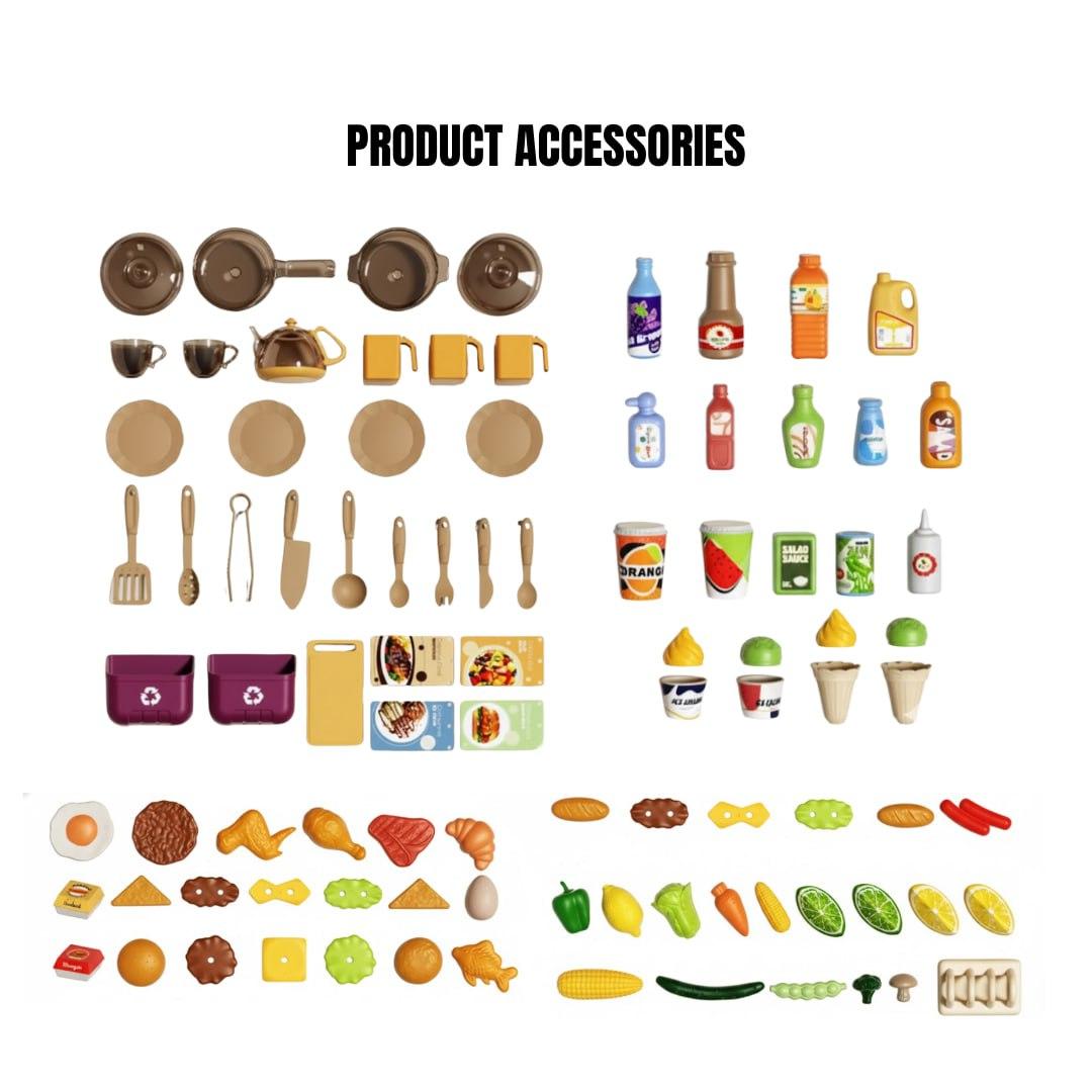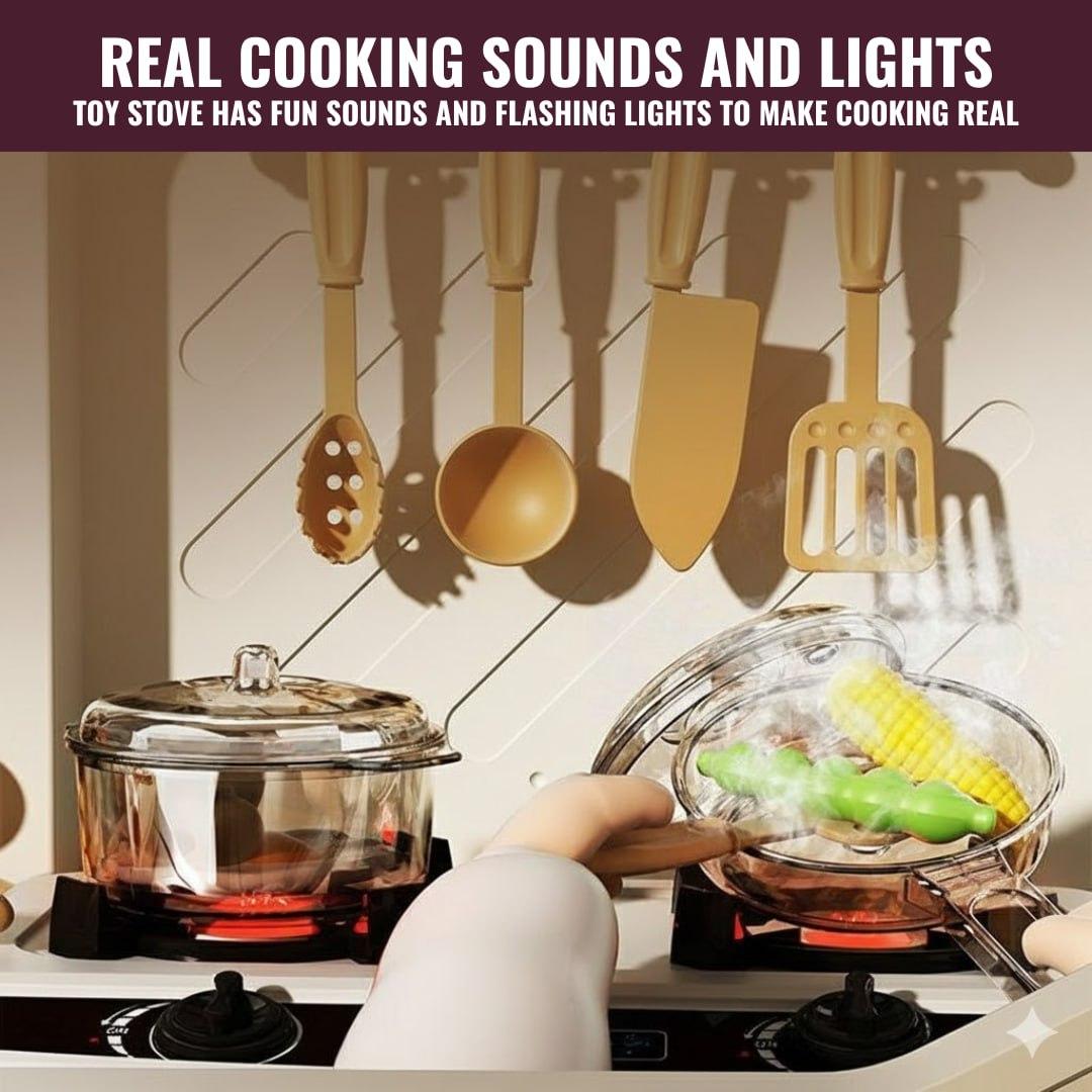 Comes with detailed accessories such as pots, pans, utensils, food items, seasoning bottles, and interactive features like lighting effects and turning knobs, encouraging imaginative role-play and skill-building through creative cooking scenarios.