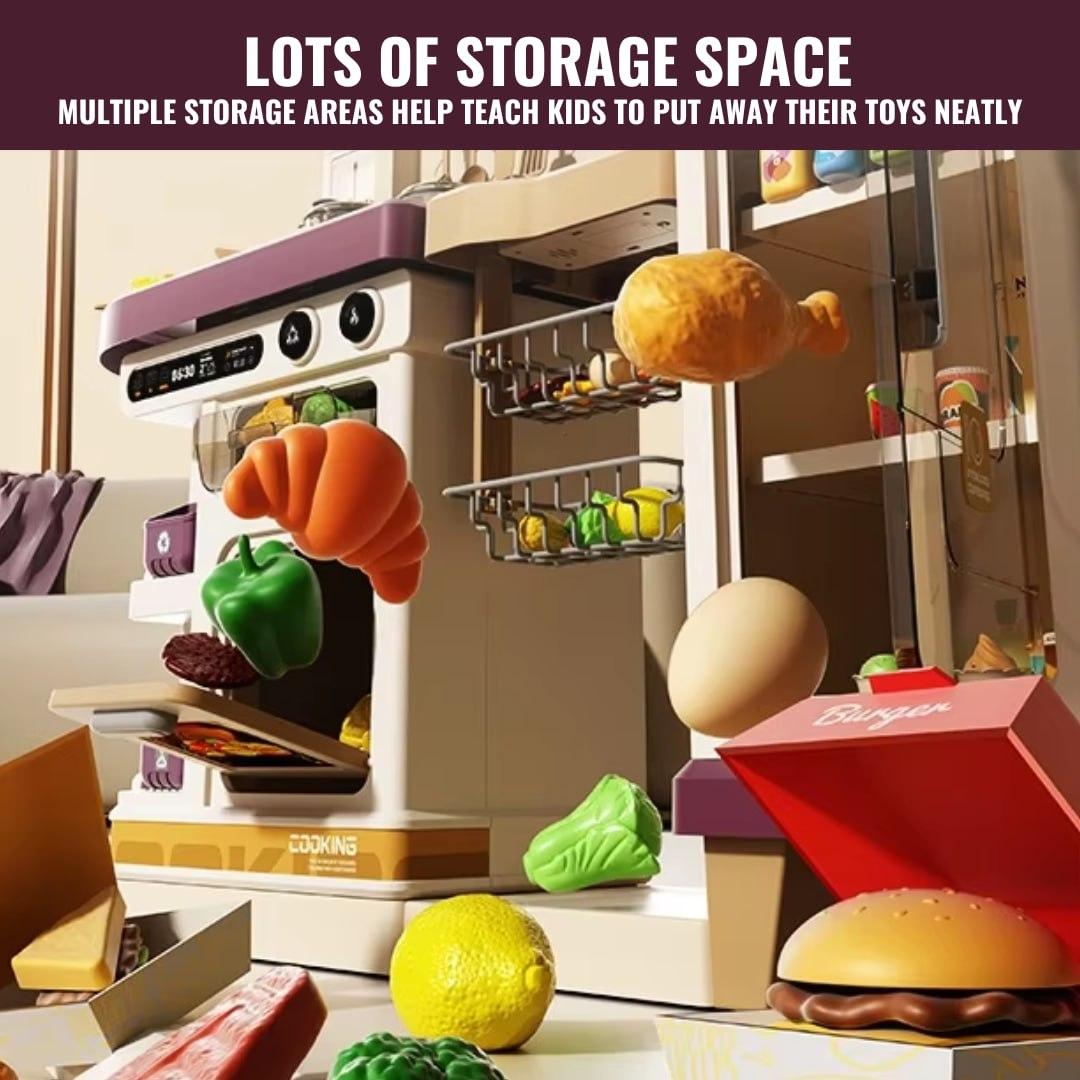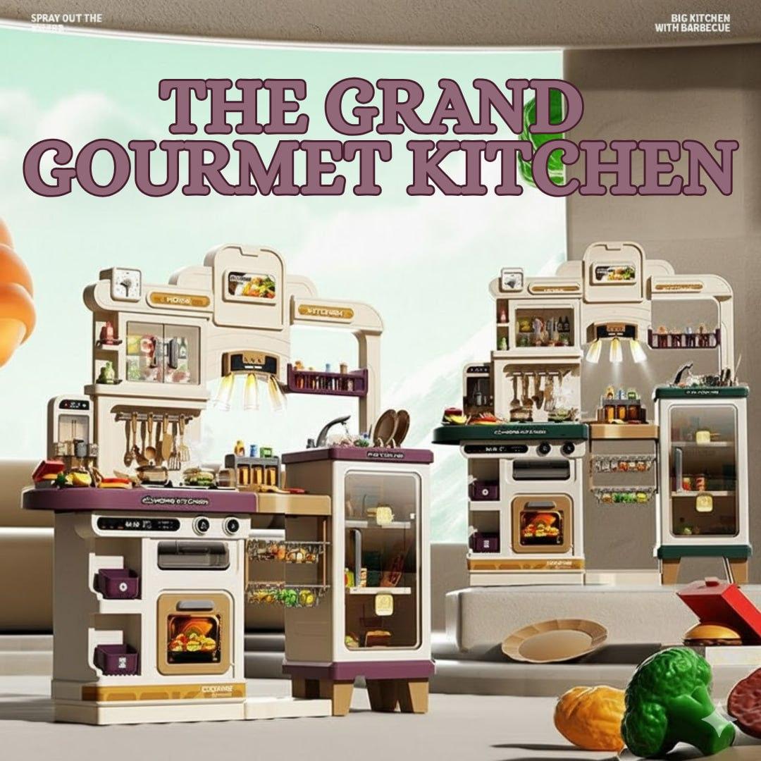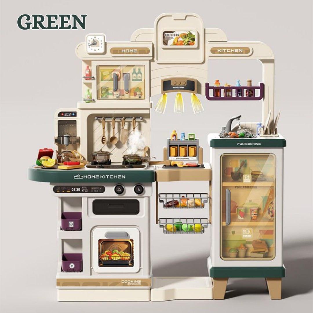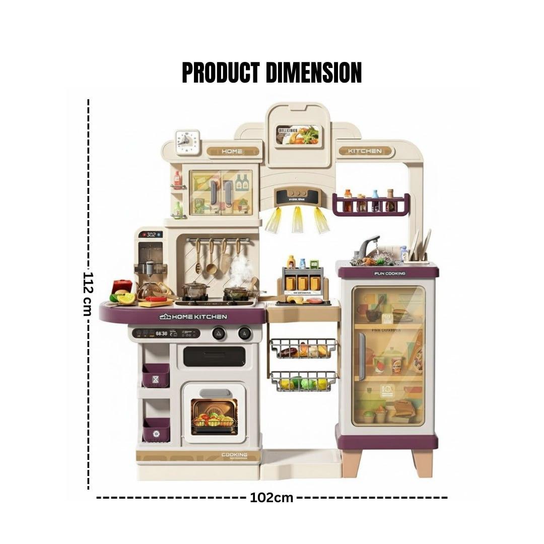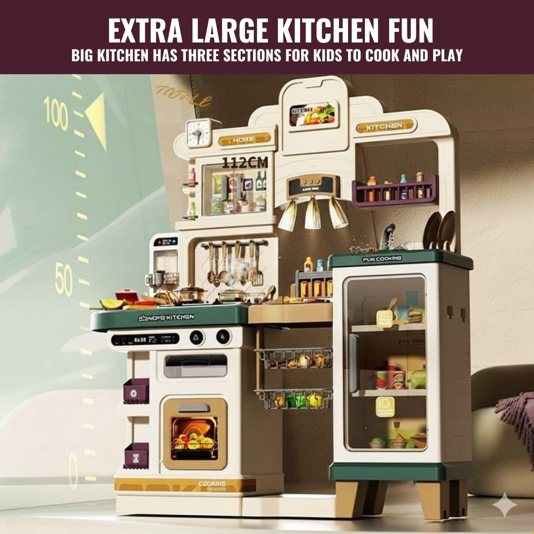 A deluxe multi-functional play kitchen designed with realistic appliances including stovetop, oven, sink, refrigerator, shelves, and hanging racks, giving kids an immersive cooking experience that feels just like a real...