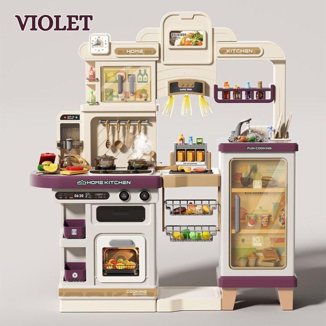 A deluxe multi-functional play kitchen designed with realistic appliances including stovetop, oven, sink, refrigerator, shelves, and hanging racks, giving kids an immersive cooking experience that feels just like a real gourmet kitchen.
