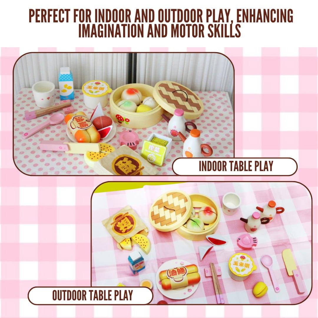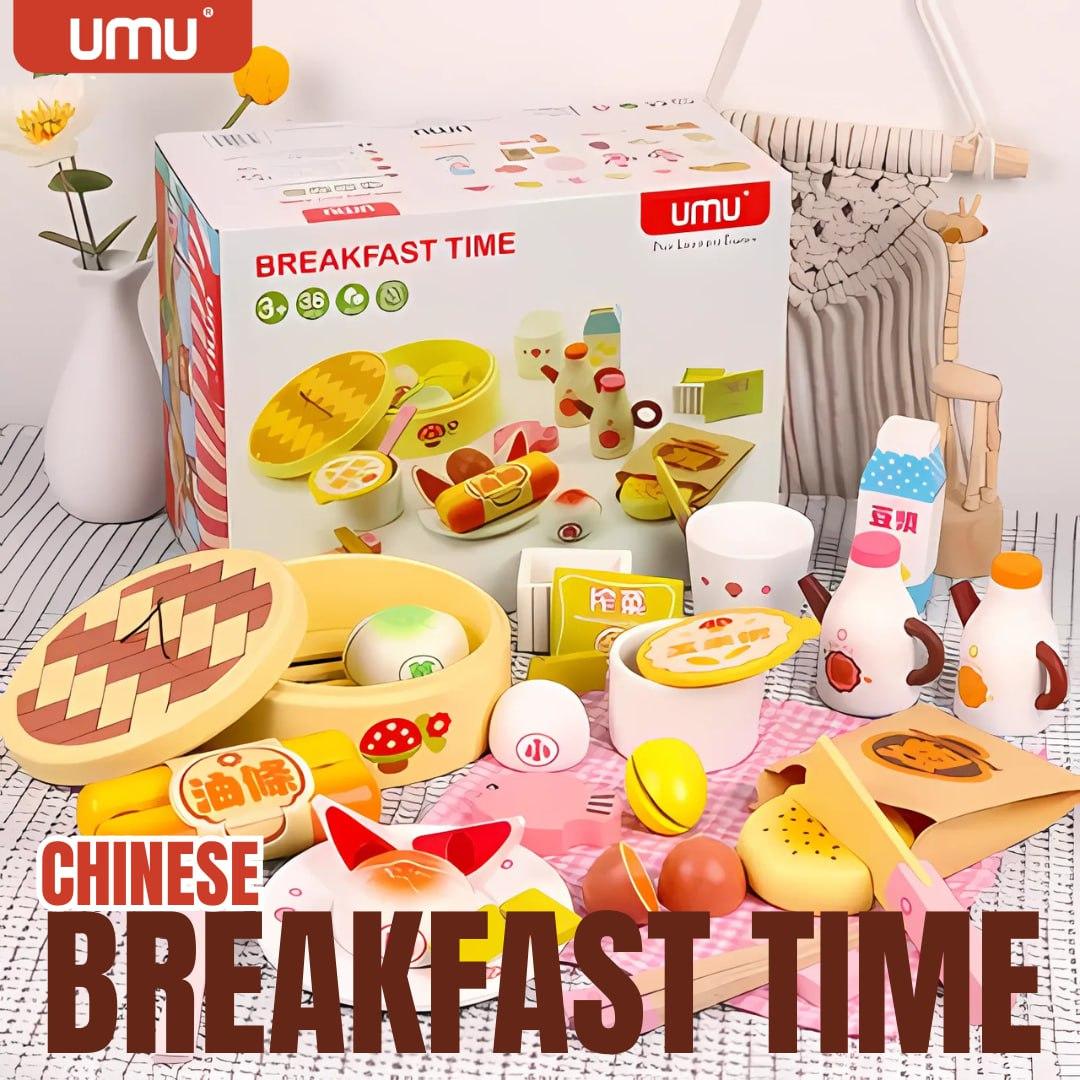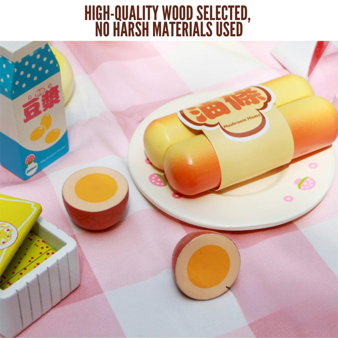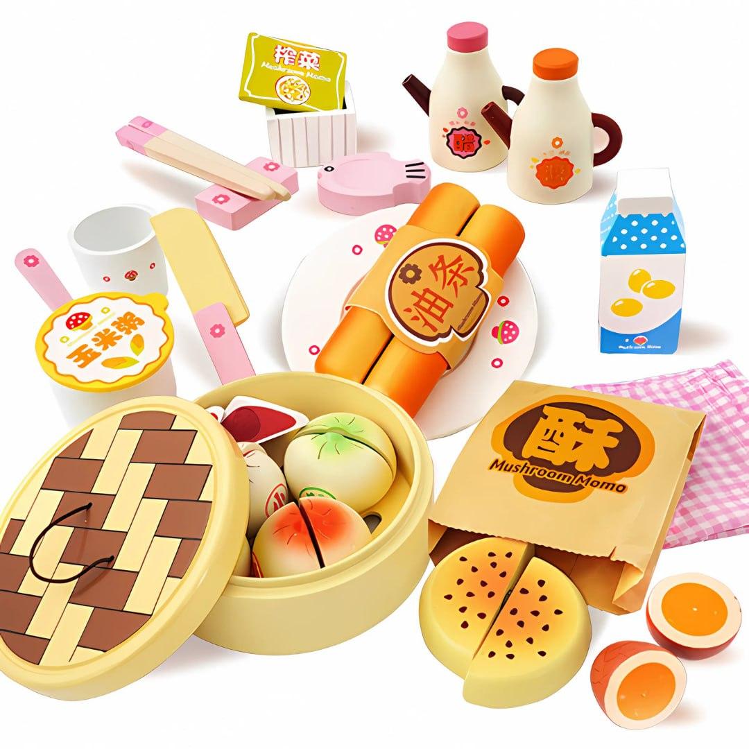 With its lively, intricate, and colorful wooden food components, this "Breakfast Time" toy set exposes kids to the idea of traditional Chinese breakfasts.