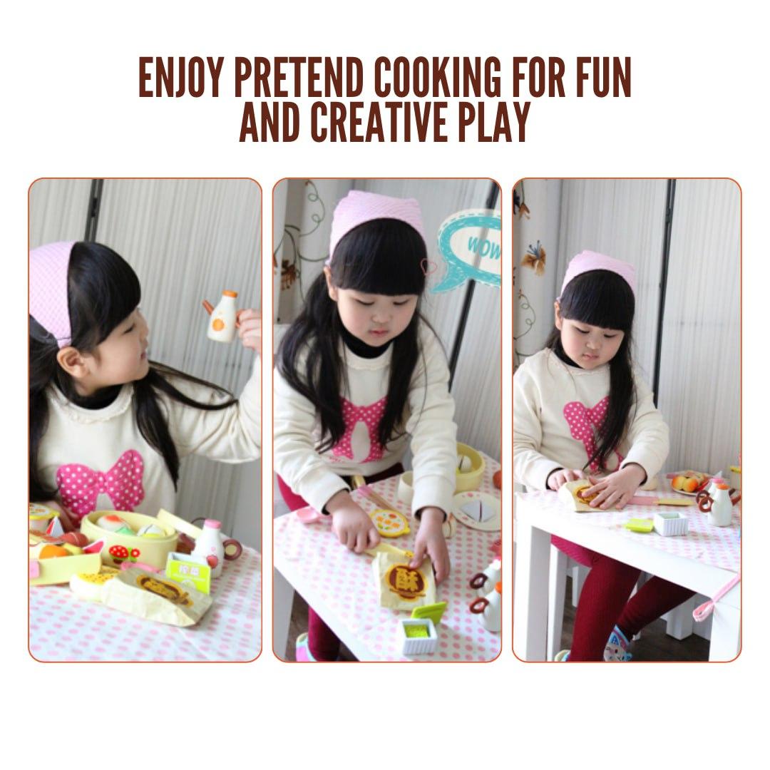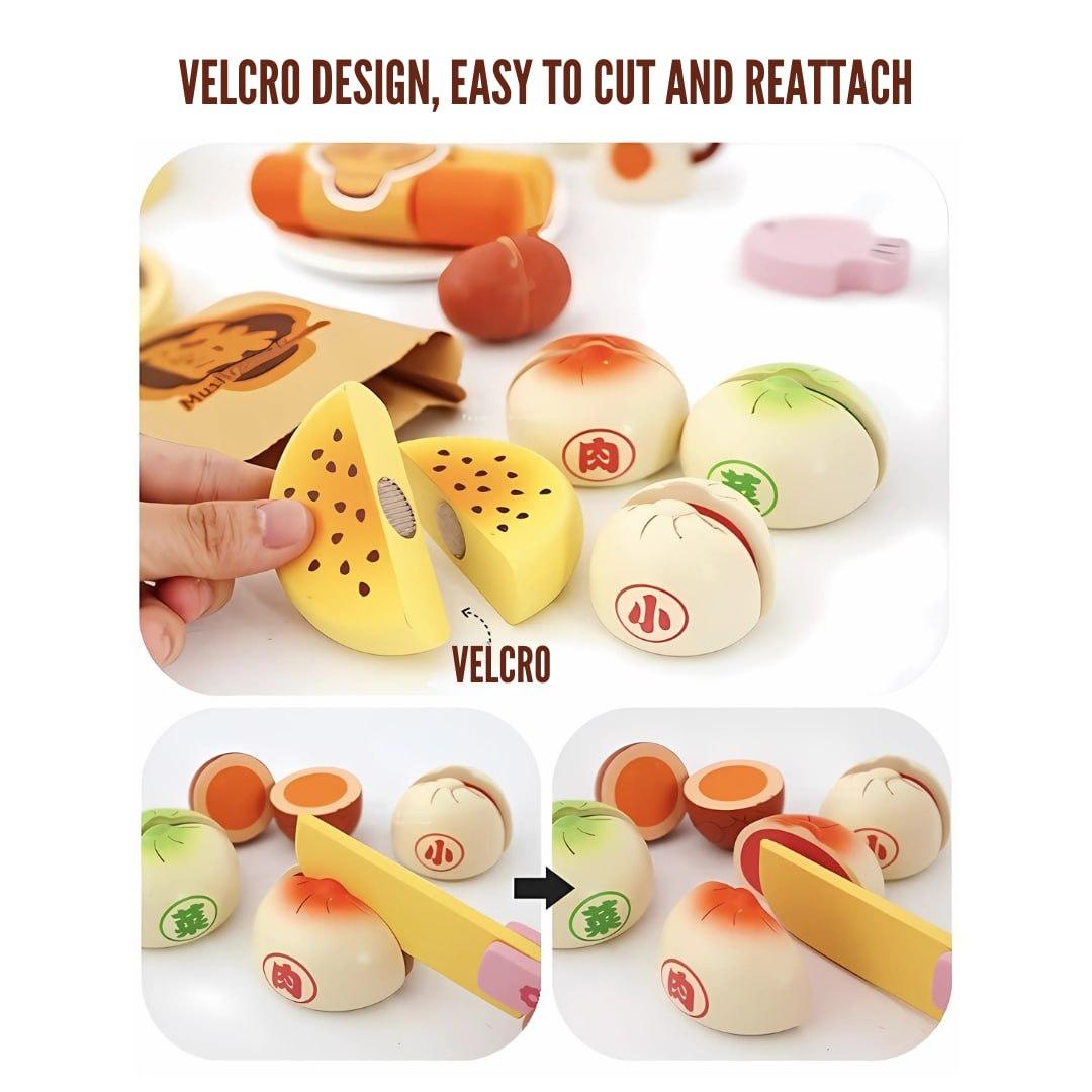 The play set's non-toxic paint and smooth edges, along with its sturdy and environmentally friendly wood construction, guarantee safety. Each component is expertly made to mimic actual foods, such as buns, eggs, dumplings, and beverages, guaranteeing long-term durability and offering a realistic and instructive experience.