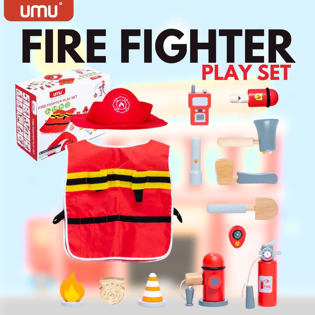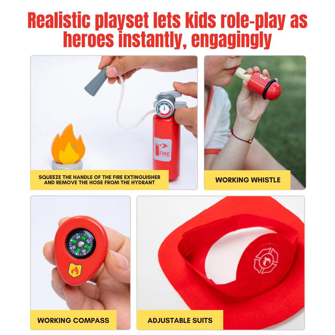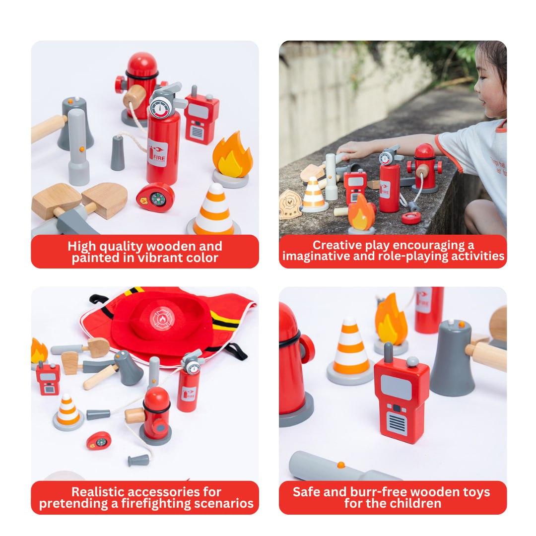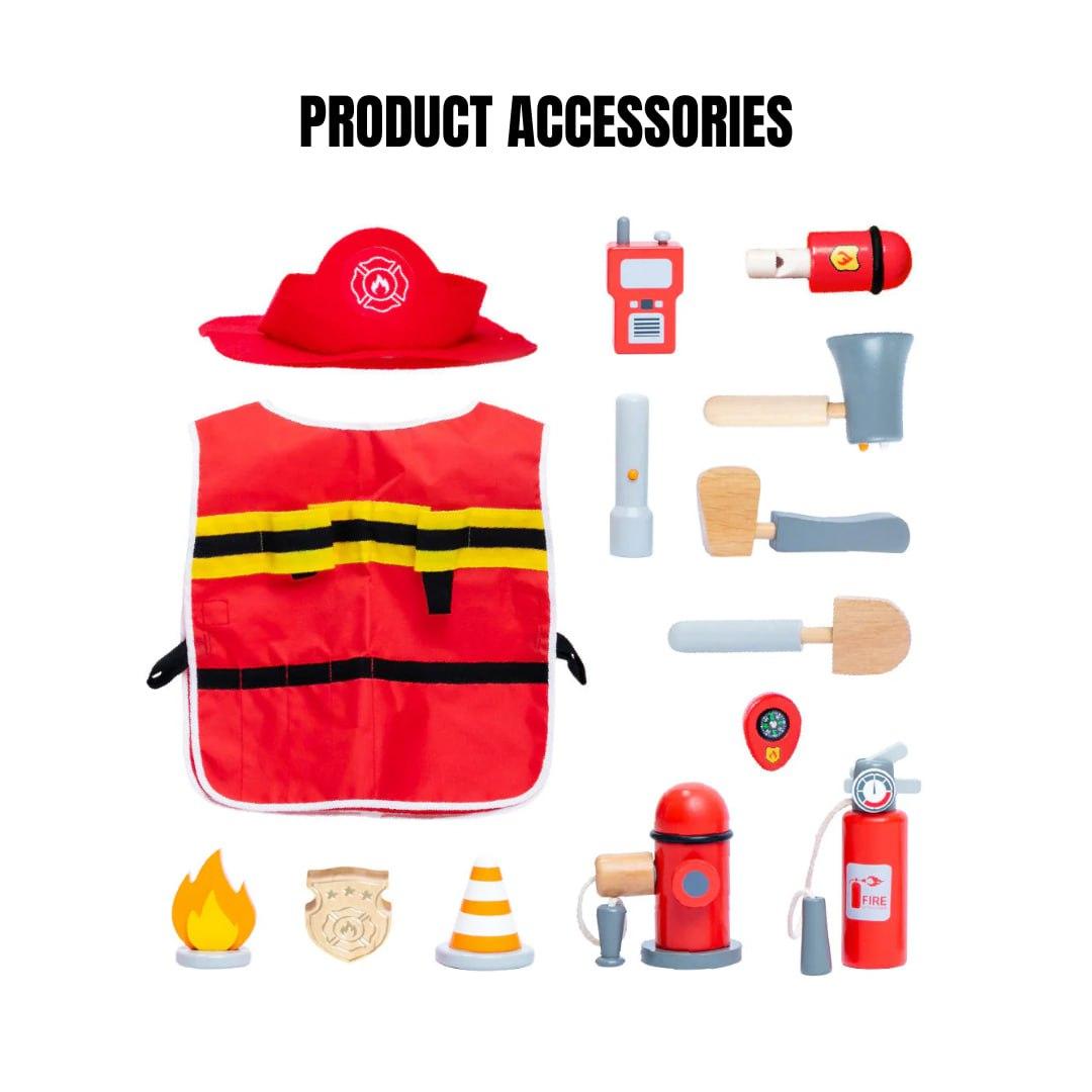 14-piece play set of realistic wooden firefighters. A fire extinguisher, a torch, a fire brigade emblem, a whistle, a cap, a firefighter outfit, a page, a hydrant, a safety cone, a radio, a shovel, an axe, and a fire are among the wooden firefighter tools on the set.