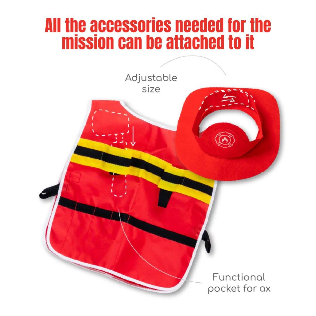 A whistle and a comp are included in the set. Even removing the hose from the hydrant and pressing the fire extinguisher's handle are options. All the required items can be worn, and the playset comes with a firefighter uniform that suits everyone, complete with an adjustable headgear.