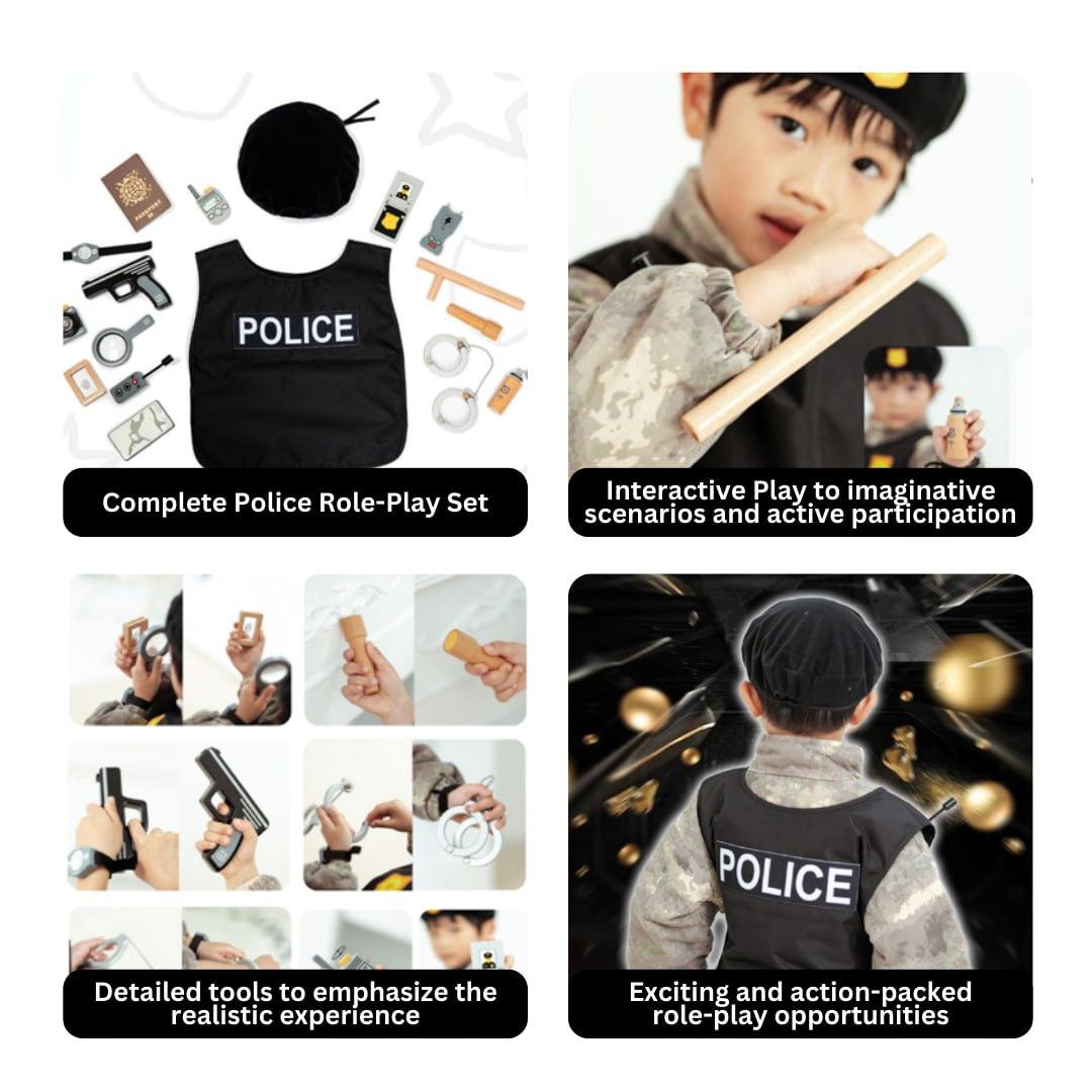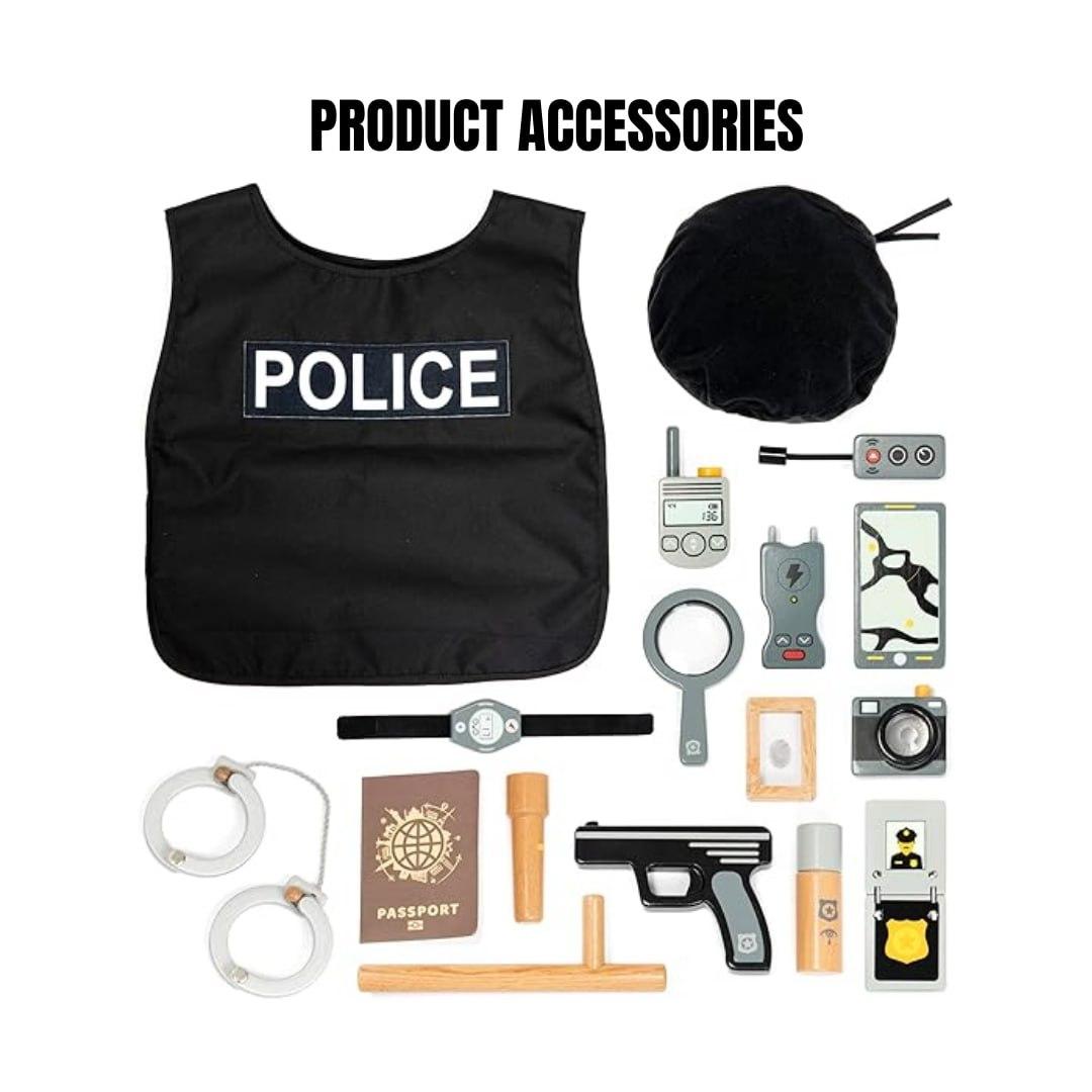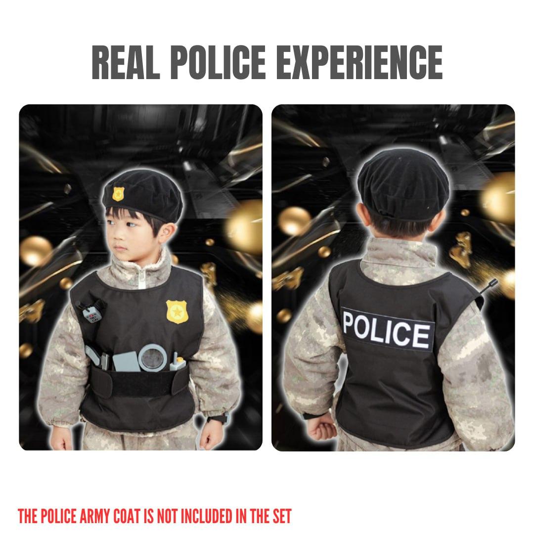 This police officer kids set includes a police vest, police cap, police card, handcuffs, watch, mobile phone, camera, walkie-talkie, baton, actual flashlight, and 17 other accessories that meet safety standards for your child. Children may fully immerse themselves in the dress-up game and truly play the part of a small police officer, which helps boost imagination and hands-on abilities.