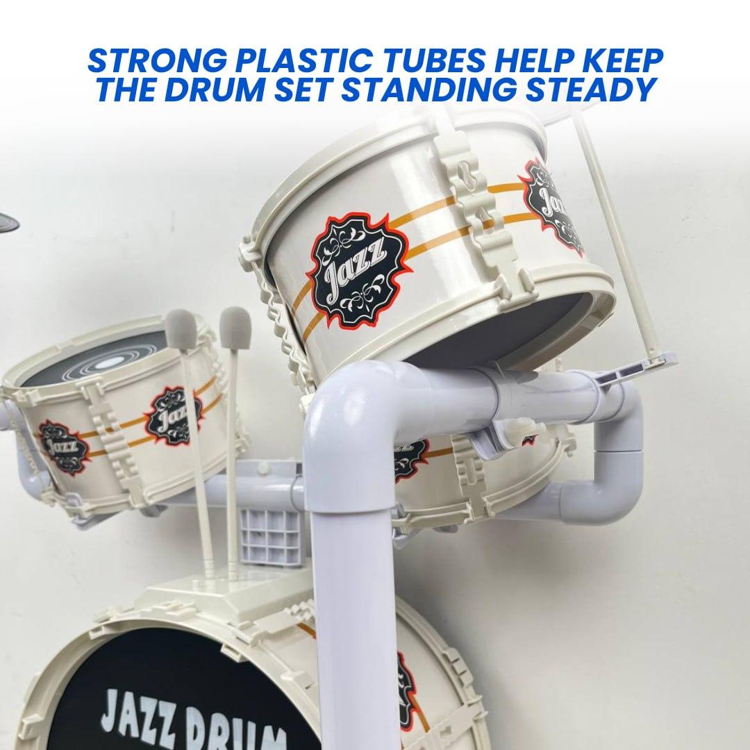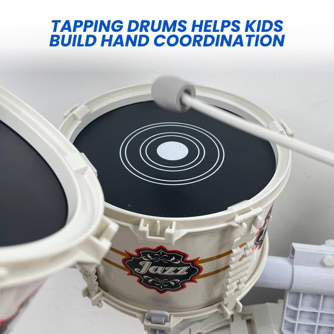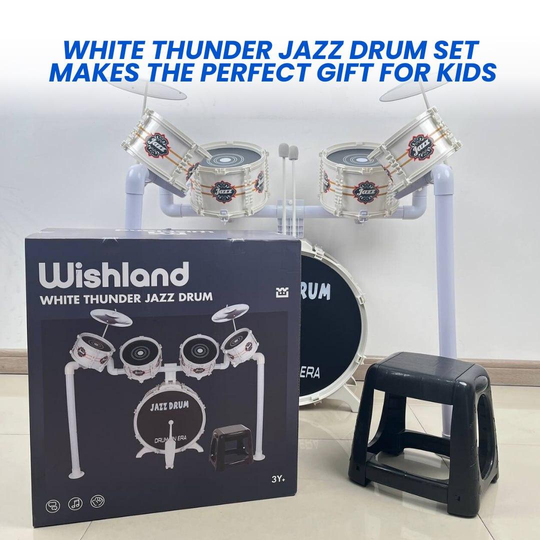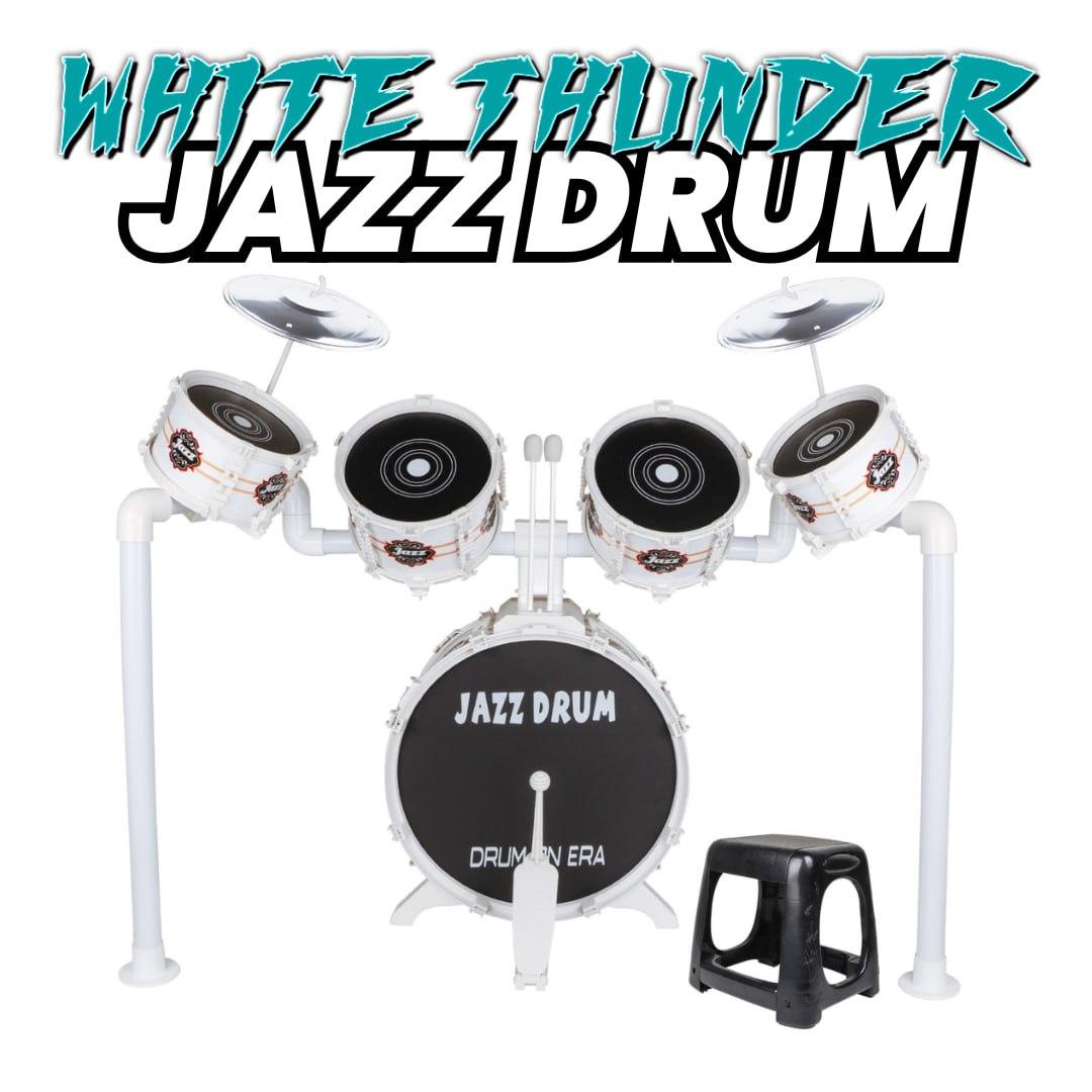 The White Thunder Jazz Drum Set adds vitality to playtime with strong style and realistic drum features, making it ideal for aspiring young drummers.