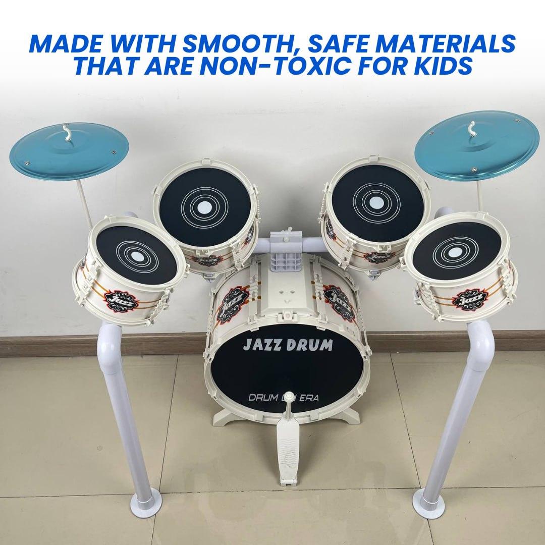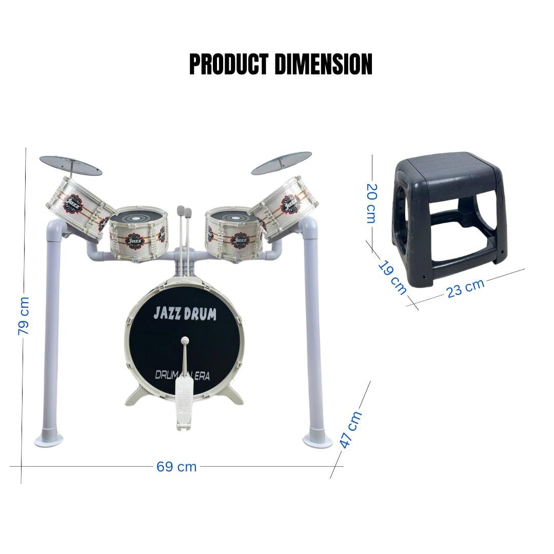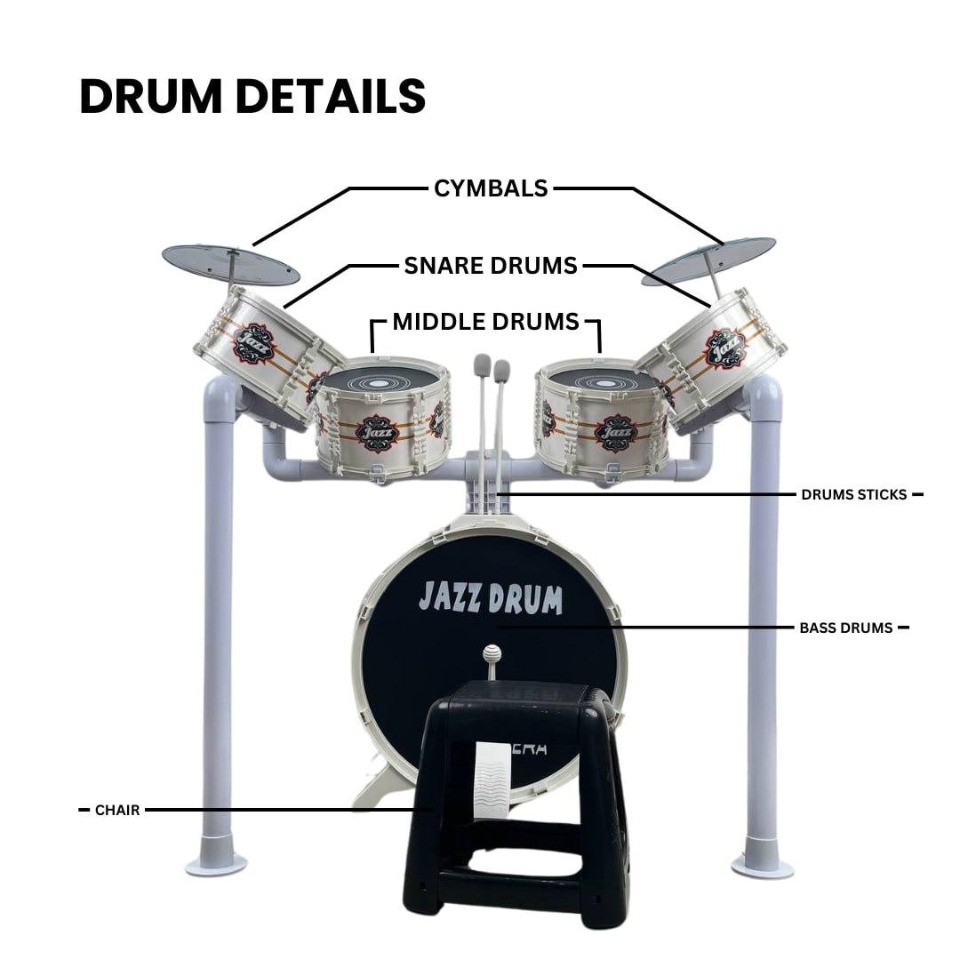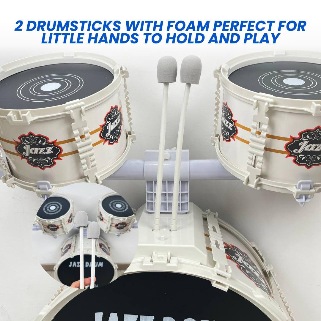 The White Thunder Jazz Drum Set adds vitality to playtime with strong style and realistic drum features, making it ideal for aspiring young drummers.