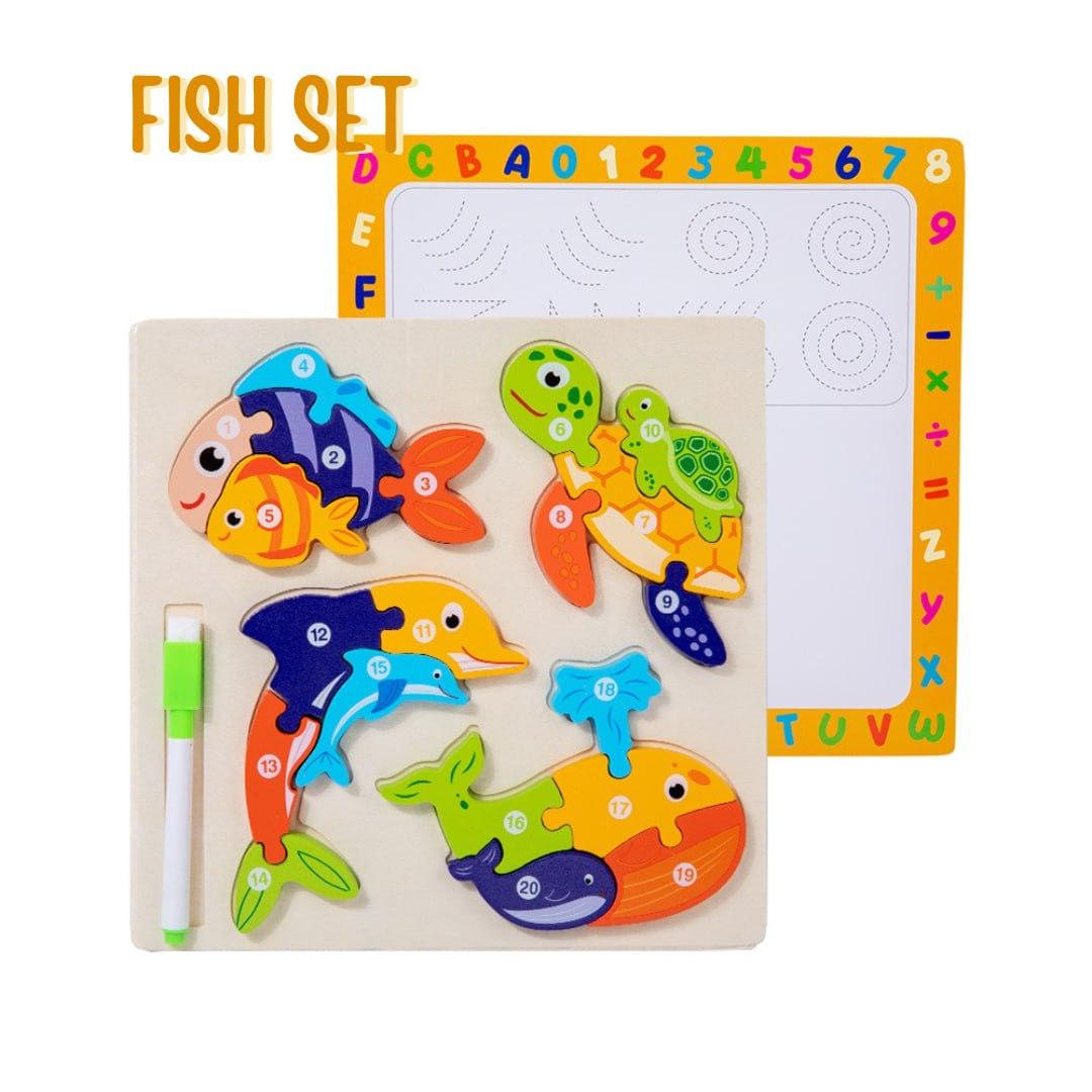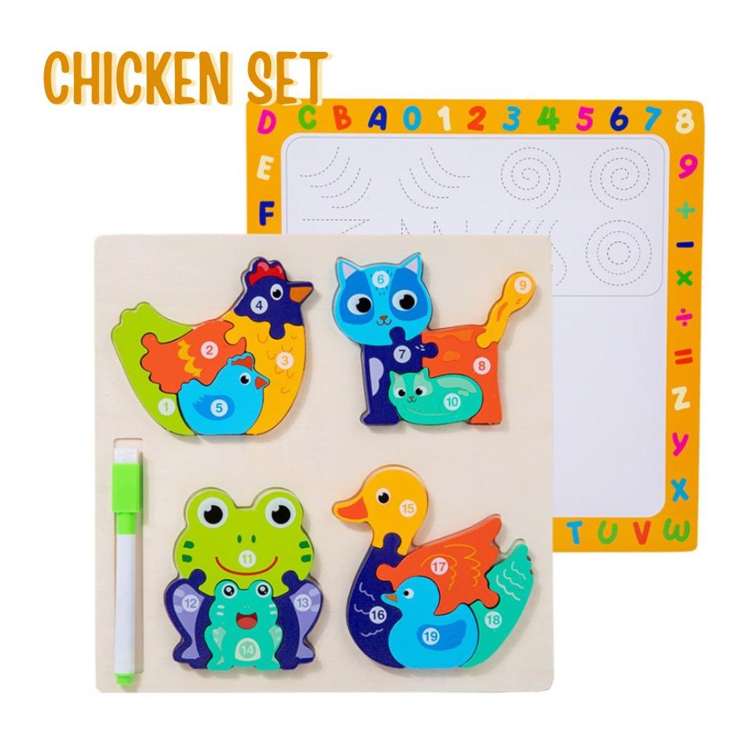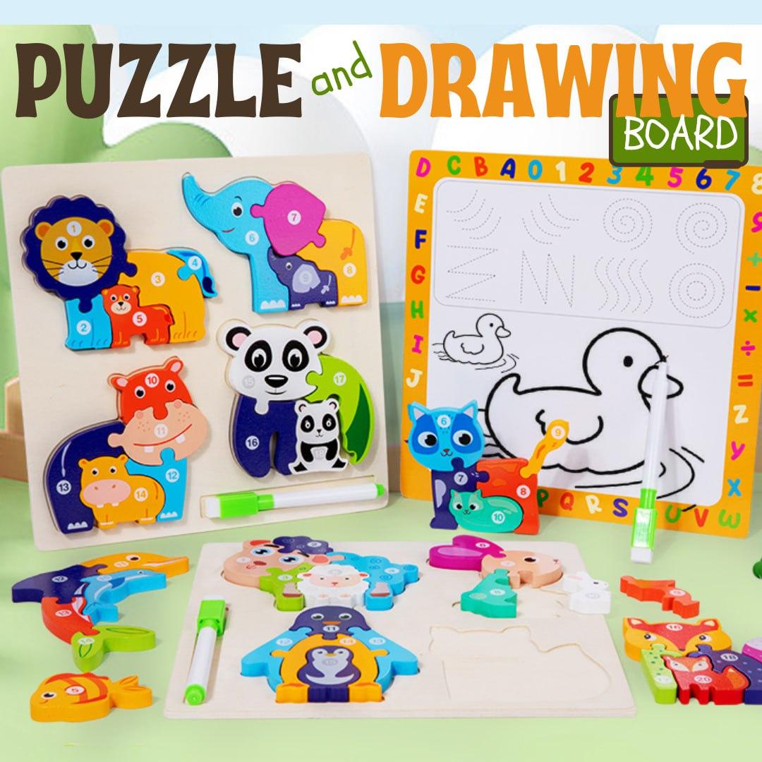 Our wooden puzzle, which combines a jigsaw puzzle with an erasable writing surface, is a wonderful educational tool. It has large puzzle pieces and an embedded puzzle board for easy construction. The reverse of the board is ideal for writing and drawing with the provided pen, and it is simply erased with the duster.