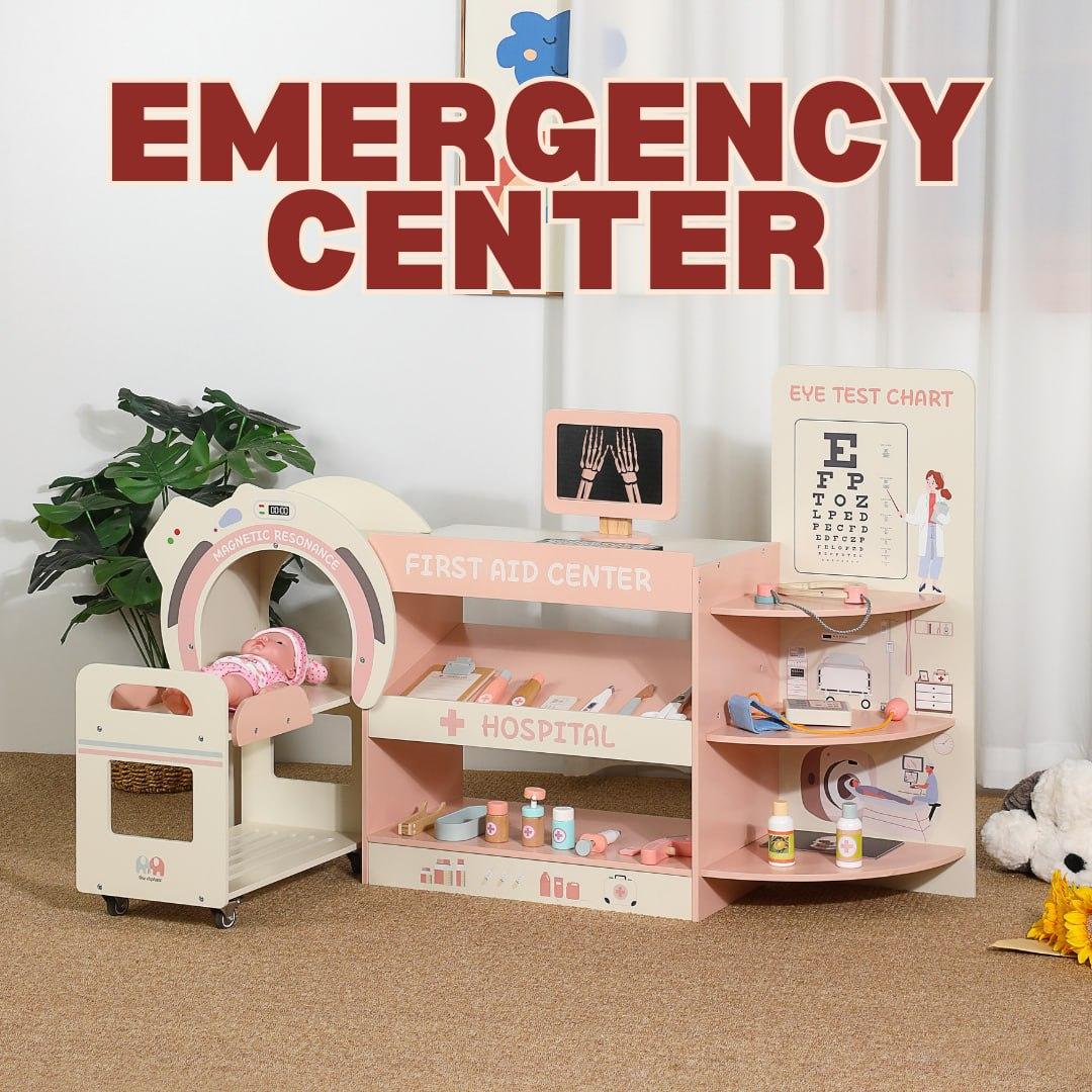 A comprehensive wooden emergency center with an MRI scanner, first aid station, eye exam chart, and other medical gear for immersive role-playing. Encourages imaginative play while teaching children about healthcare,...