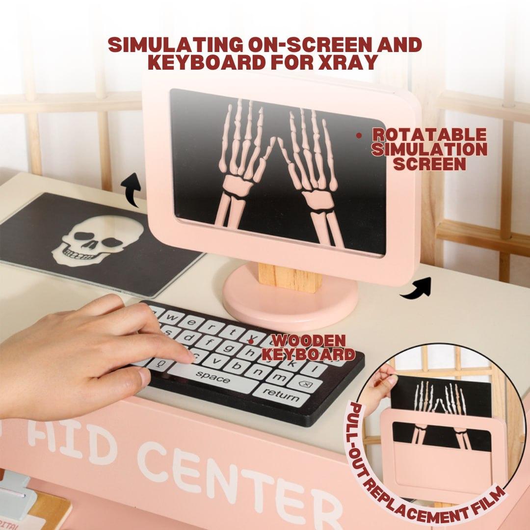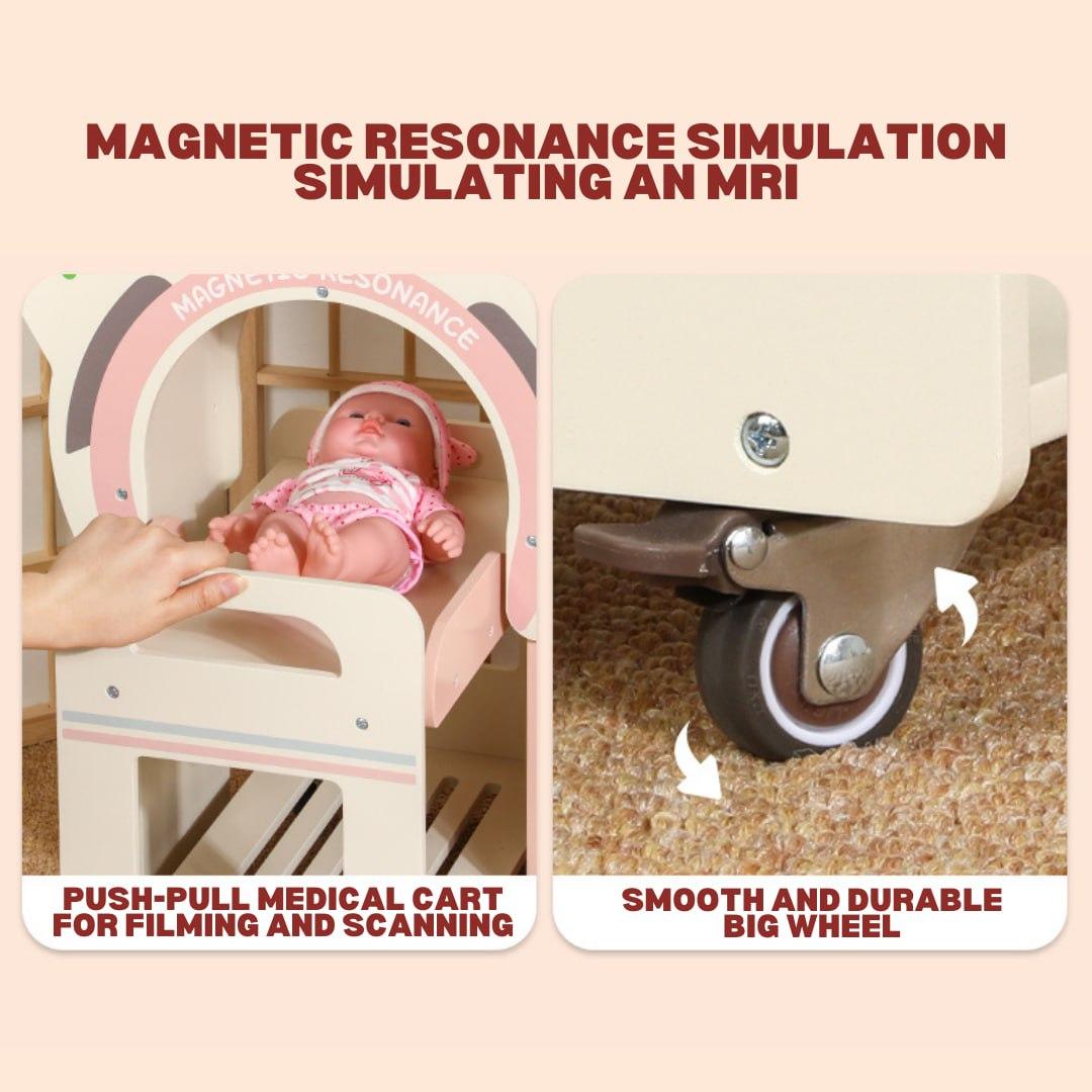 A comprehensive wooden emergency center with an MRI scanner, first aid station, eye exam chart, and other medical gear for immersive role-playing.