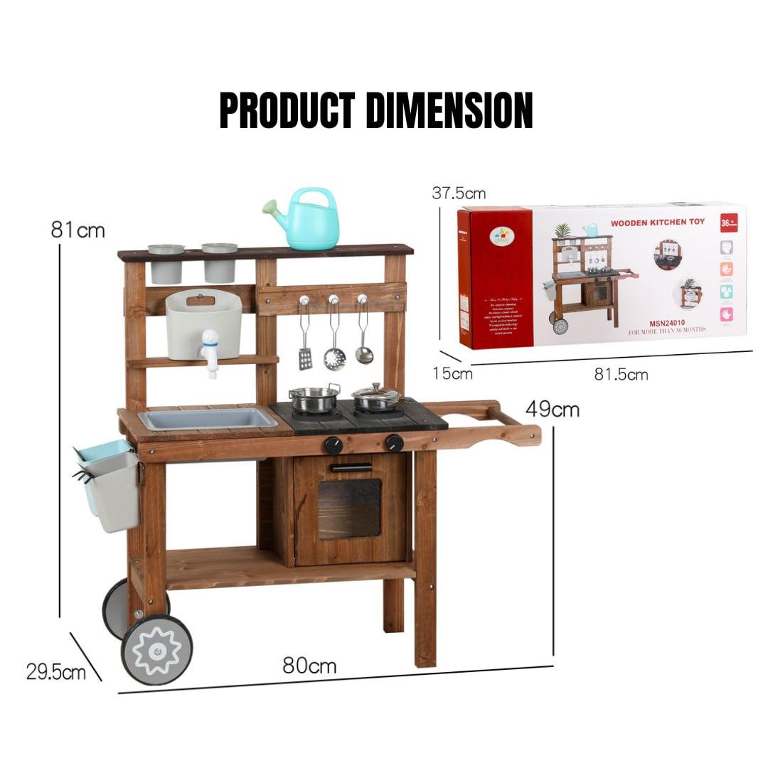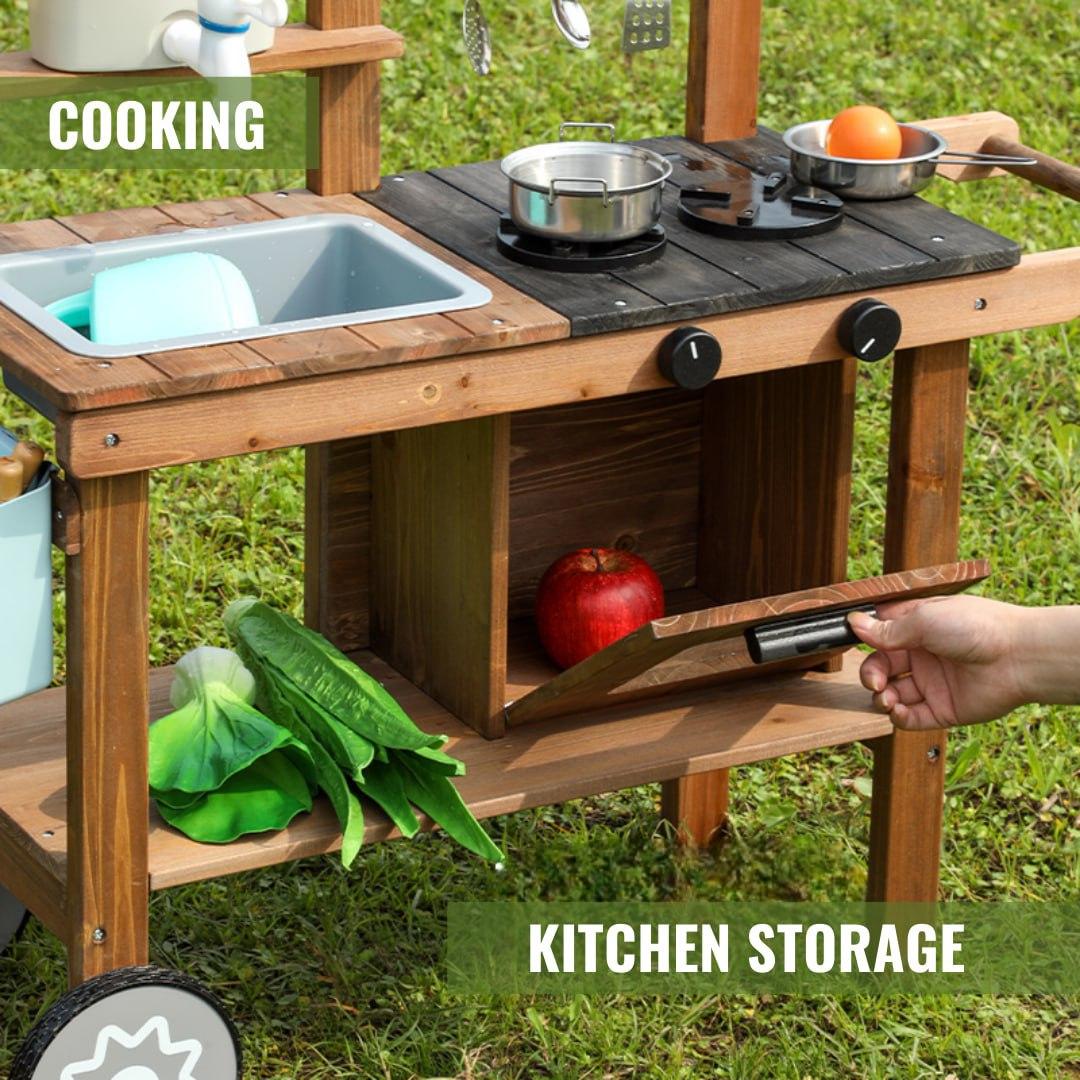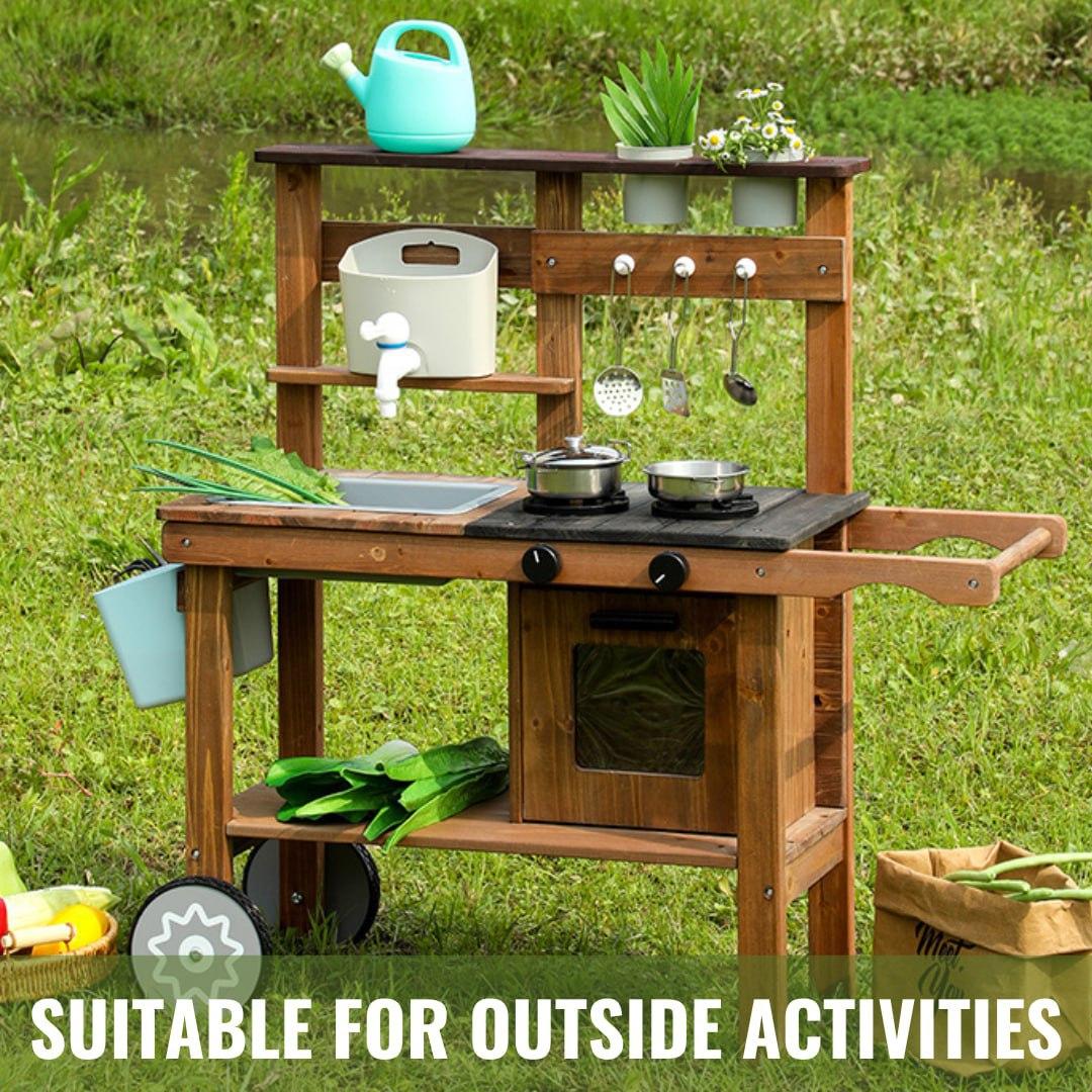 The outdoor mud kitchen is made of high-quality timber materials and has smooth edges with no burrs, making it suitable for children to use. Additionally, wooden play kitchens are more sturdy and long-lasting.