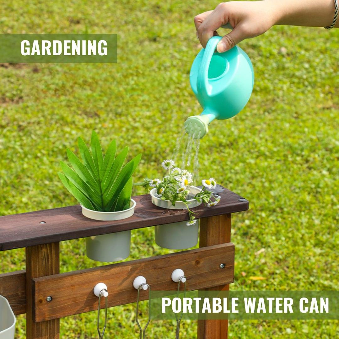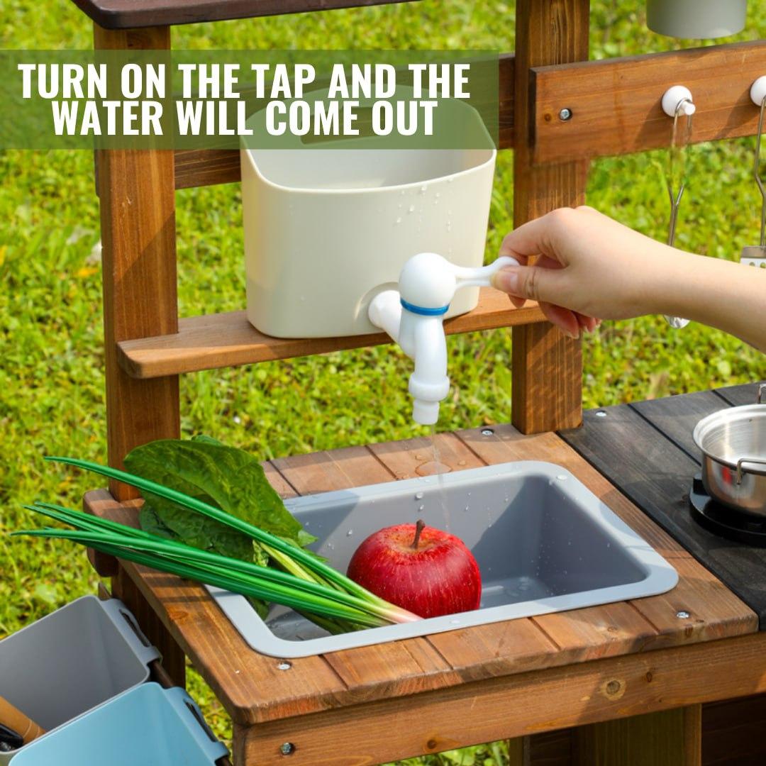 A 'clicking' sound is produced by this kids kitchen playset when the kid turns the knobs, adding to the fun of the game. For a true stream of water, kids can also fill the water tank and switch on the faucet. Additionally, you can fill our sprinkler with water to irrigate plants. Children will have a more authentic experience with this outdoor mud kitchen, which they can use indoors or roll out to play with their friends outside.